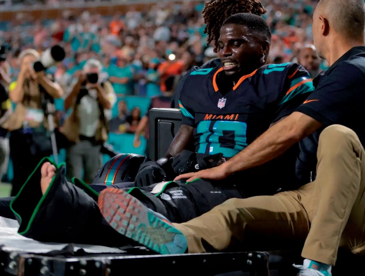 retirado en carrito entre aplausos y vítores de los aficionados. Posteriormente, fue trasladado a un hospital cercano para estudios adicionales. Pese a la gravedad del diagnóstico, Hill mostró una actitud positiva y alentó a sus compañeros a enfocarse en lograr la victoria, que finalmente llegó con un 27-21 sobre los Jets, rompiendo una racha negativa de cuatro derrotas para Miami.