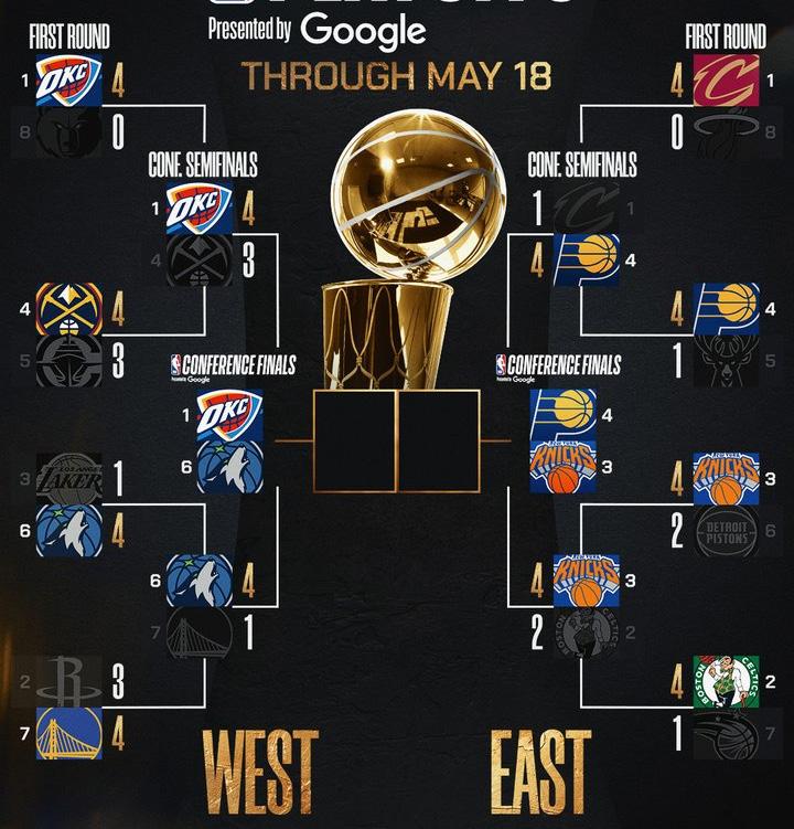 Con solo cuatro equipos en pie, la emoción continúa. Las Finales del Oeste entre Minnesota (6°) y Oklahoma City (1°) inician el martes, mientras que en el Este, Indiana (4°) y Nueva York (3°) arrancan serie el miércoles.