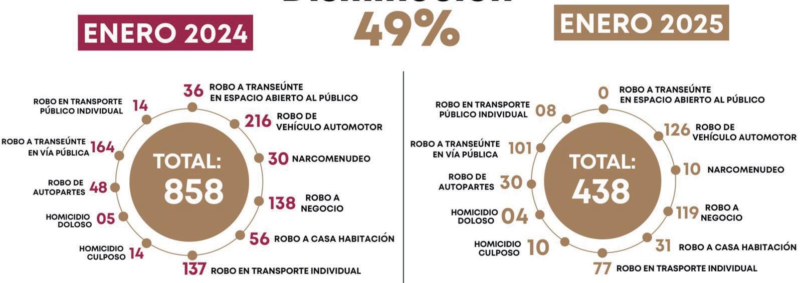 boración de la ciudadanía. Pese a los avances, las autoridades continúan reforzando estrategias para garantizar mayor seguridad en la zona. Durante la Mesa de Coordinación para la Construcción de la Paz, la Fiscalía Especializada en Investigación del Delito de Robo de Vehículo informó que en febrero se redujo un 45.4% el inicio de carpetas de investigación por este delito, consolidando una tendencia a la baja en la incidencia delictiva.