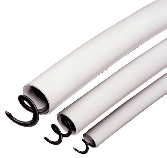 The spiral lines work in traction (the spiral tends to open when rolling and pushes the transfer unit and the motor), so PVC pipes are ideal for their strength and lightness. At the beginning of the line, curves with a perfect radius can be used to minimise spiral rubbing and tube wear. The line tube diameters we work with are Ø55, Ø75 and Ø90 mm, and are made of an exceptionally abrasion-resistant material with UV protection.