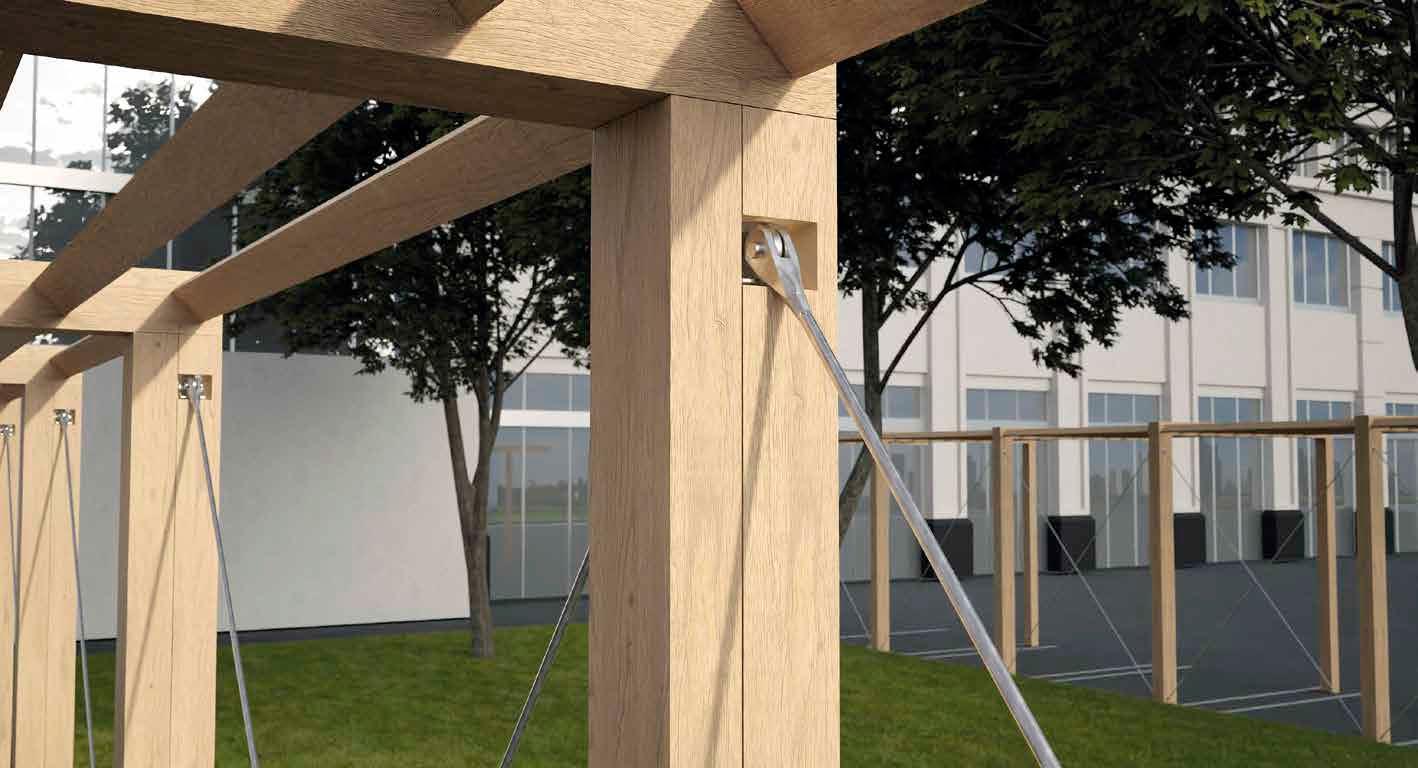 Resistente a forze in tutte le direzioni grazie al serraggio degli elementi tramite barra passante Può essere posato su qualsiasi superficie in legno e fissato a qualsiasi supporto tramite un bullone