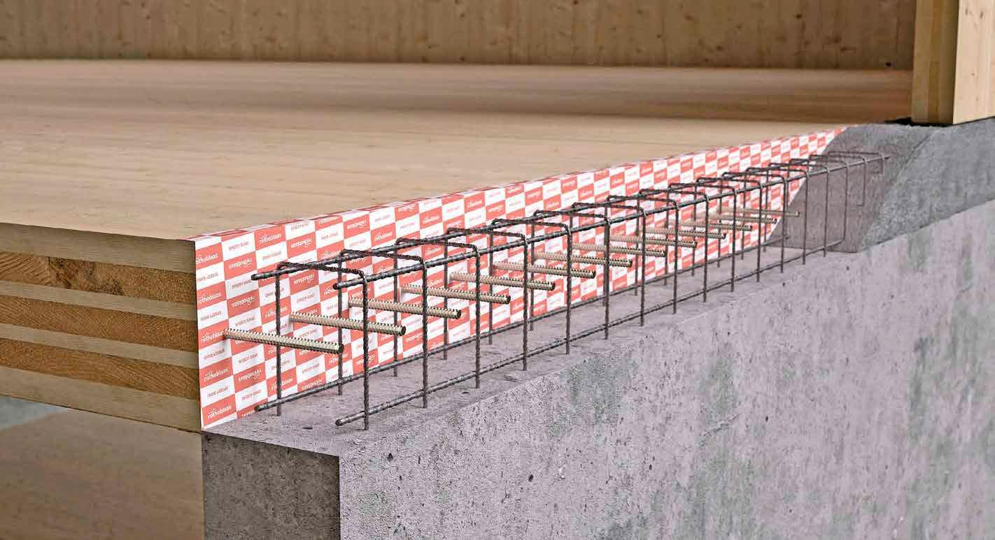 La prefabbricazione del calcestruzzo si sposa con quella del legno: le armature di ripresa inserite nel getto in calcestruzzo accolgono i connettori per legno tutto filetto; il getto integrativo eseguito dopo la posa dei componenti in legno completa la connessione