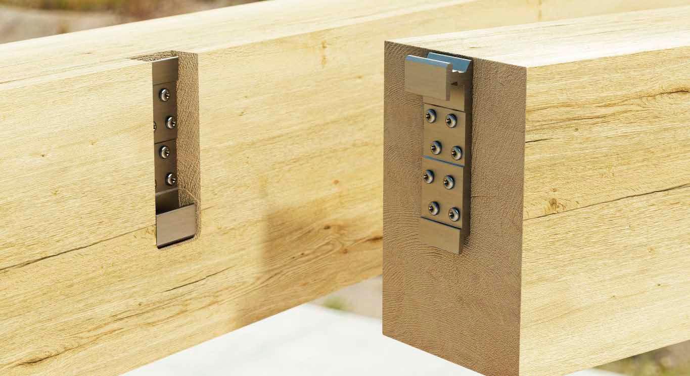 Uniones ocultas para vigas y pilares en configuración madera-madera, madera-acero o madera-hormigón, adecuadas para estructuras híbridas, situaciones no estándares o necesidades especiales�