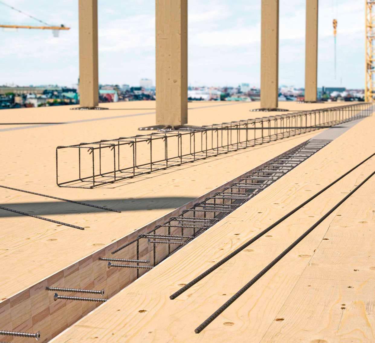 Die Vorfertigung von Beton und Holz wird kombiniert: Die in den Betonguss eingebrachten Bewehrungsanschlüsse nehmen die Vollgewindeverbinder für Holz auf, und die zusätzliche Schüttung nach dem Verlegen der Bauteile aus Holz vervollständigt die Verbindung