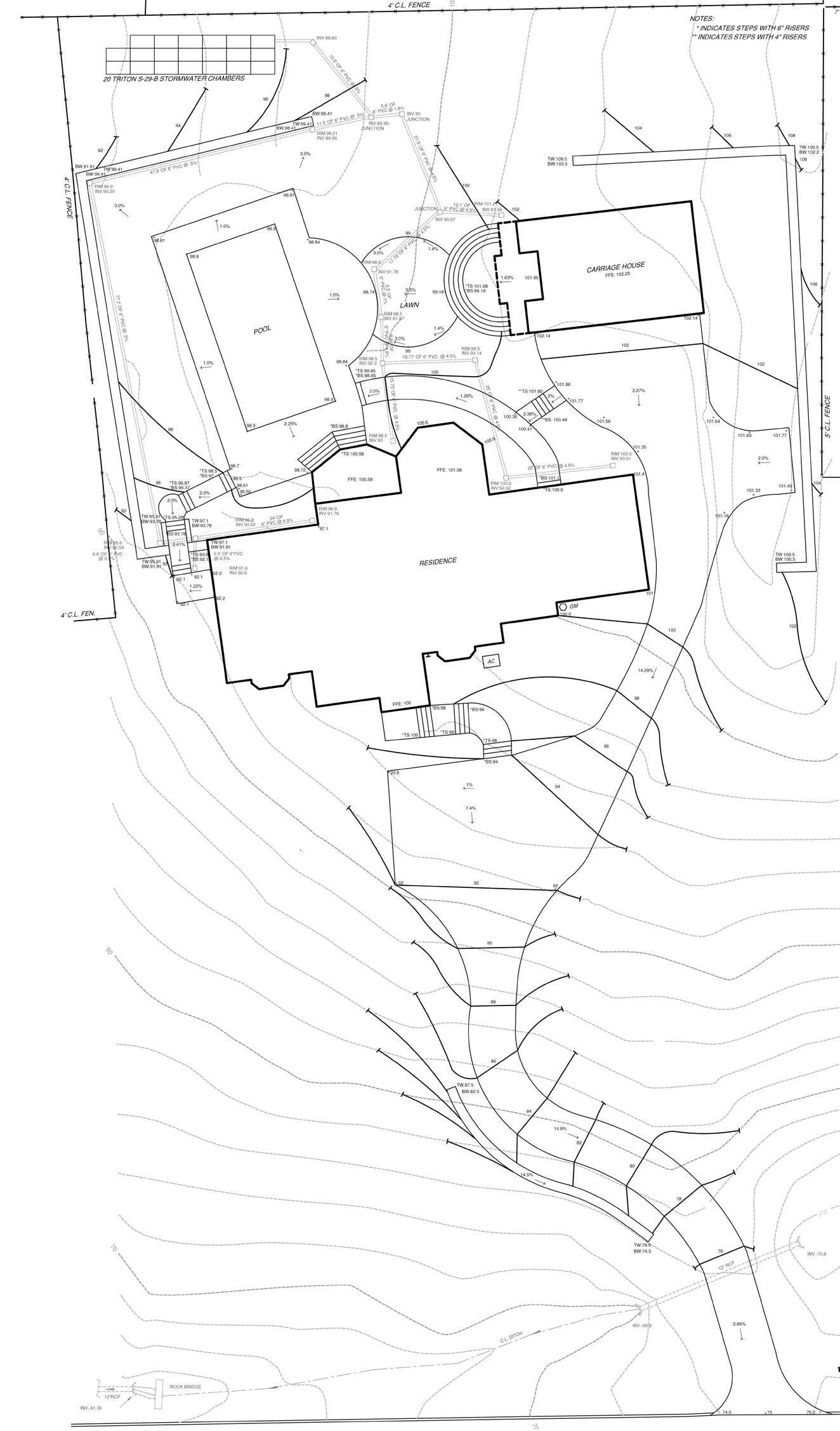 Situated on a steep hill, the Leber Residence presents multiple grading challenges, including a steep entrance, necessary retaining walls, and drainage issues on the Ww of the property. Thus, a detailed grading plan is necessary to show the various slopes, spot elevations, walls, steps, pipes, and drain locations.