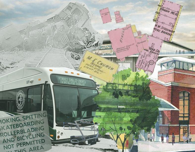Both of these collages were created to depict how the rich history of Athens could be combined with its diverse contemporary characterisitics to create places where all people belong regardless of age or background. The collage to the left focuses on the East Athens neighborhood and my plans for Oak Street Depot: A Preservation Community. The collage above was for a different project focusing on the Athens Multimodal Transportation Center downtown and the plans for the Classic Center Arena, expected to open in 2024.