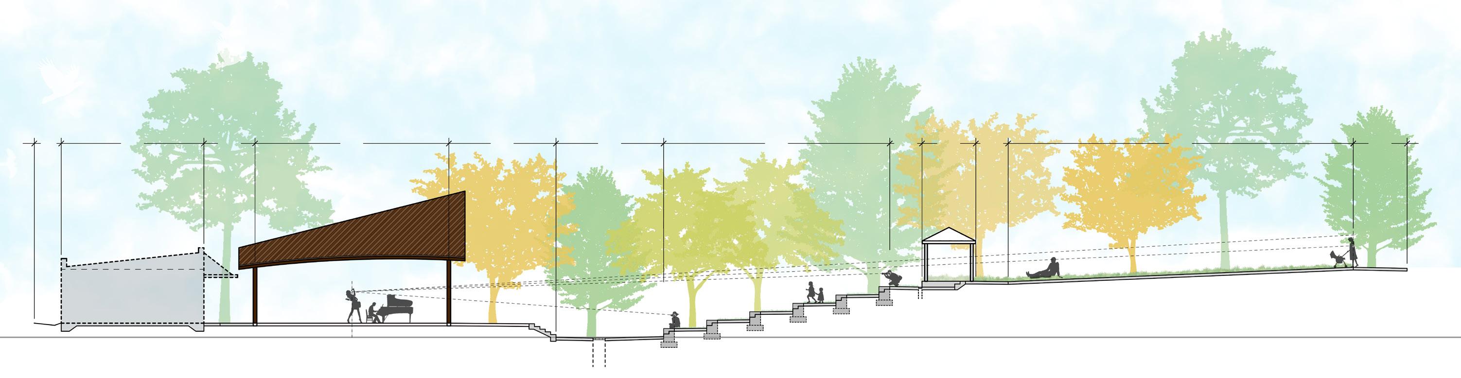 Cutting through the central axis of the amphitheater, this section shows the thoughtful design at the core of the Rev. Pearly Brown Music Park. The seating areas have been intentionally spaced and sloped to allow a clear line of sight to the stage, allowing visitors ample opportunities and places to actively enjoy and engage with the performances.Furthermore, the amphitheater has been oriented so that the sun will not be in the audiences’, nor the performers’, eyes during peak performance times. The amphitheater has also been designed so that the area can be actively used during the day as a park rather than solely operating as an event venue.