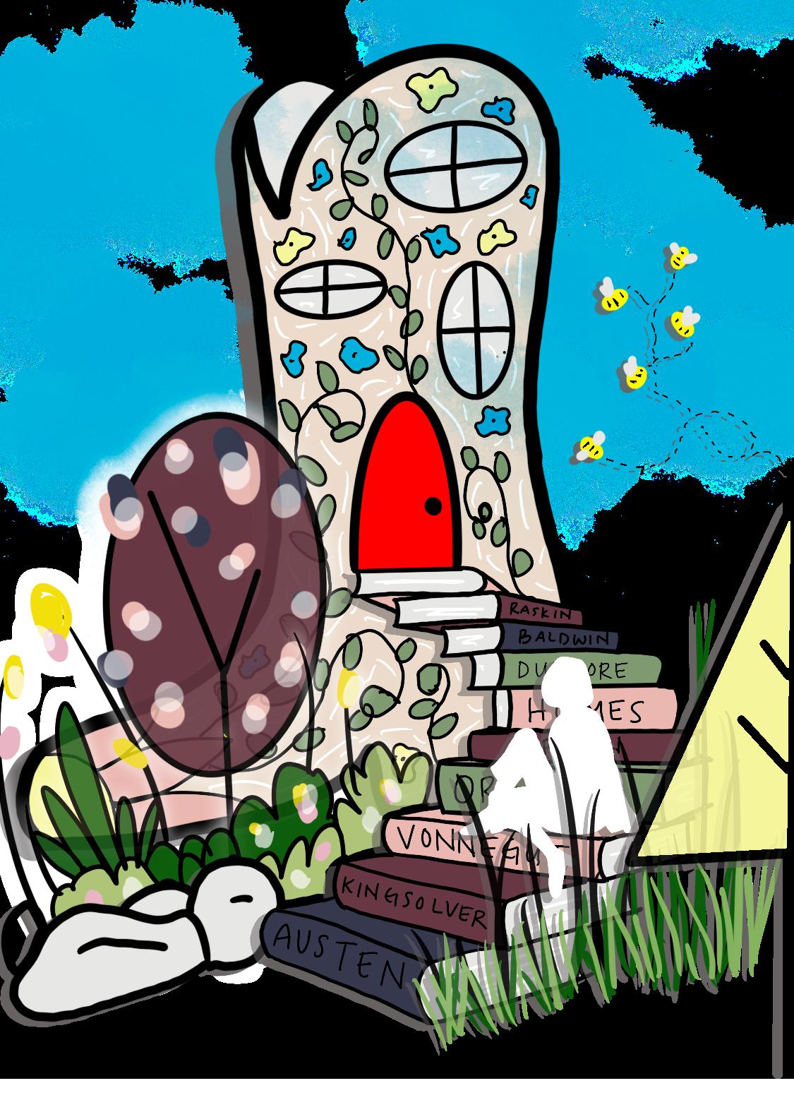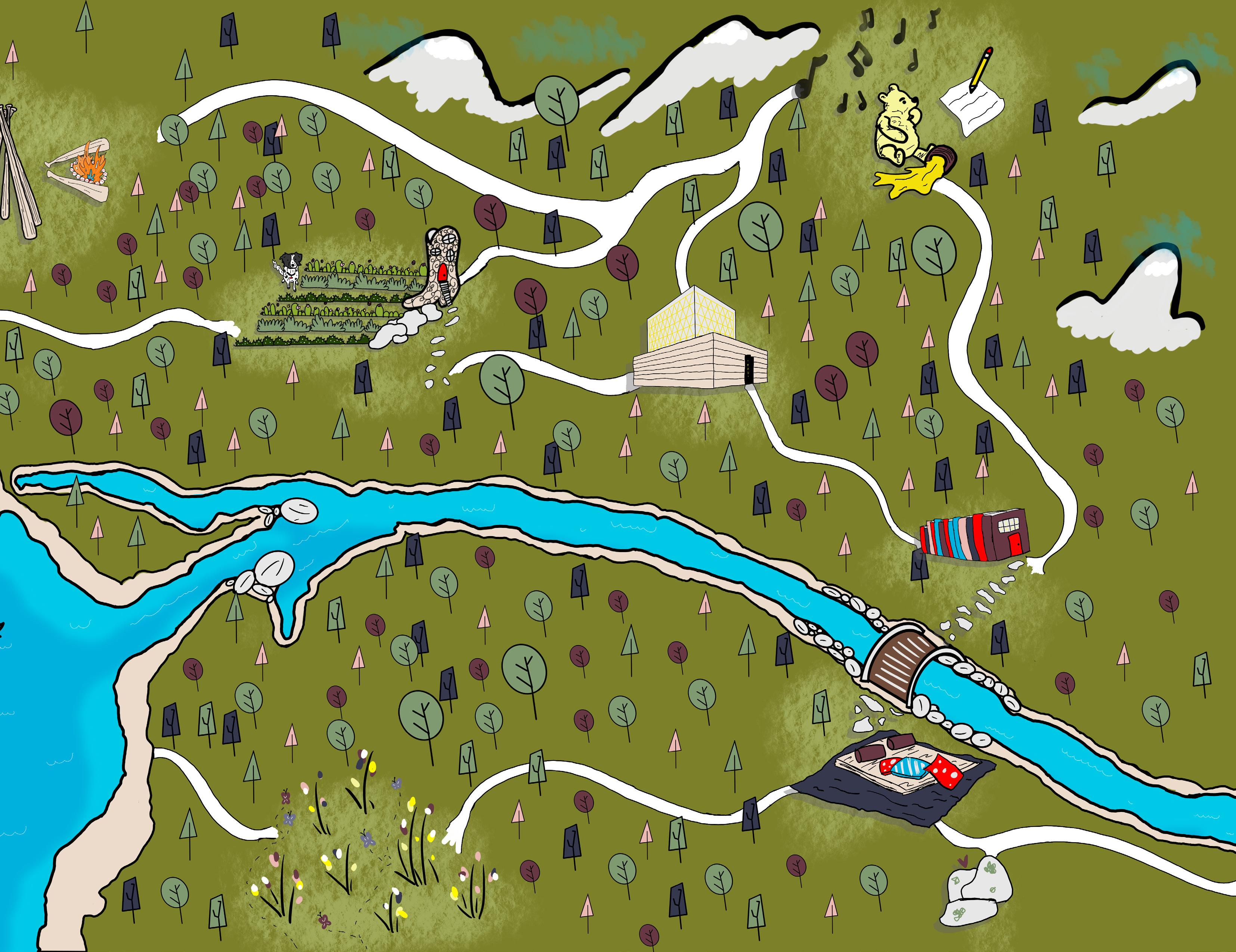 It started with a sketch of a few of my favorite things: books, southern culture, william morris wallpaper, baseball, dogs, and flowers. And then, it got me thinking: If my life was a book, and the beginning had one of those fantasy maps in it, what would the landmarks be? What would be a “livi-able” community? From there, with talking to friends and family, it came rather quickly. Instead of the little old lady who lives in a shoe, it would be little ole Livi (with Mose and Tripp) living in a cowboy boot. There would be books everywhere, spaces to be proudly Jewish and ones to do my favorite activity: nap. There would be homages to all of life’s little joys: music, writing, winnie the pooh. baseball, places to wander outside, beaches to lay on and mountains watching over me. It wouldn’t just be a place of my own, but a land of my own, where I could be unapologetically Livi.