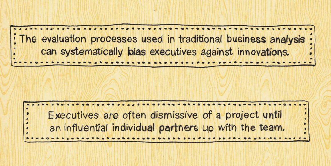 financial returns and potential new avenues opened up are difficult to anticipate in advance. For this reason, the same evaluation processes used in traditional business analysis (for example, discounted cash-flow analysis) can systematically bias executives against the type of innovations that could provide catalyzing changes. Investments in exploratory innovation typically evolve in stages, starting with small bets and only increasing as key uncertainties are resolved. That’s why having a suite of projects underway is so important.