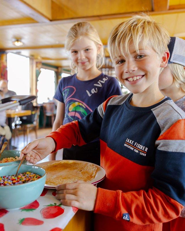 Onbeperkt pannenkoeken eten, dat is toch fantastisch?! En al helemaal met zo’n mooi uitzicht erbij. Vaak zijn onze ogen wel groter dan onze maag. Dan roepen we dat we er wel vijf op kunnen, maar meestal komen we niet verder dan twee, haha! Onze favoriet is de pannenkoek met spek en kaas. Deze staat standaard op het “menu”. De tweede wordt vaak iets zoets en dan zitten we vol. Niet heel avontuurlijk, hè? Misschien gaan we de volgende keer voor iets anders… maar waarschijnlijk niet.’