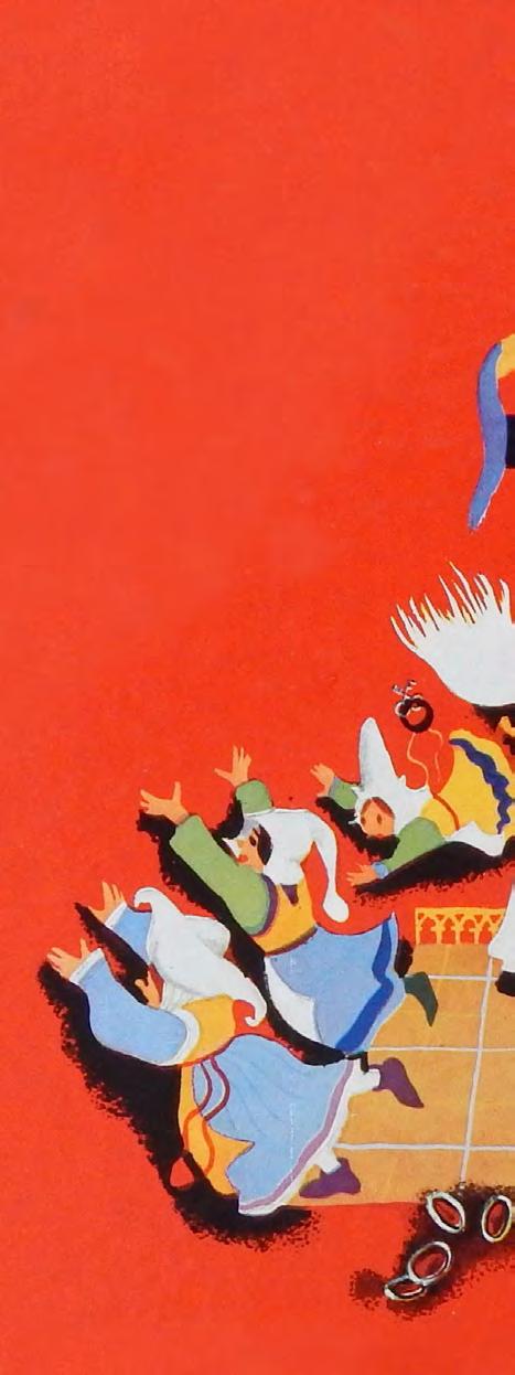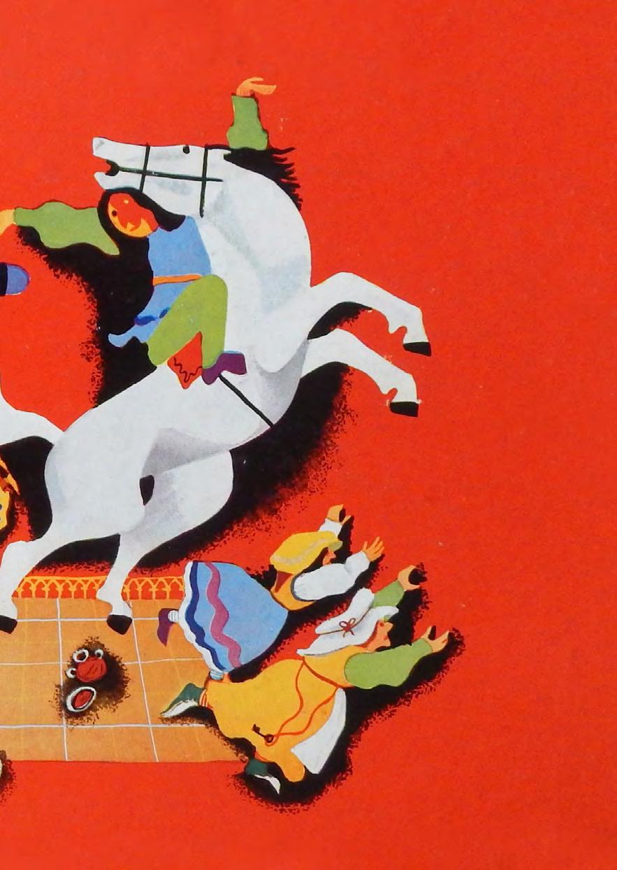 Till Eulenspiegel gallops into the market. Illustration for the cover of a Victor record (1946)