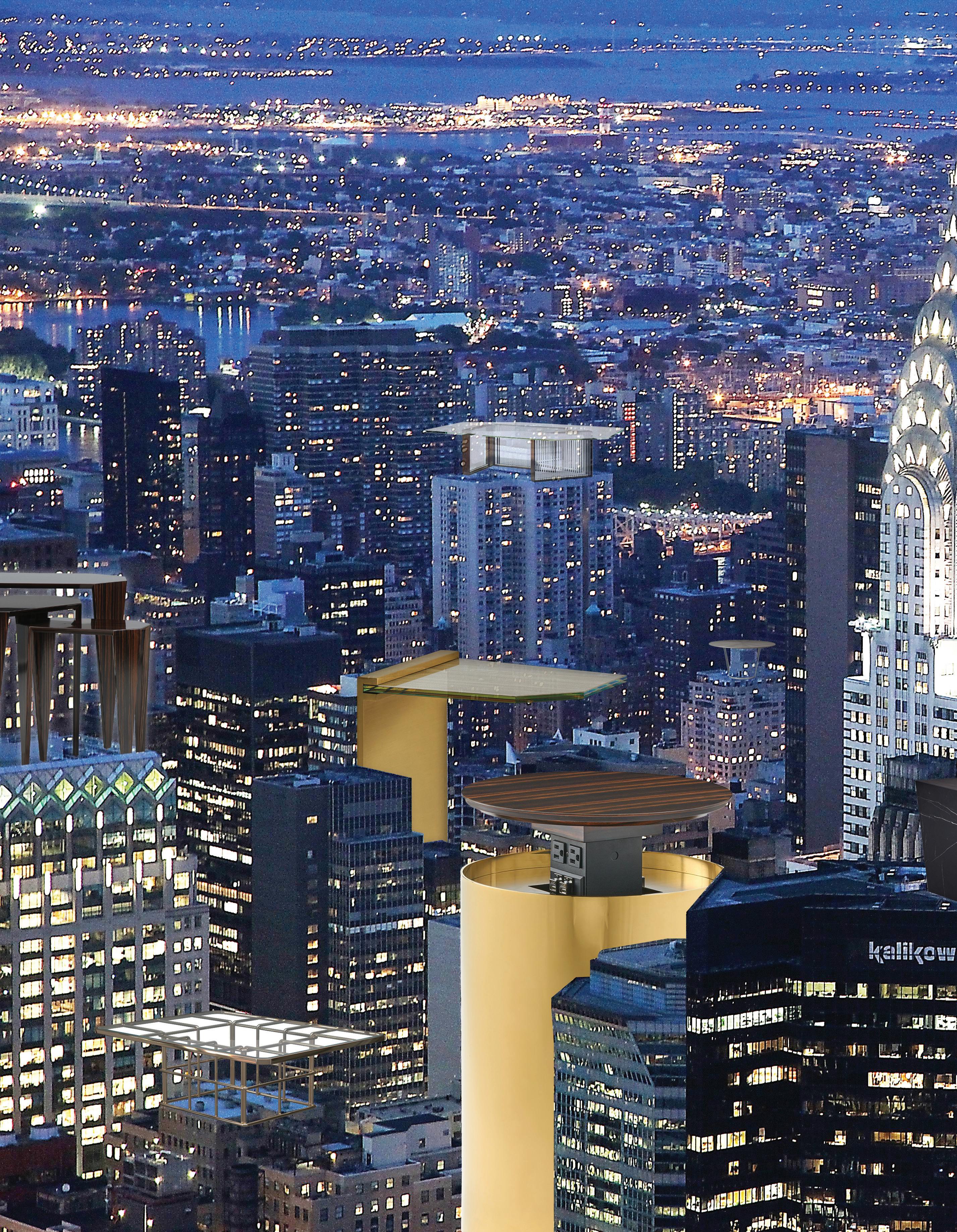 The Powerful Cylinder is constructed of polished brass or stainless steel base and is offered in a variety of quarter-cut wood or stone top finishes that pop up in a fluid vertical motion to reveal a hidden power pocket with multiple three-prong and USB outlets that offer a convenient place to charge multiple devices.