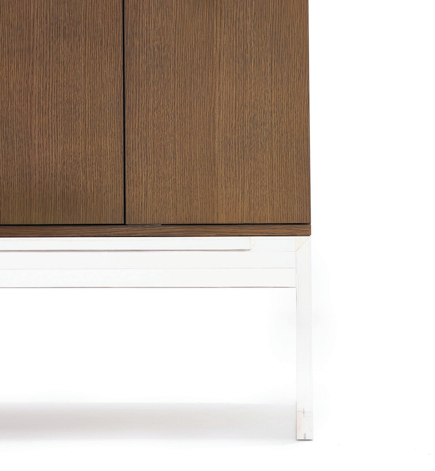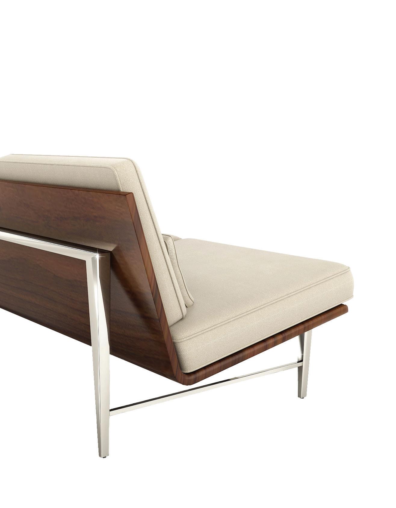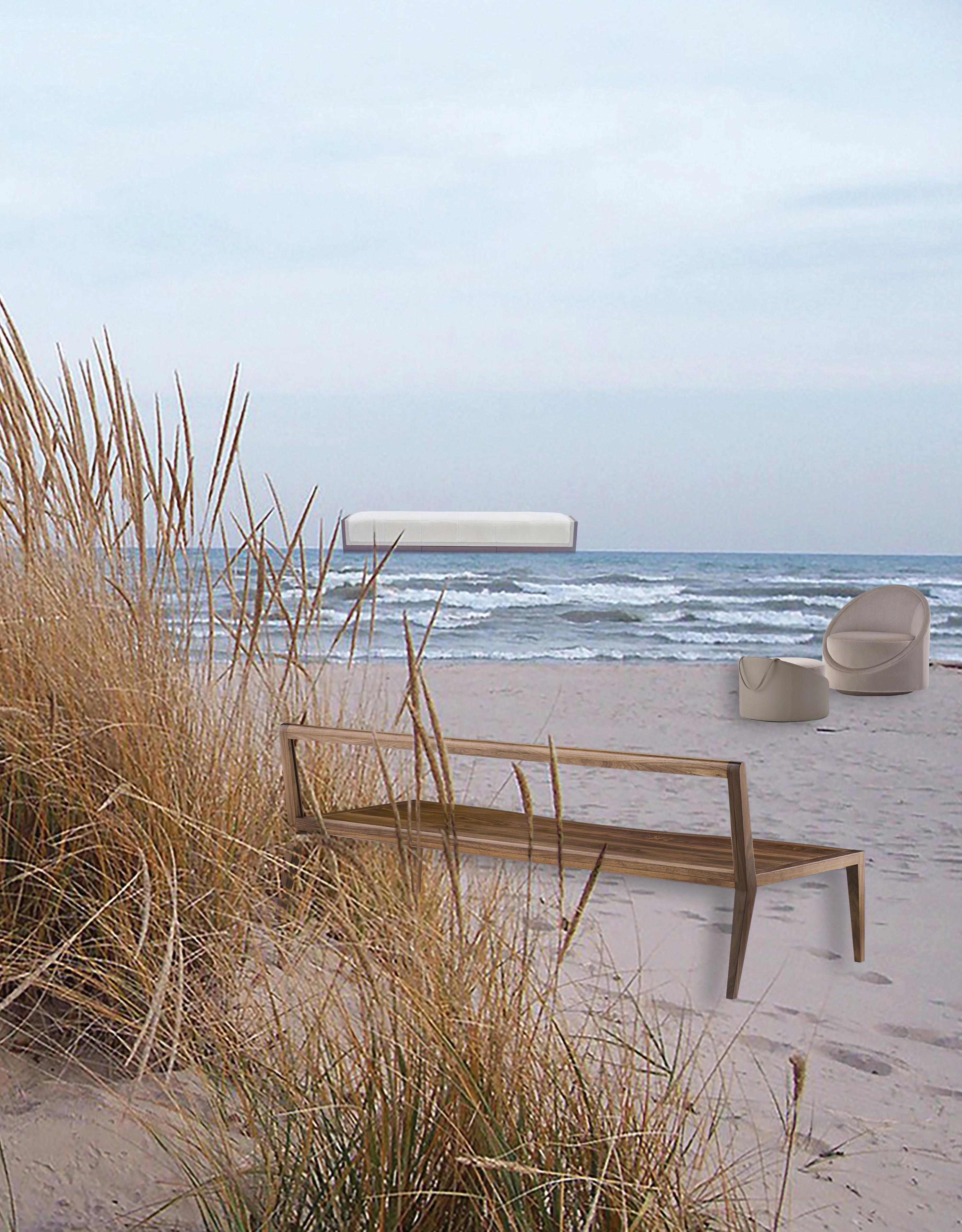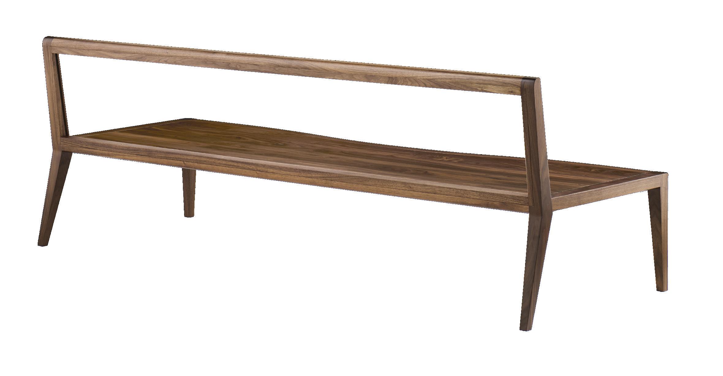 Handcrafted from solid walnut, the seat is elegantly curved in contrast with the structured back, which is supported by transparent acrylic and acts as an interactive picture frame to capture the everchanging environment in which it sits. Captivating and intriguing the Wood Float Bench can stand alone with its beautiful exposed walnut finish or can be adorned with custom cushions in a variety of fabrics for additional support and comfort.