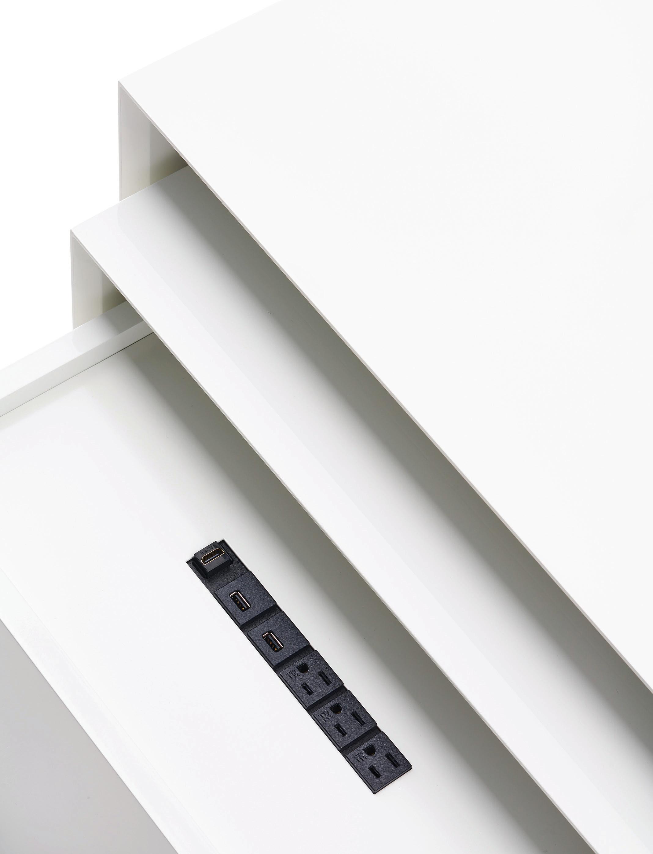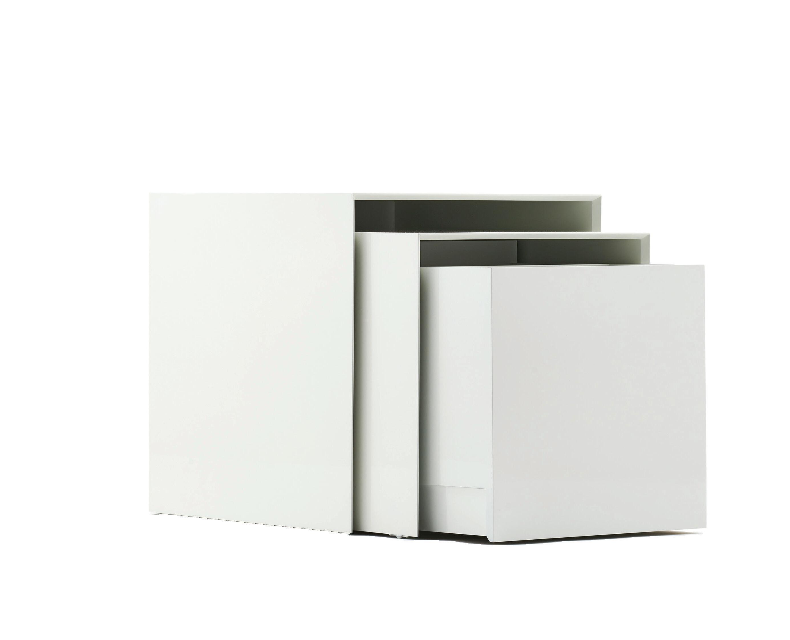 Comprised of three high gloss lacquered cubes, the Powerful Nesting Tables contract to fit within each other and conserve space and expand to offer more surface area, and allow access to hidden power outlets to charge multiple devices simultaneously.