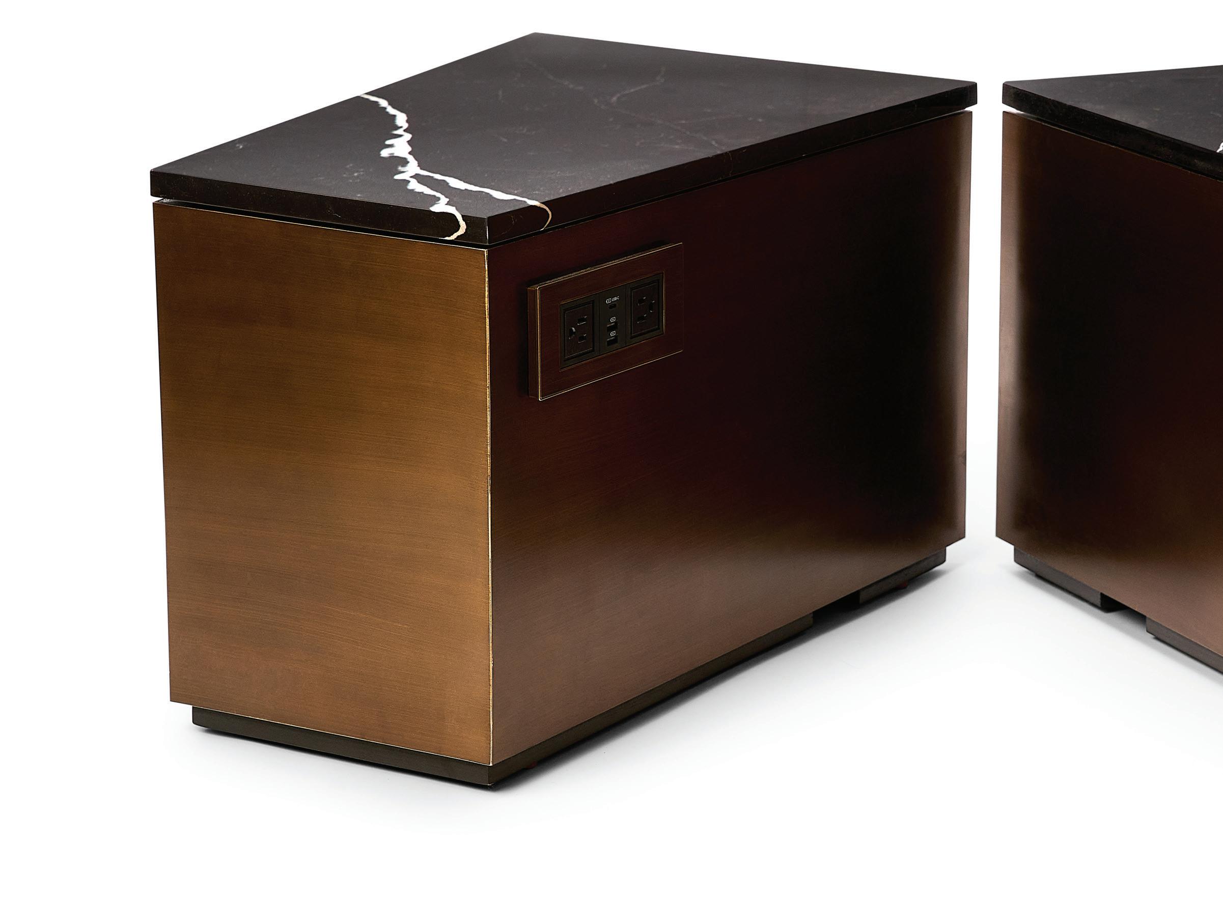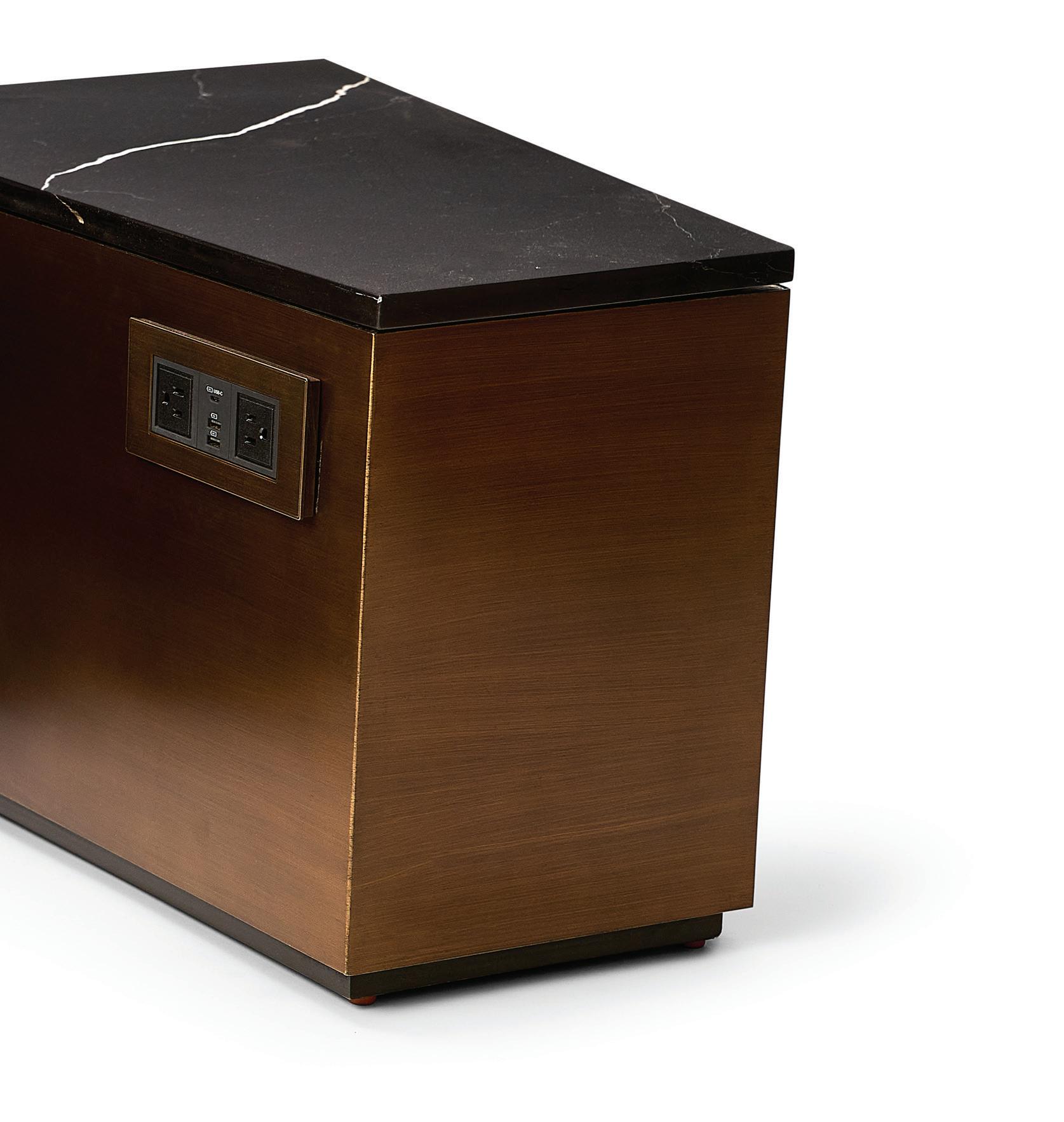 Designed to offer convenience in tight or irregularshaped spaces, the Powerful Side Table is comprised of a metal base with stone top and features two integrated NEMA 5-15 outlets as well as two USB ports and a USB-C port to keep you charged.