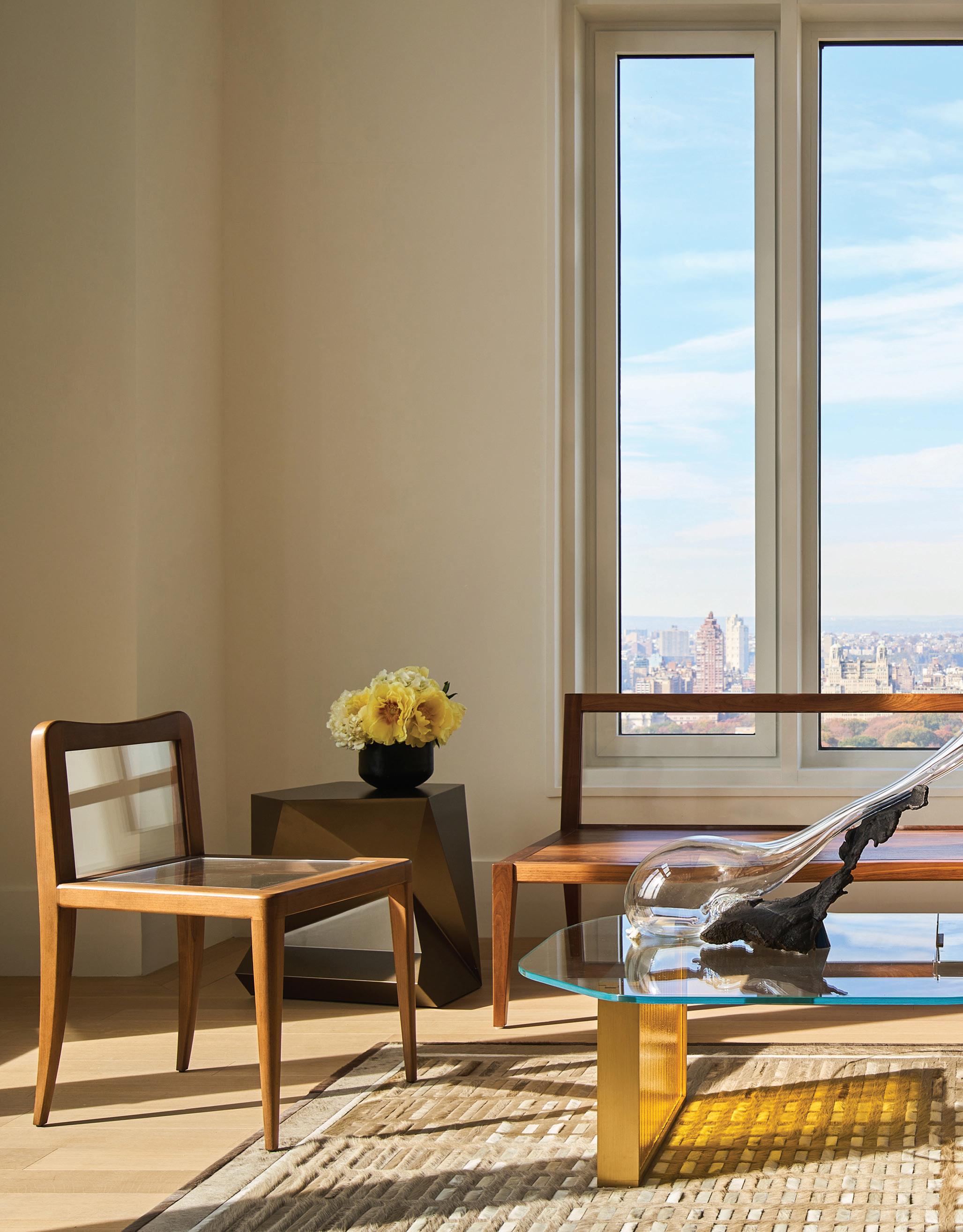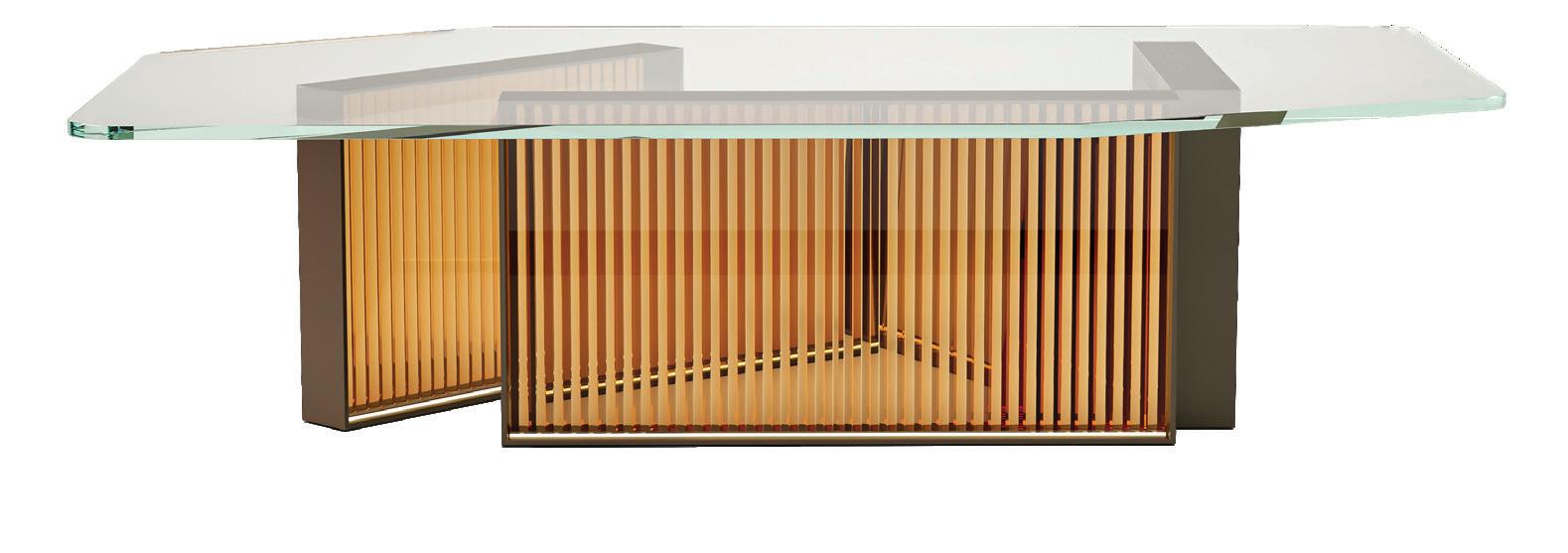 With its irregular tempered glass top and its bronze and cast glass base, the Cross Bar Table is akin to a vintage piece of jewelry, it accessorizes any space.
