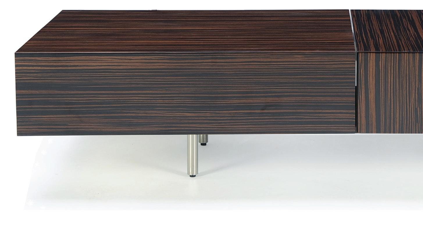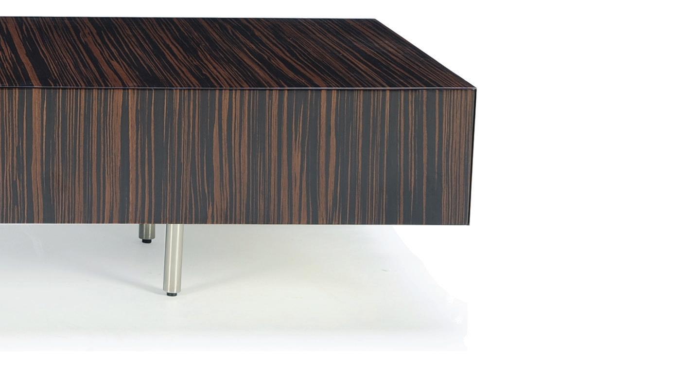 The Powerful Cube Table has a quarter-cut, non-figured wood top, and a polished stainless steel base. Its polished metal facade exudes energy by reflecting movement and light and its internal functionality offers recharging and power capabilities for a variety of devices. Simply tap the hidden drawer in the front and the face opens to provide access to power outlets and a hidden storage compartment.