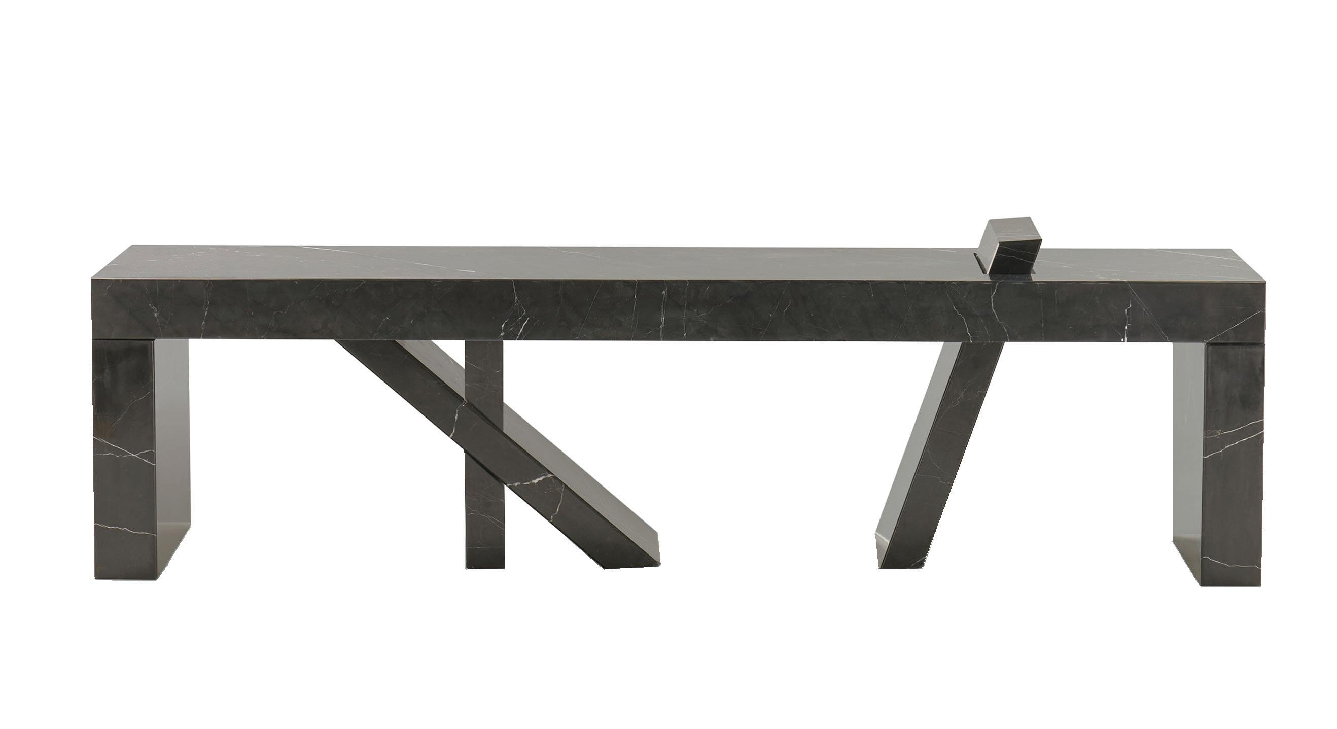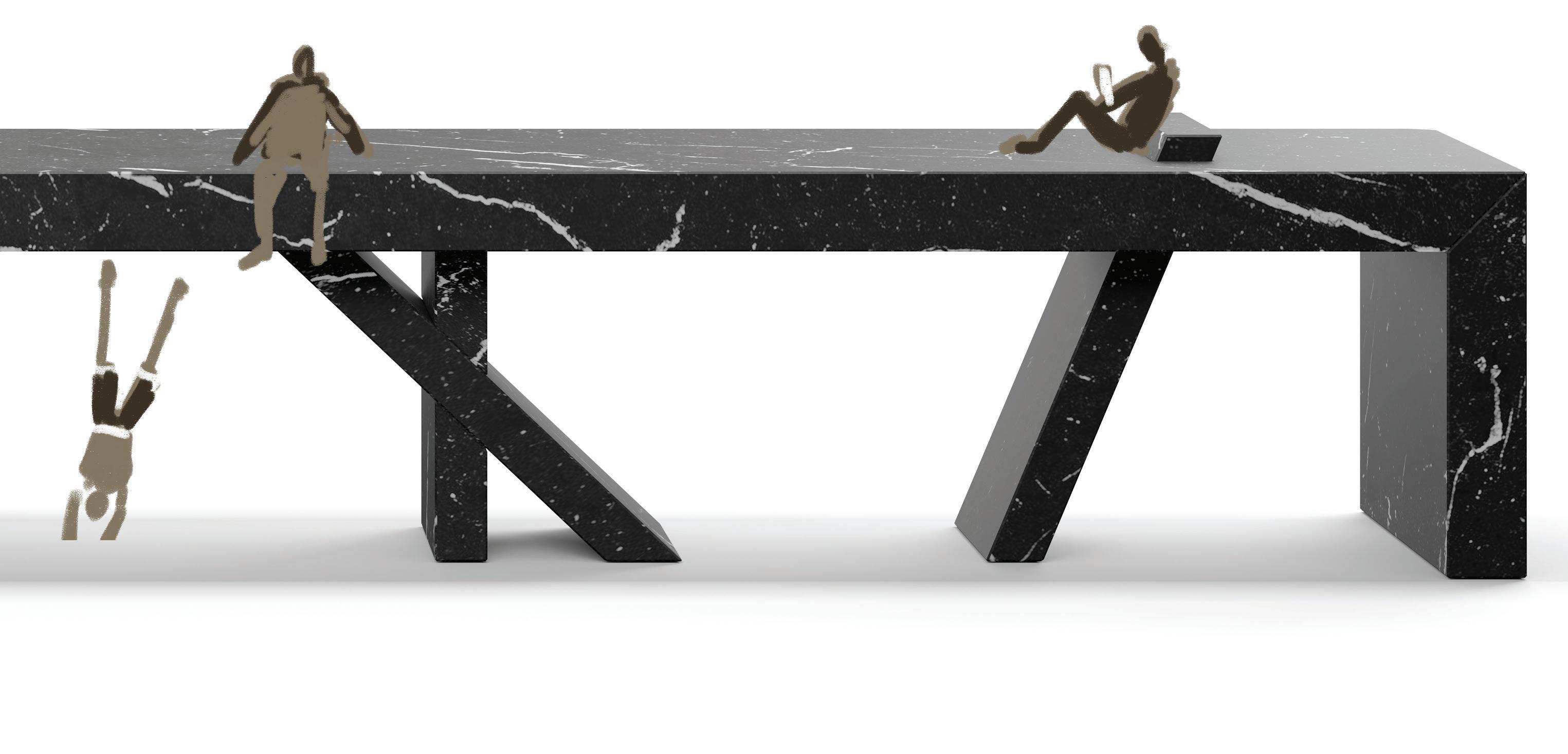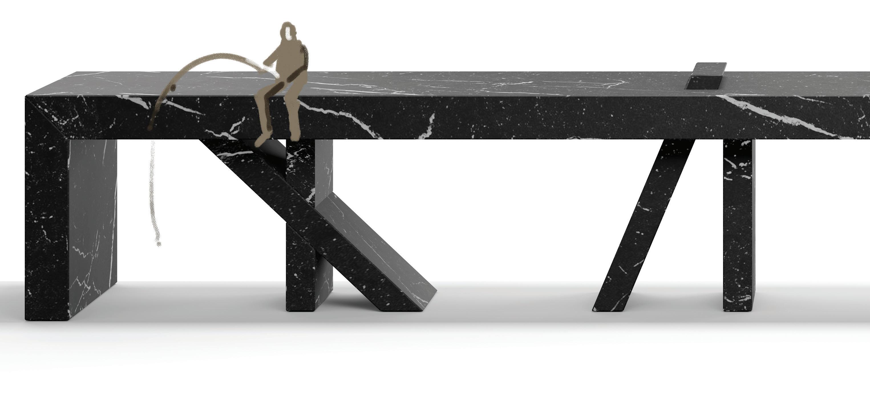 The Walking Bench was originally created for the indoor/outdoor entry foyer at the Kips Bay Show House in Dallas, Texas. The impetus for the design was that the bench looks kinetic as if it has its own energy to physically walk on its own.