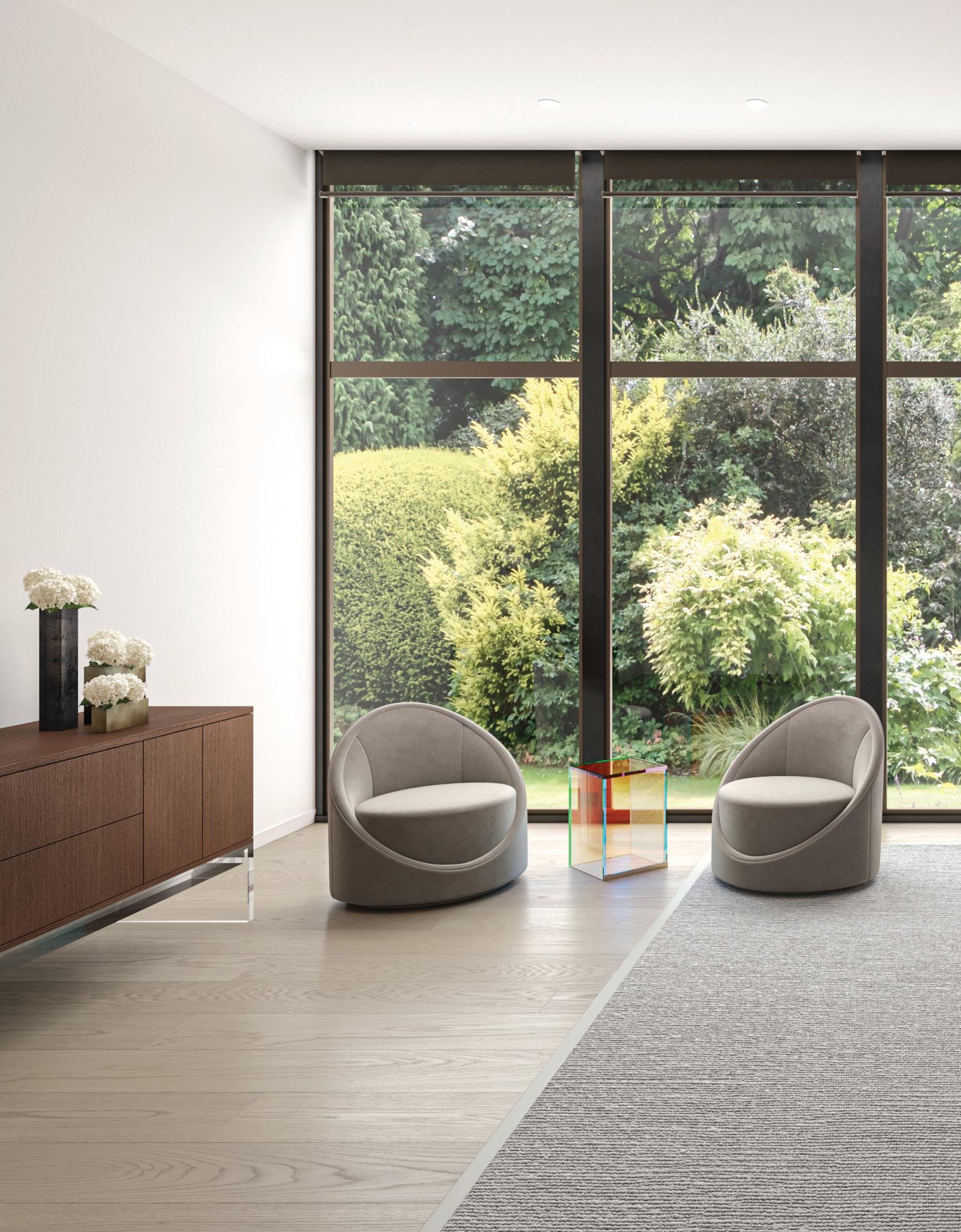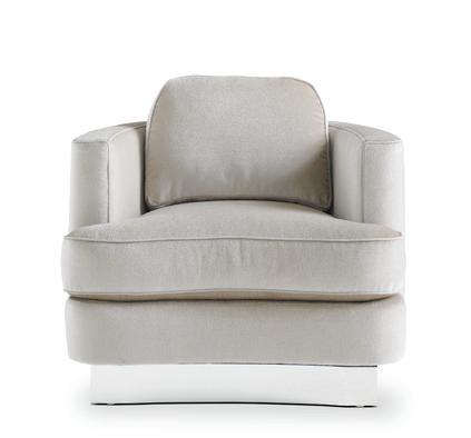 Upholstered in soft mohair, the Artis Chair is a study of the balance of form and function. It plays on sculptural forms with its circular seat and half-moon back and a cylindrical form. For added flexibility, it sits on a swivel base to allow its occupant to turn to engage in conversation or away to take in the view. Ottoman sold separately.