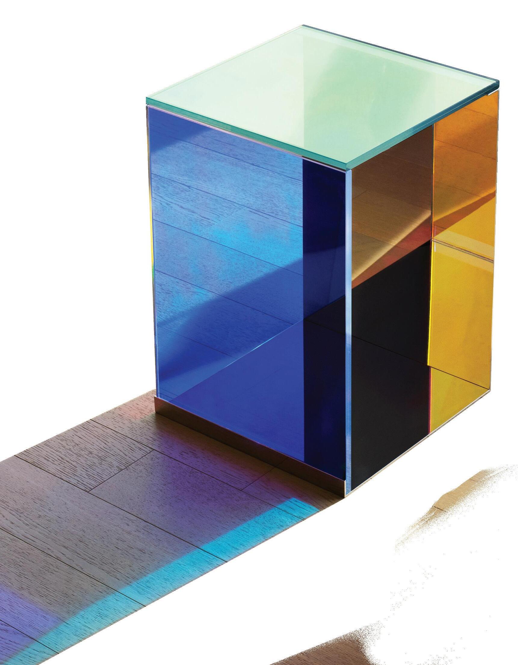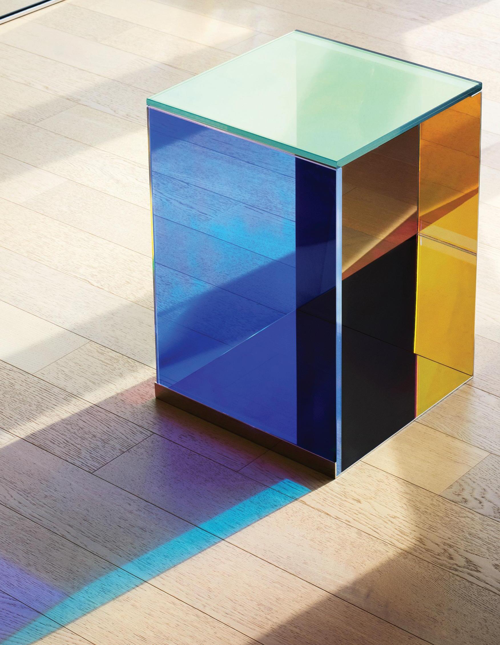 The award-winning Dichroic Table is an active statement piece that evolved from Lauren’s fascination with early Light and Space artists. As natural light changes throughout the day, the surfaces of the table dramatically shift color, reflecting and refracting colored shadows that create a dialogue with its surrounding environment.
