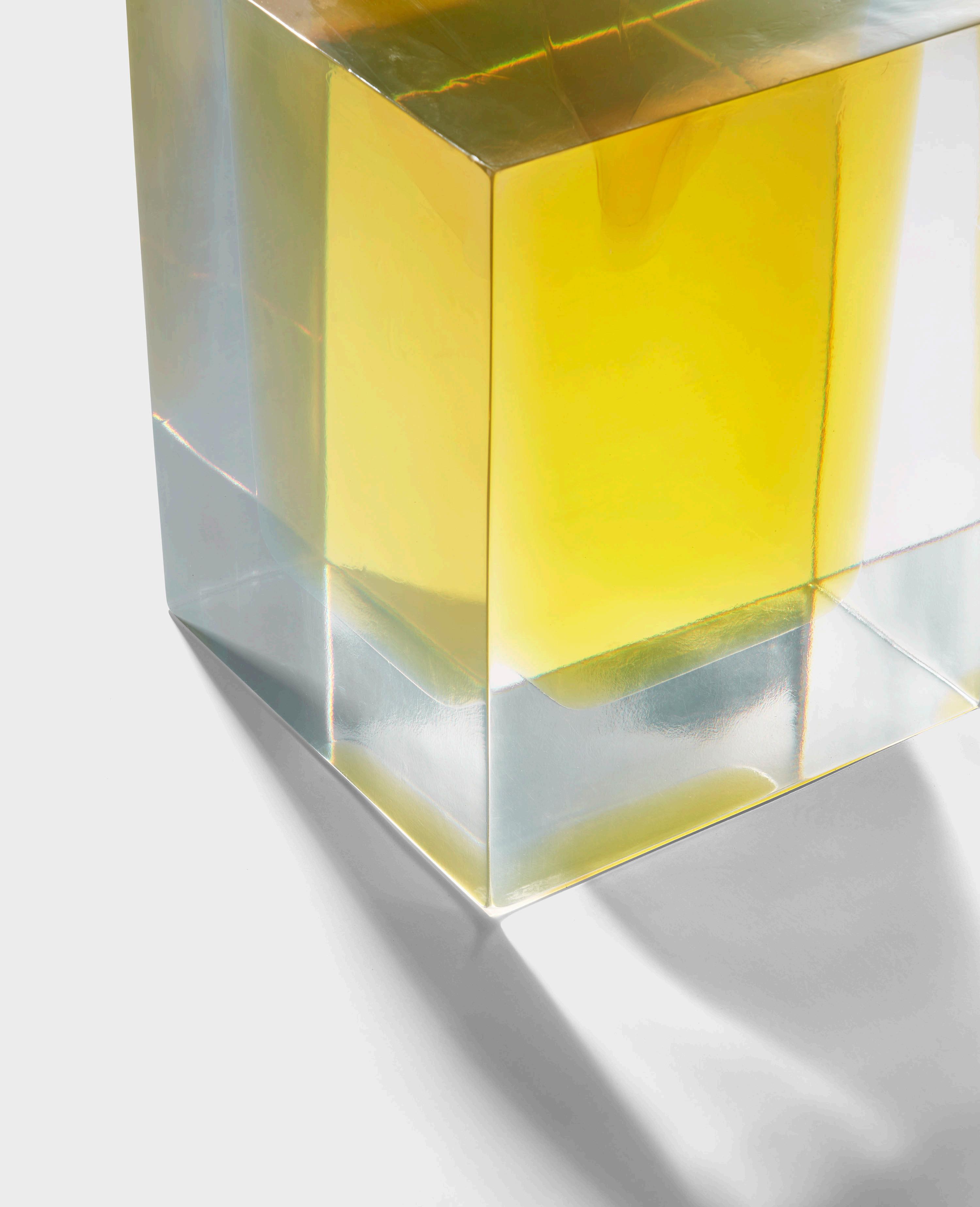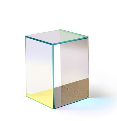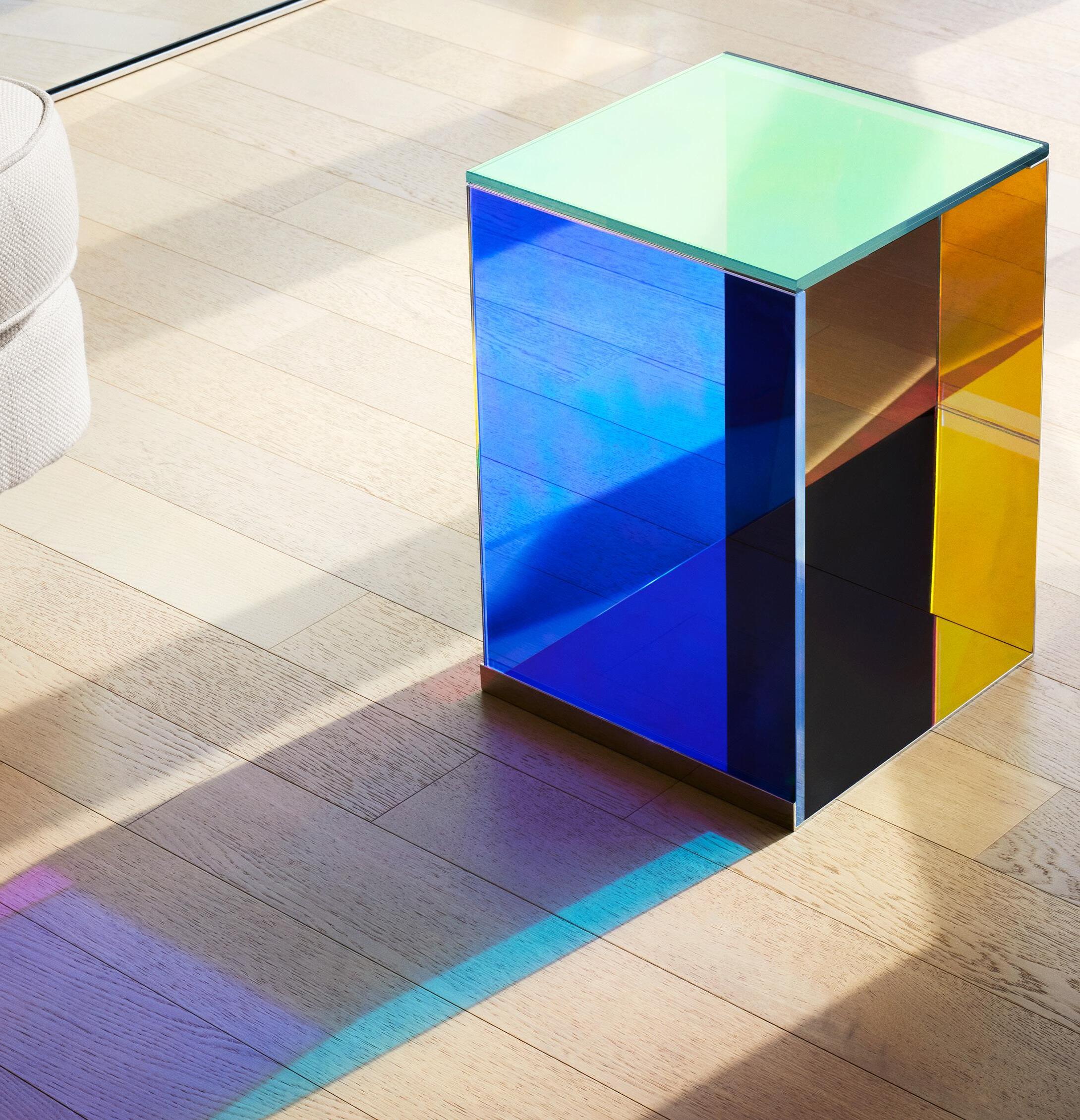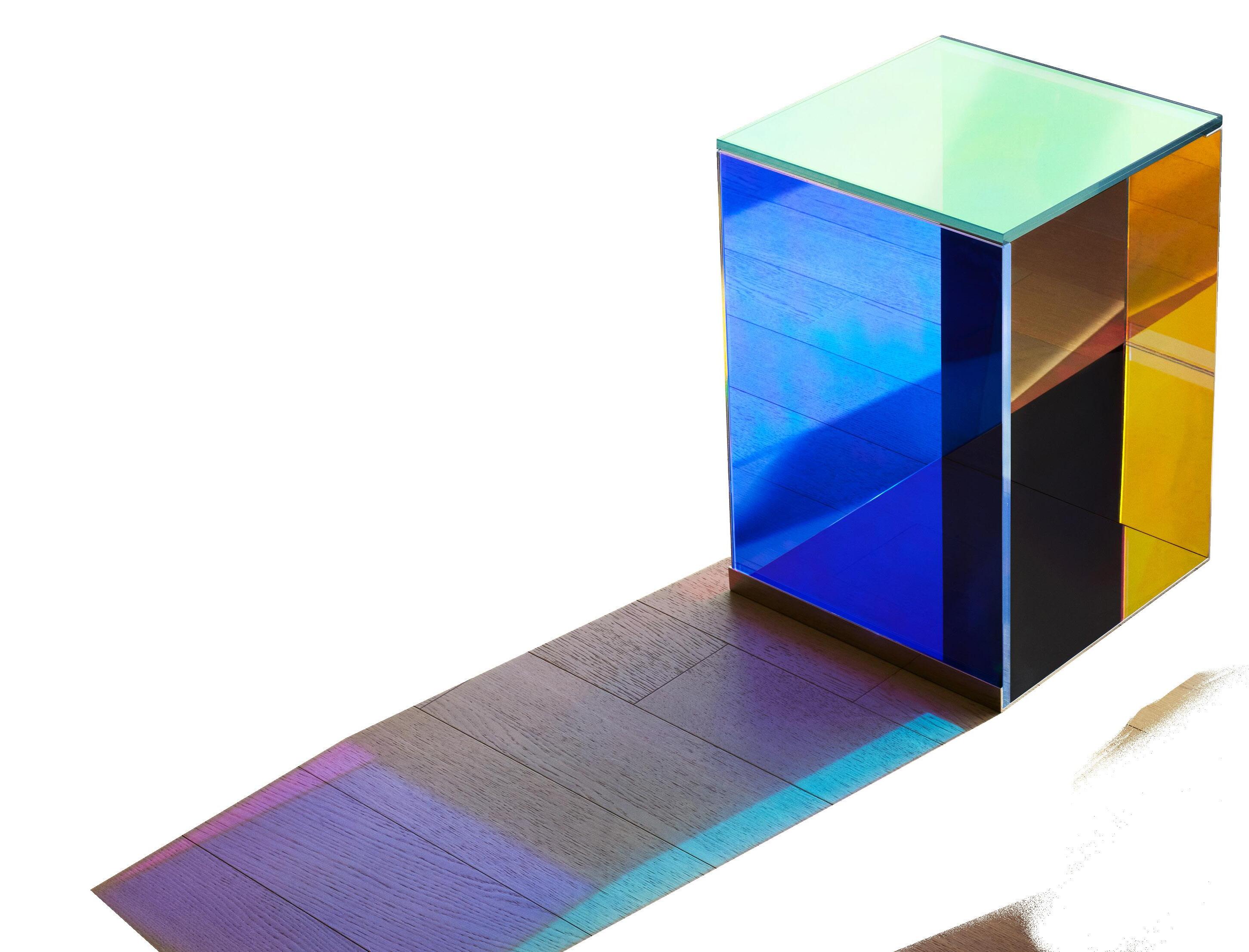 As natural light changes throughout the day, the surfaces of the table dramatically shift color, reflecting and refracting colored shadows that create a dialogue with its surrounding environment.