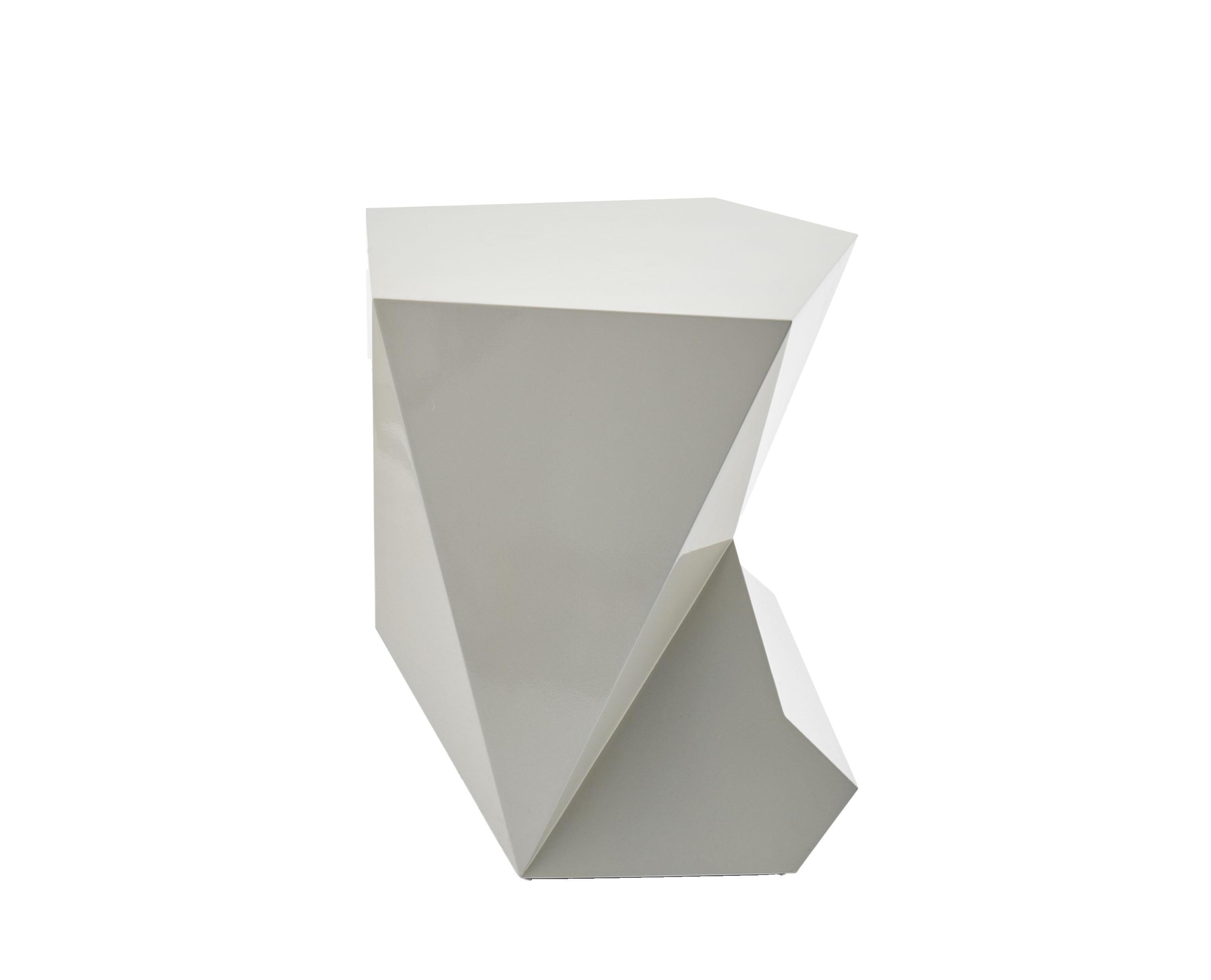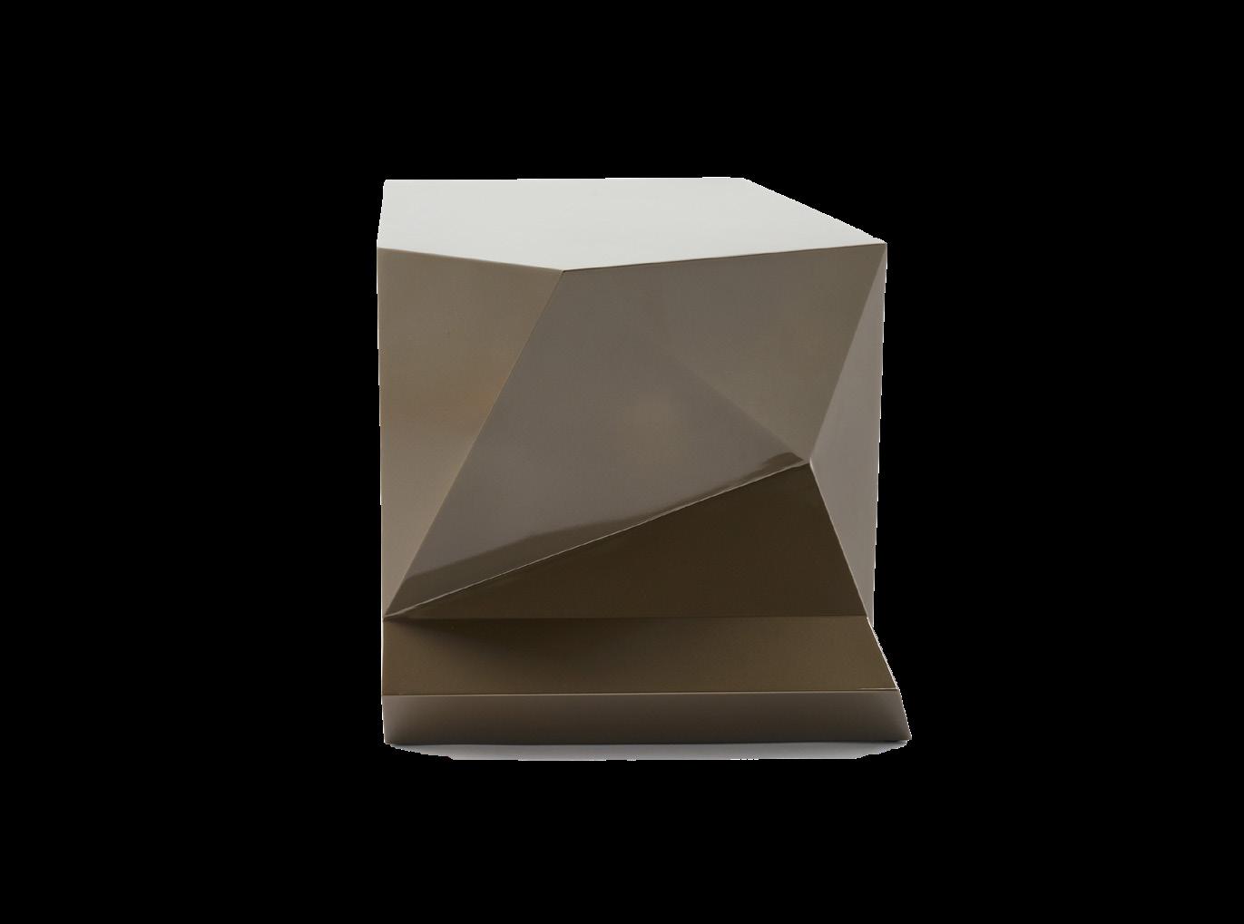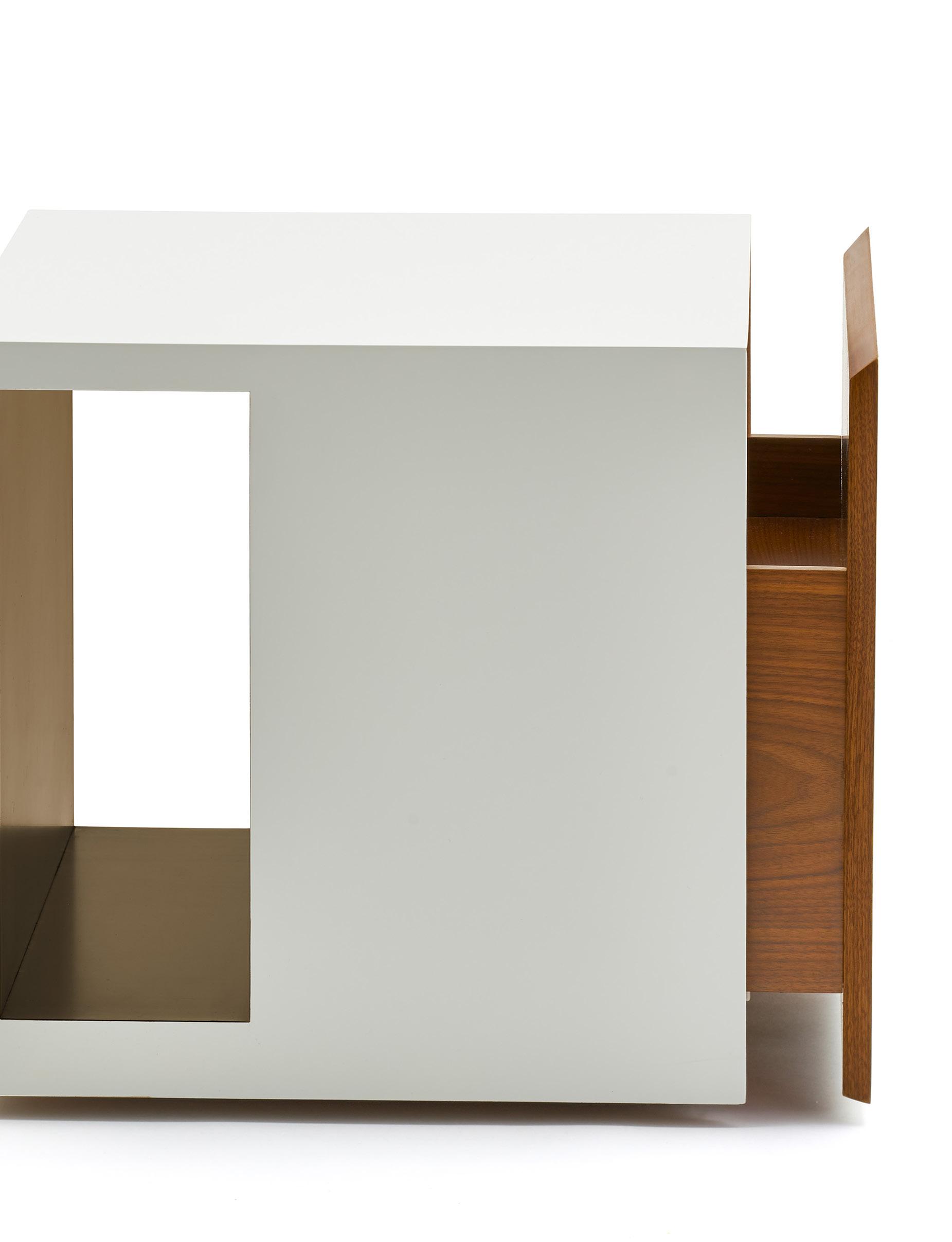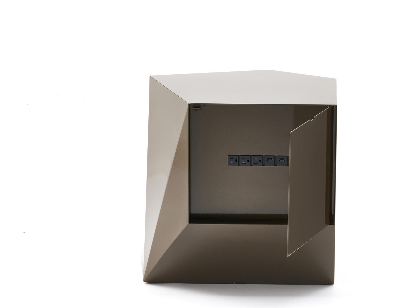 Striking and silently commanding attention, the original Powerful Table is a complex design of multiple faceted surfaces that result in unique faces which highlight reflections on its high lacquered surfaces and create playful shadows in its environment. Hidden within the flat square panel are a small storage compartment and power drawer with access to multiple outlets in order to conveniently charge a variety of devices.