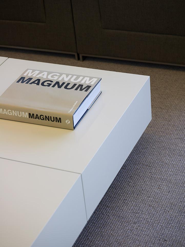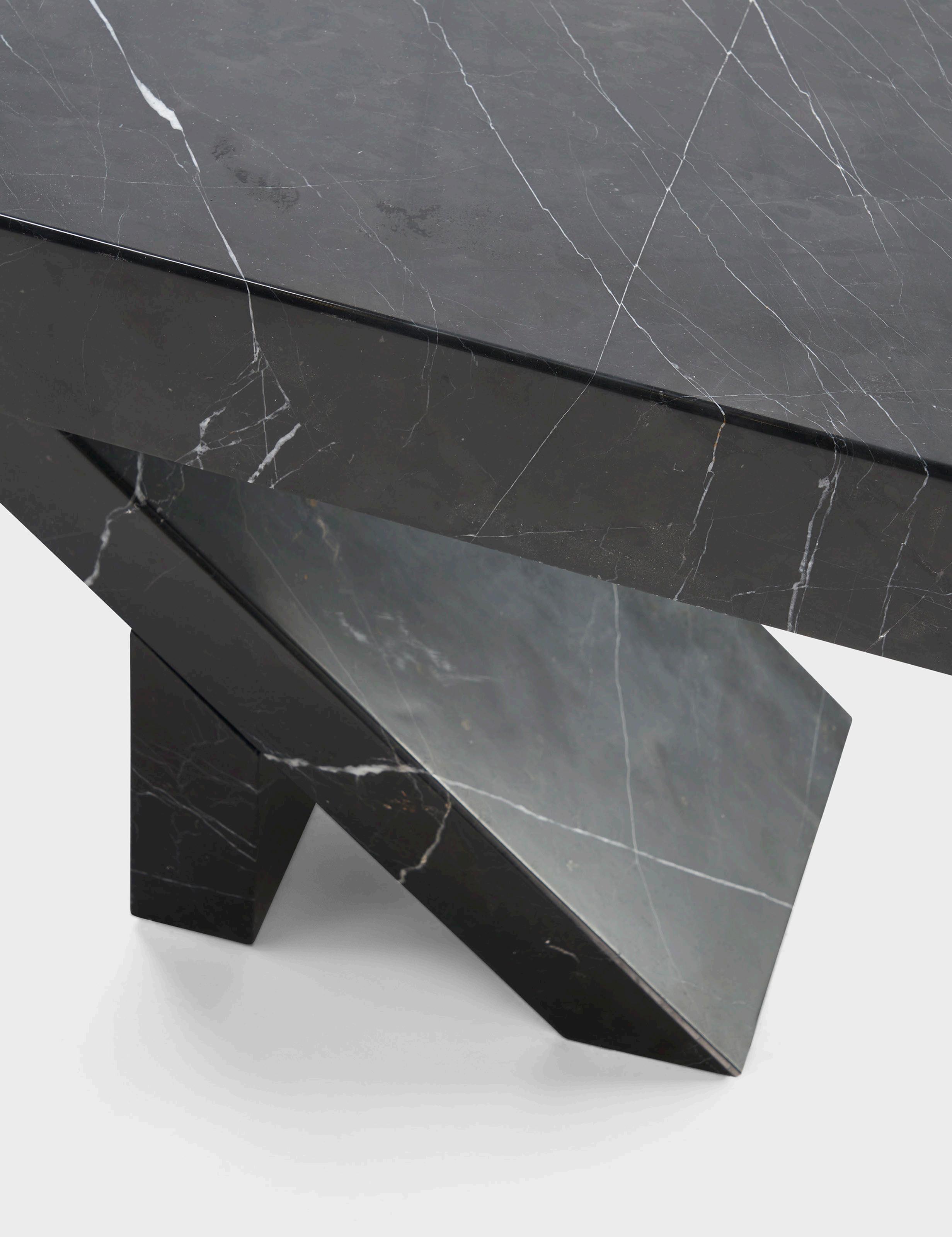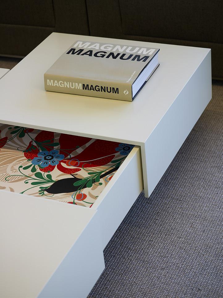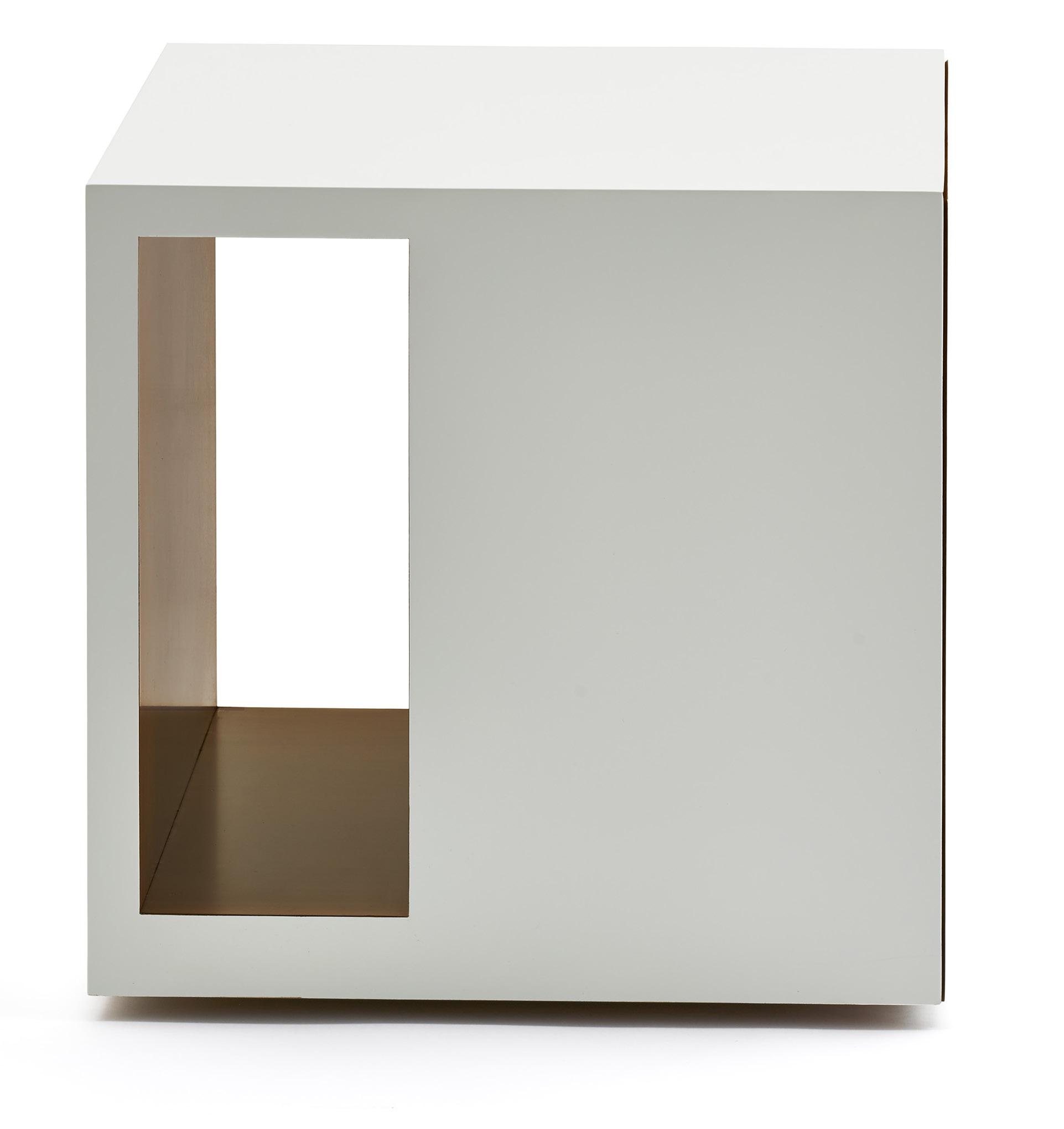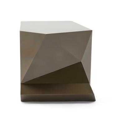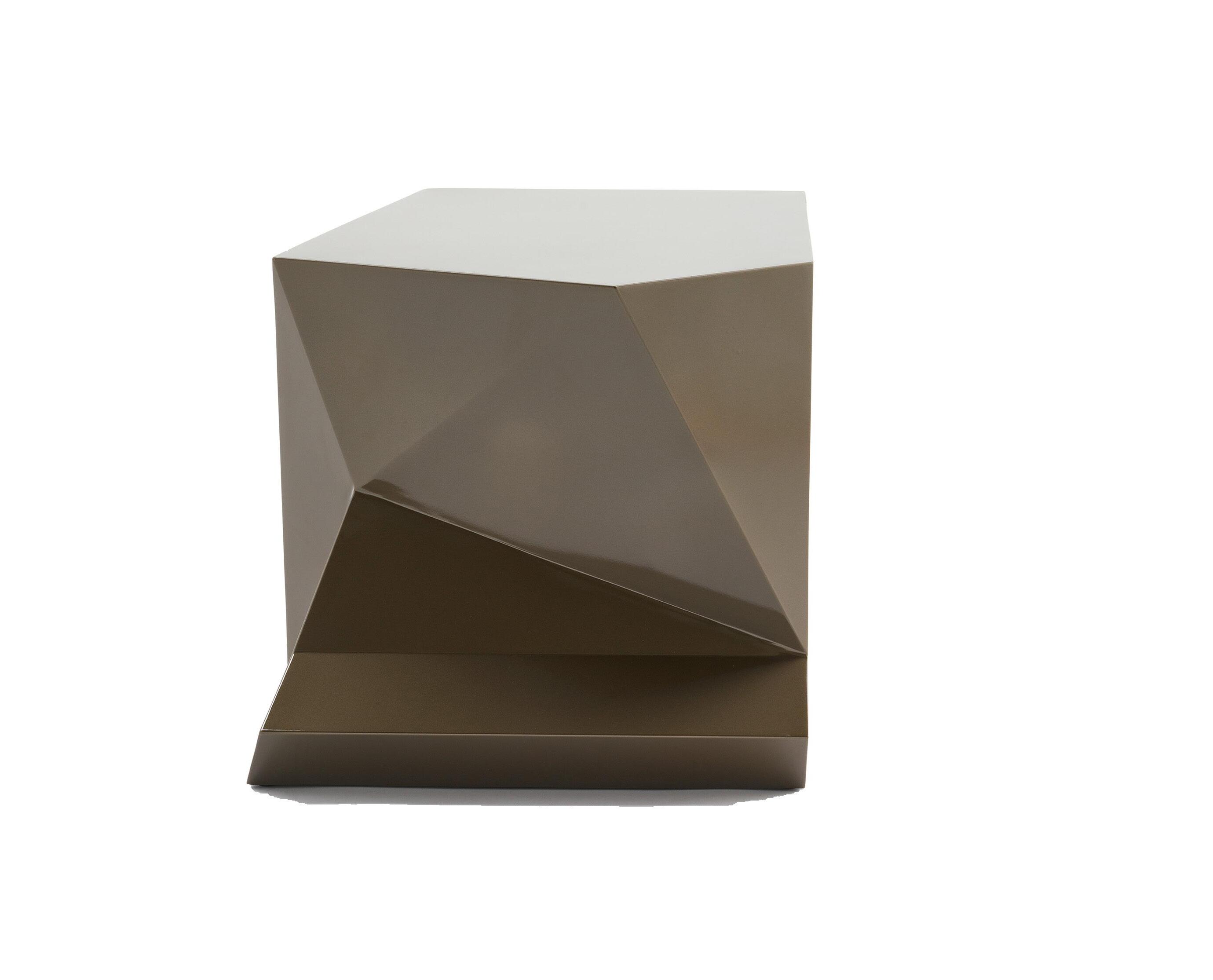 Striking and silently commanding attention, the original Powerful Table is a complex design of multiple faceted surfaces that result in unique faces which highlight reflections on its high lacquered surfaces and create playful shadows in its environment. Hidden within the flat square panel are a small storage compartment and power drawer with access to multiple outlets in order to conveniently charge a variety of devices.