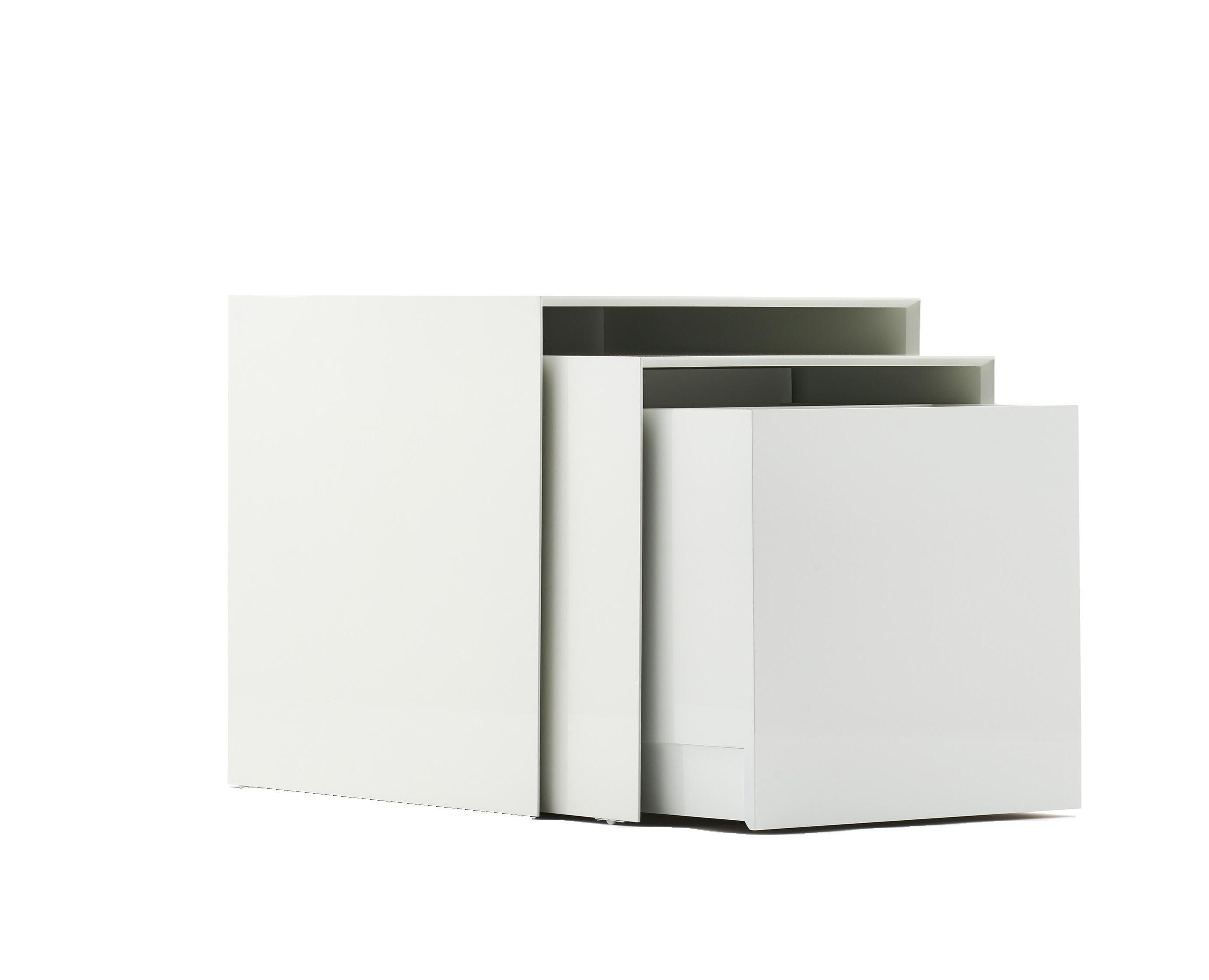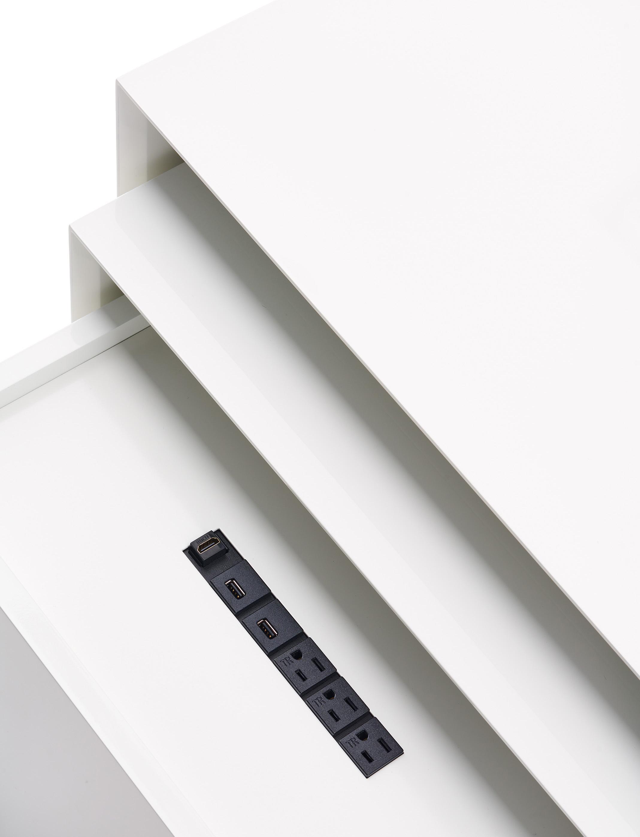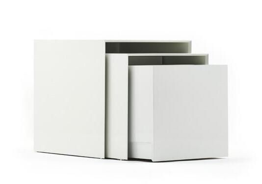 Comprised of three high gloss lacquered cubes, the Powerful Nesting Tables contract to fit within each other and conserve space and expand to offer more surface area, and allow access to hidden power outlets to charge multiple devices simultaneously.