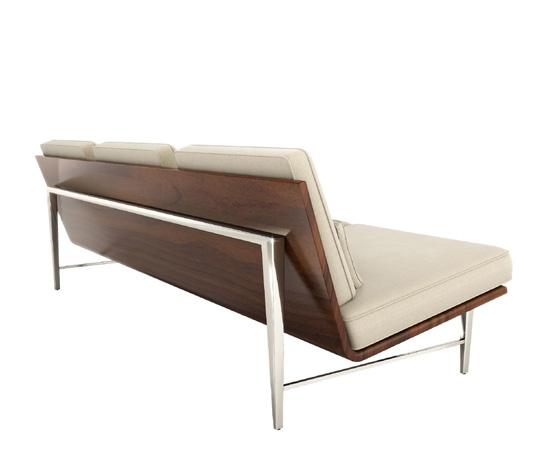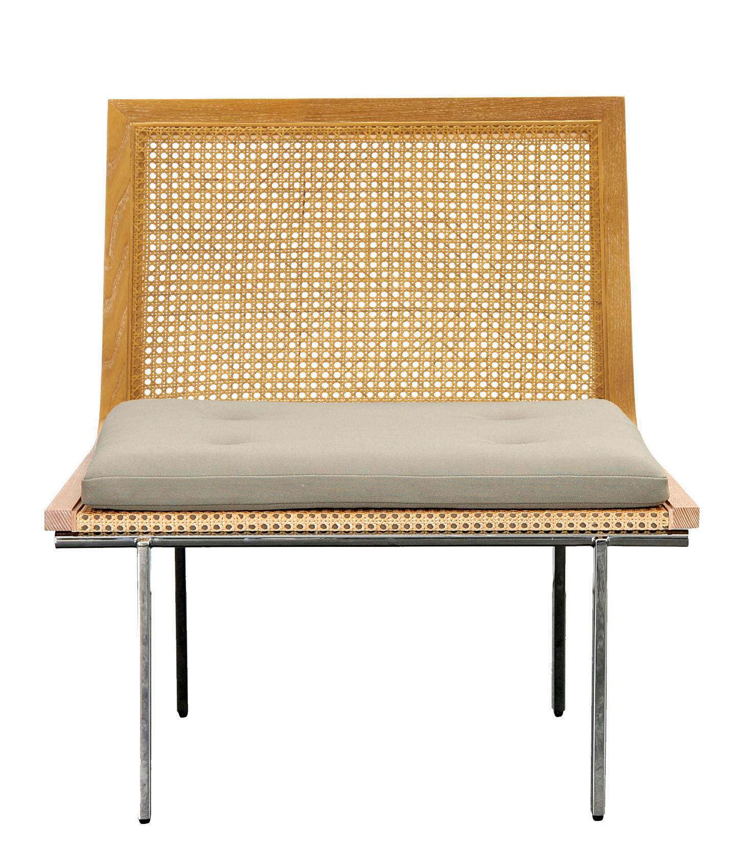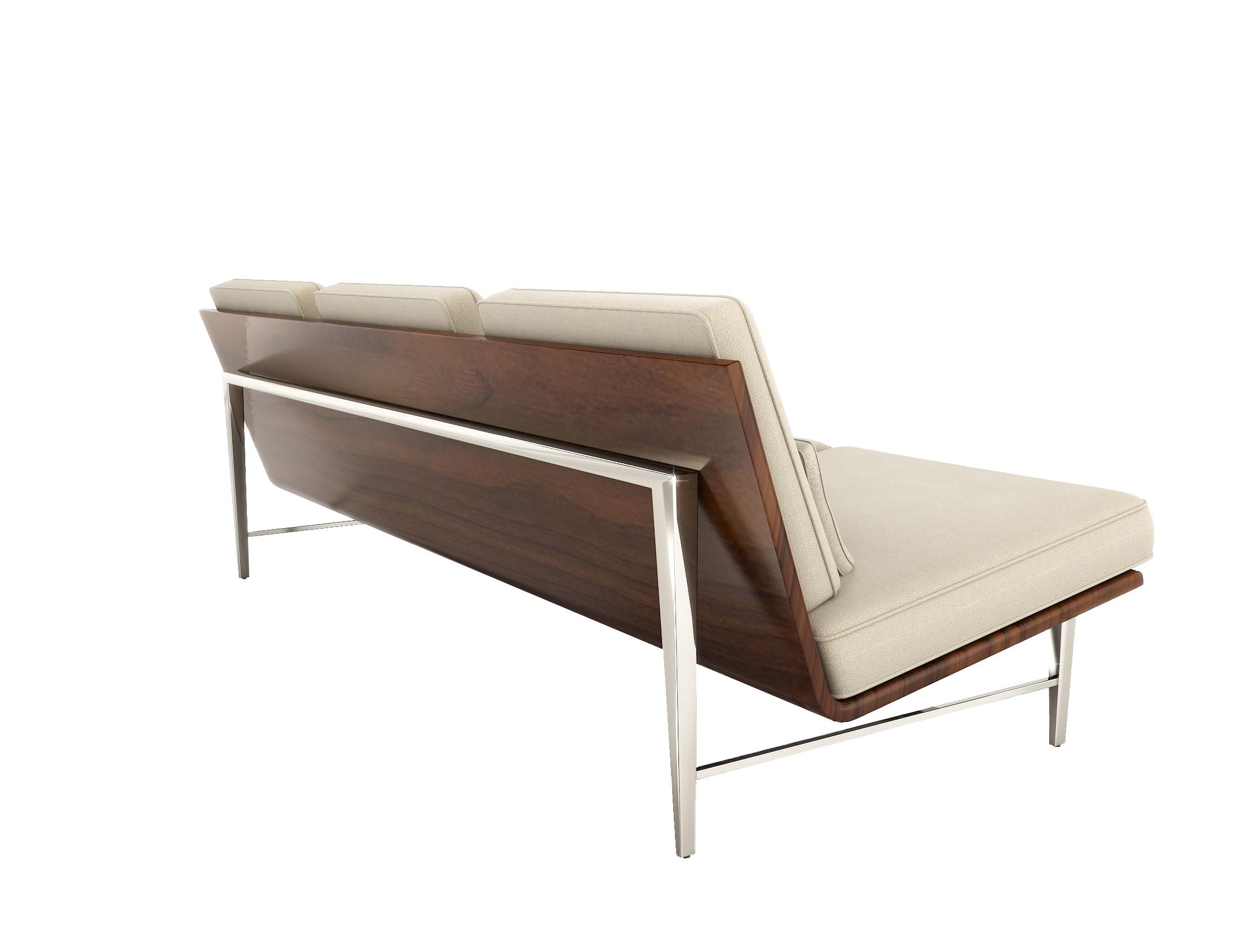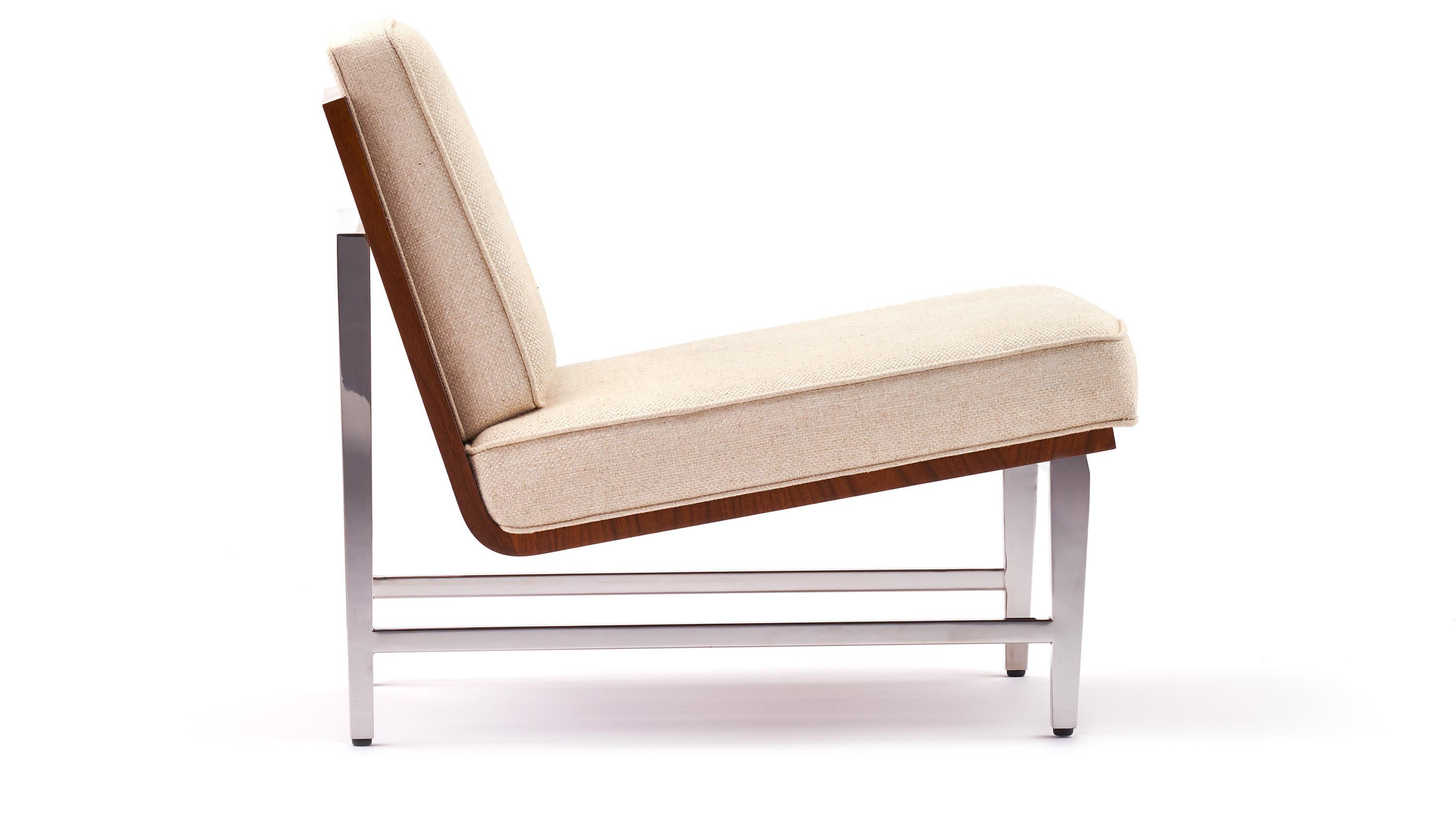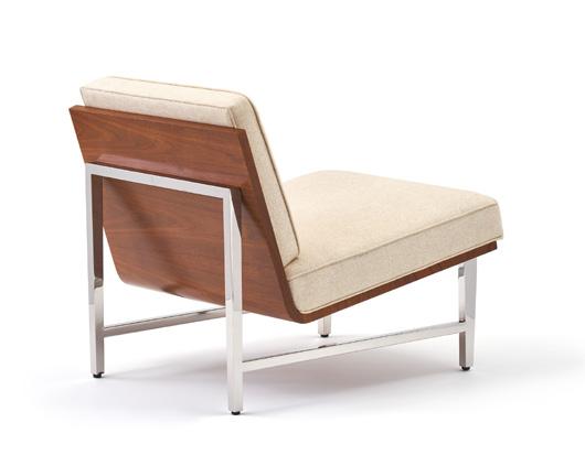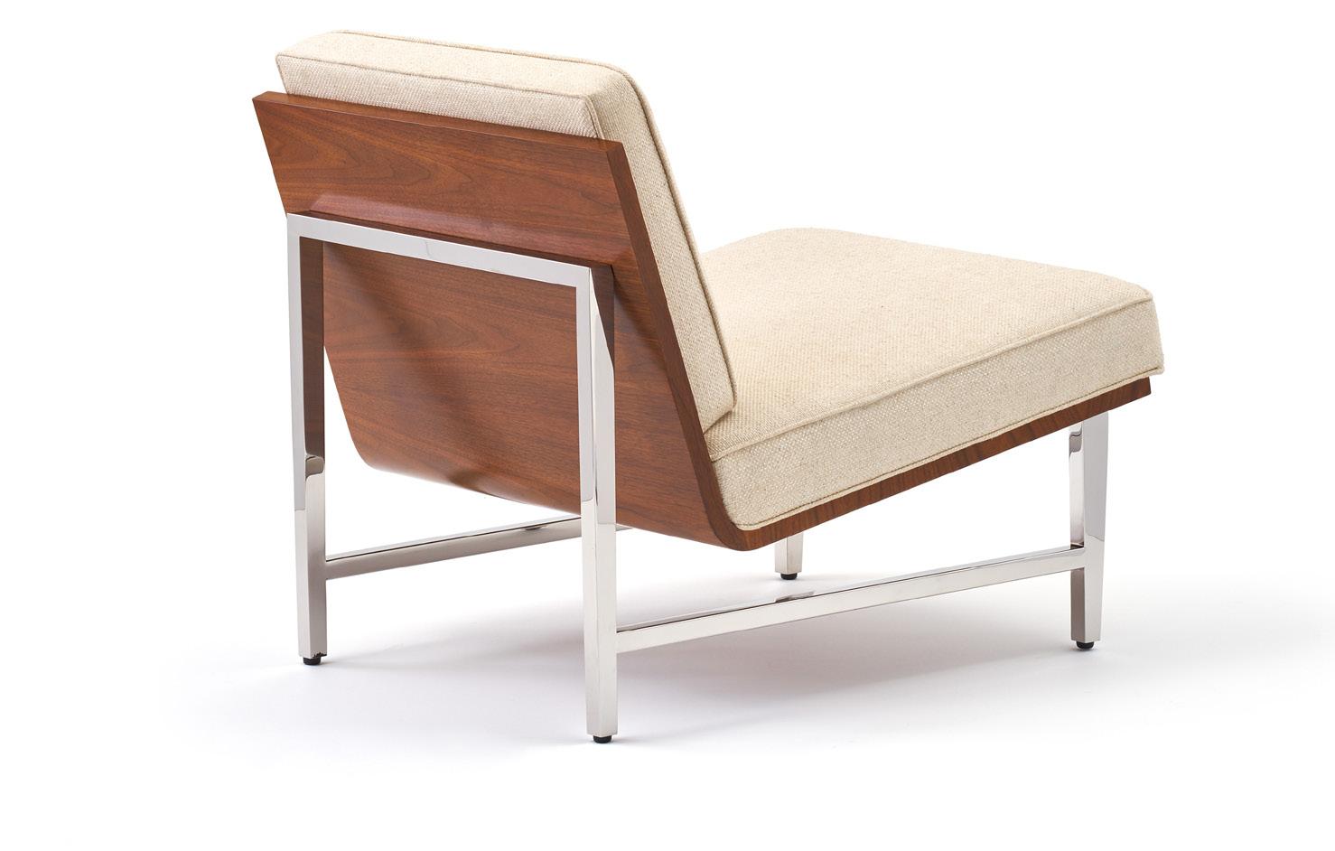 A wood base replaces the acrylic in this version of the New Canaan Sofa. The original was named after the location the renowned Glass House, a structure where the interior spaces are almost entirely visible from the outside. The New Canaan Lounge Chair is composed of an acrylic base to reveal the clean, architectural lines of the stainless-steel frame offering little distraction within its environment.