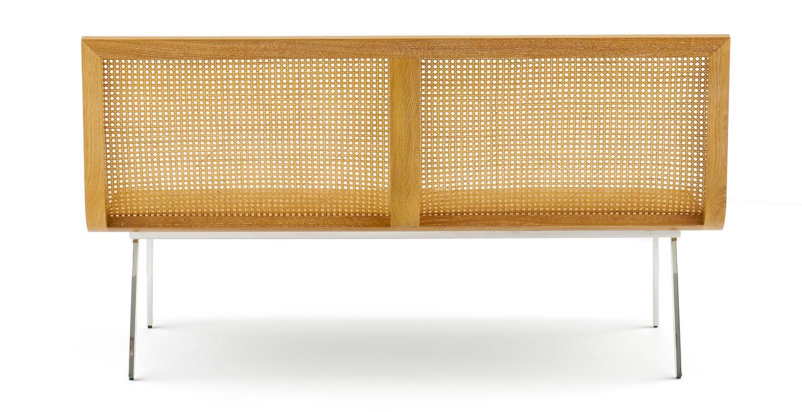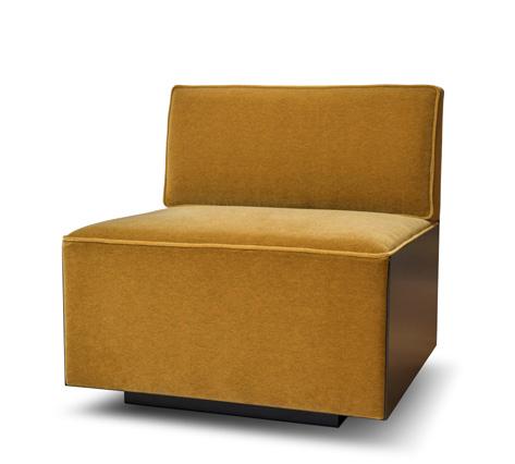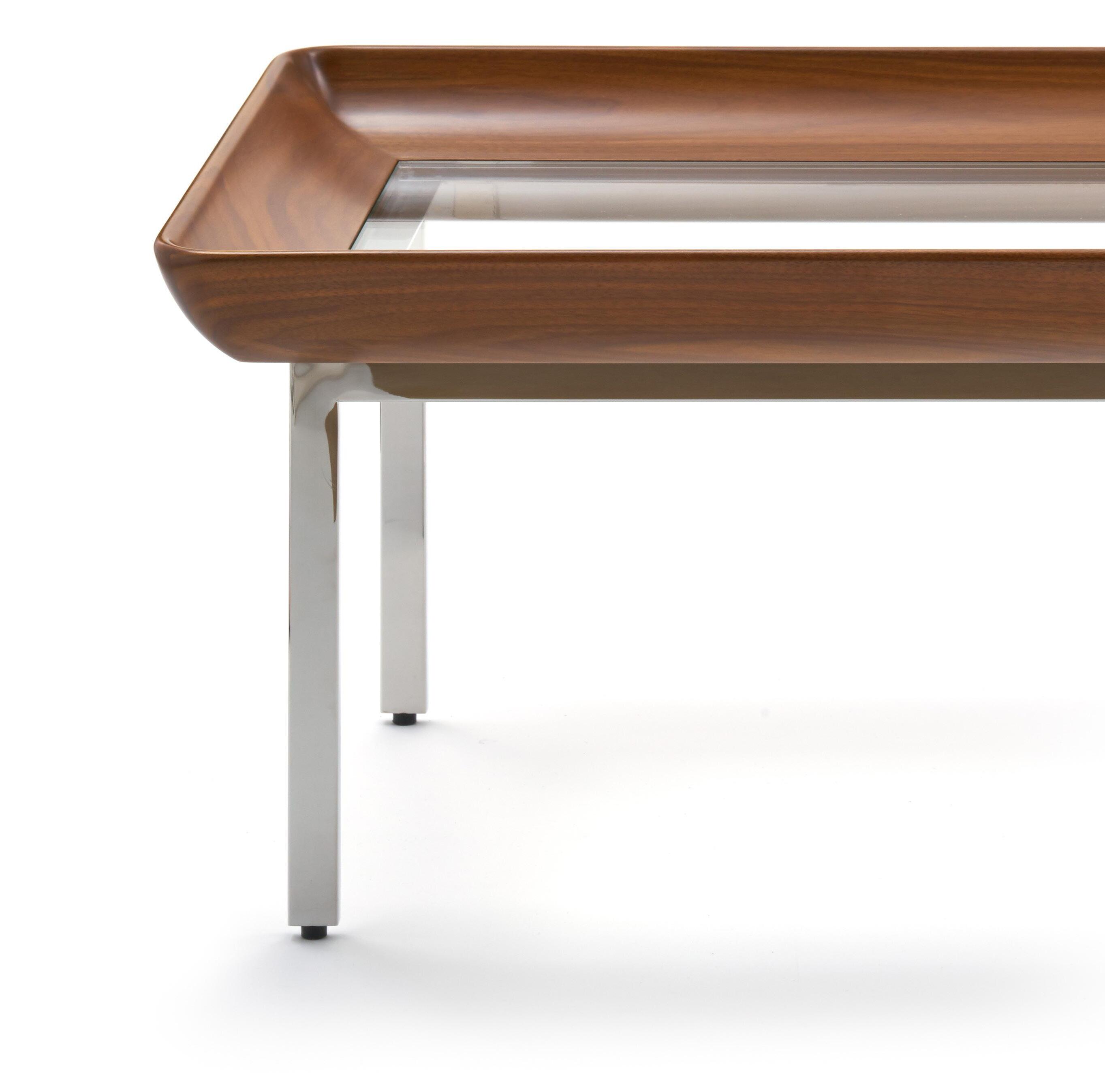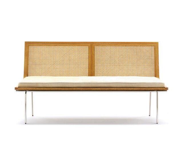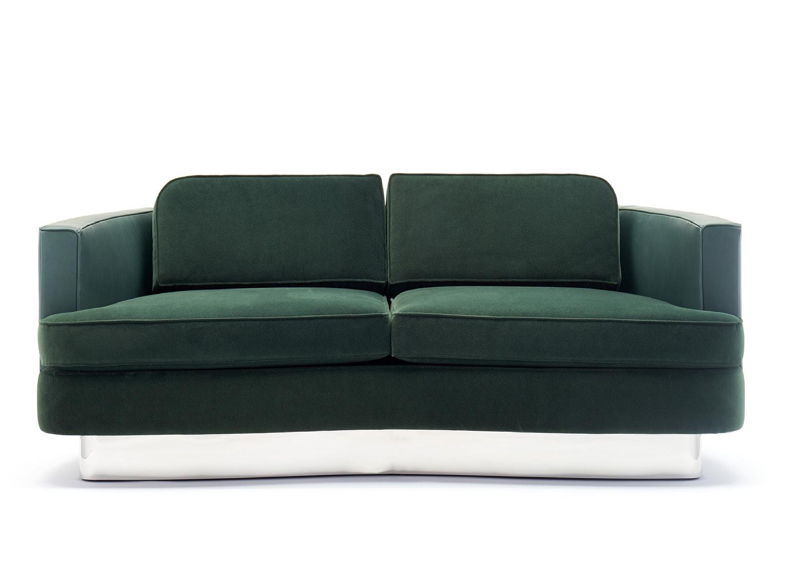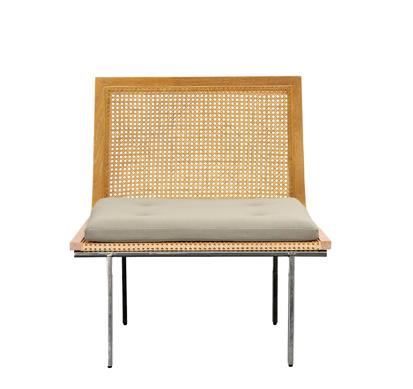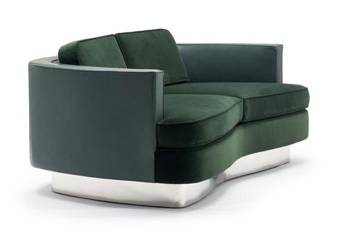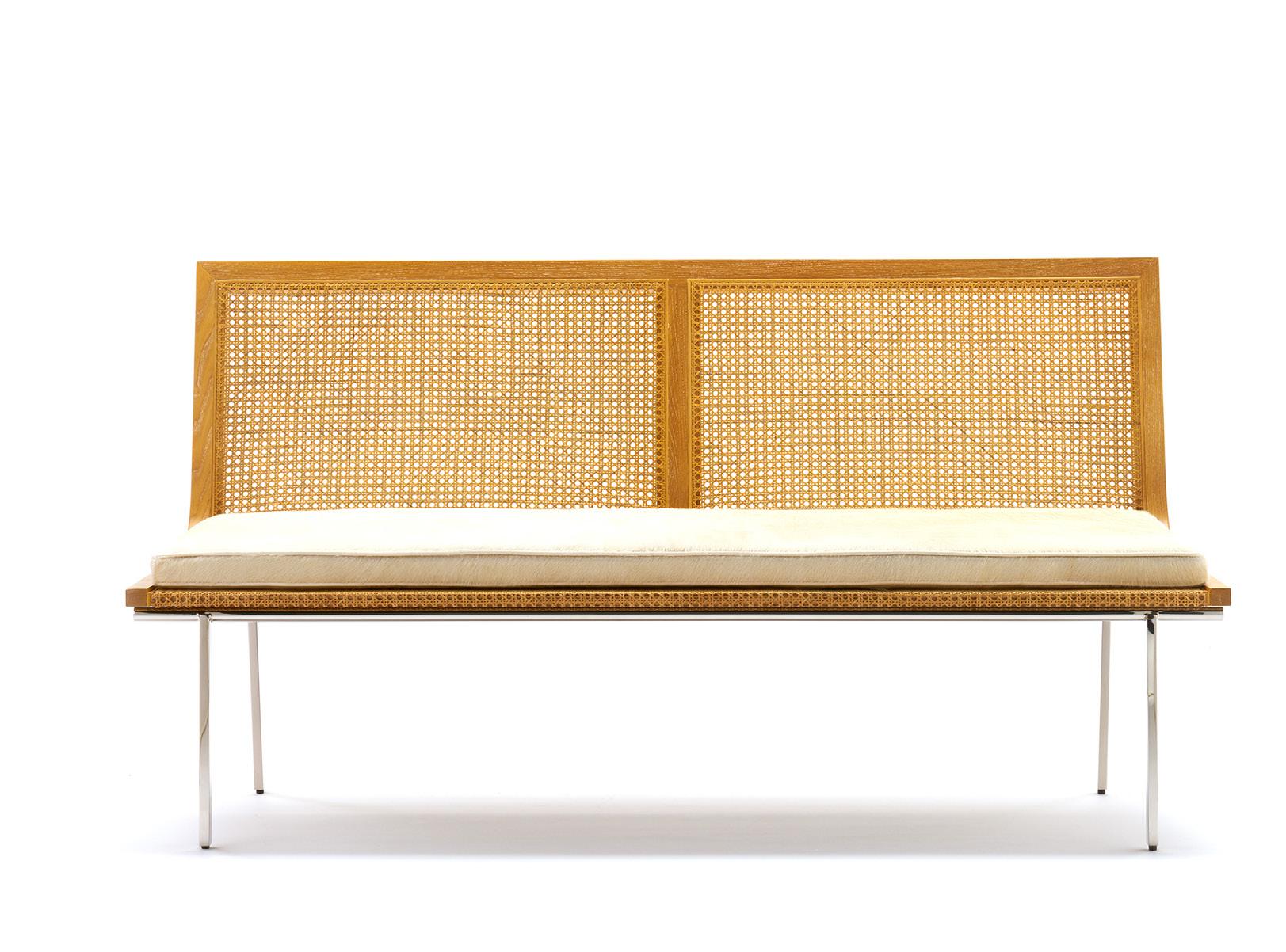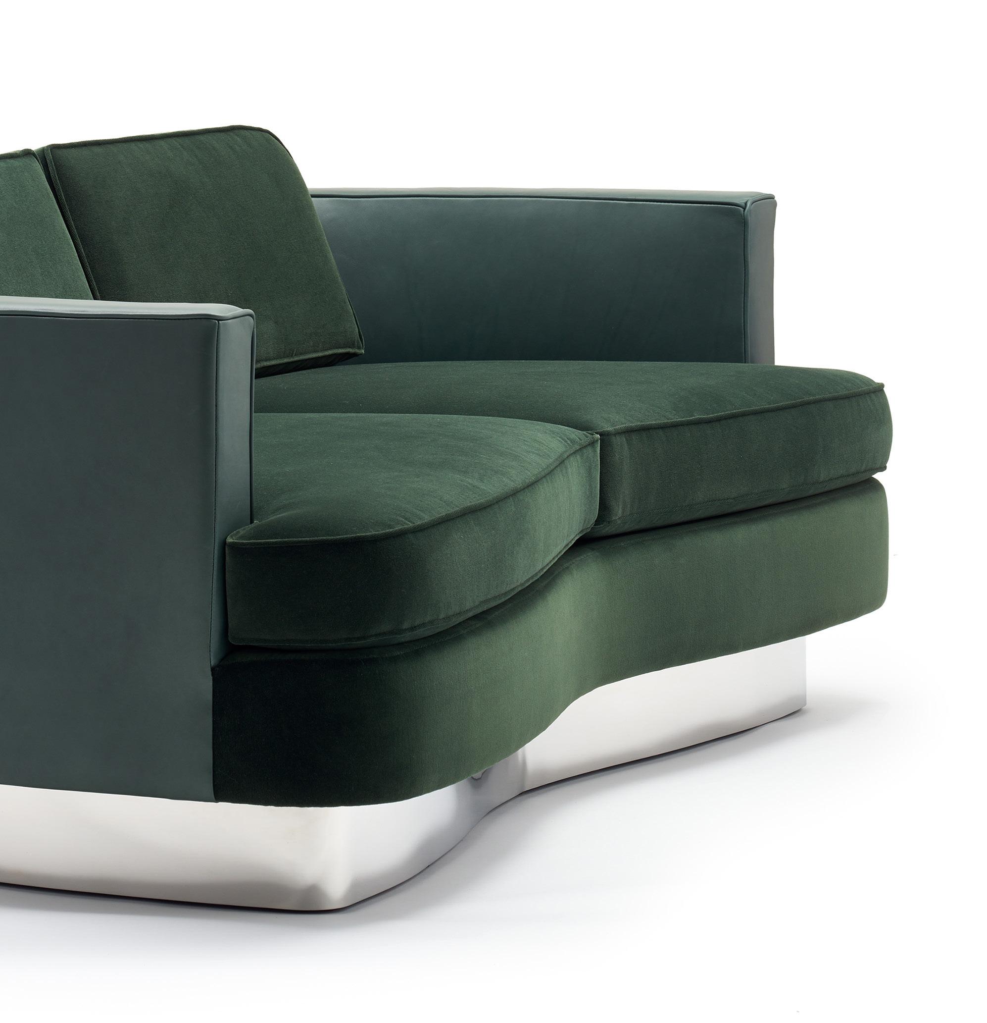 A wood base replaces the acrylic in this version of the New Canaan Sofa. The original was named after the location the renowned Glass House, a structure where the interior spaces are almost entirely visible from the outside. The New Canaan Lounge Chair is composed of an acrylic base to reveal the clean, architectural lines of the stainless-steel frame offering little distraction within its environment.