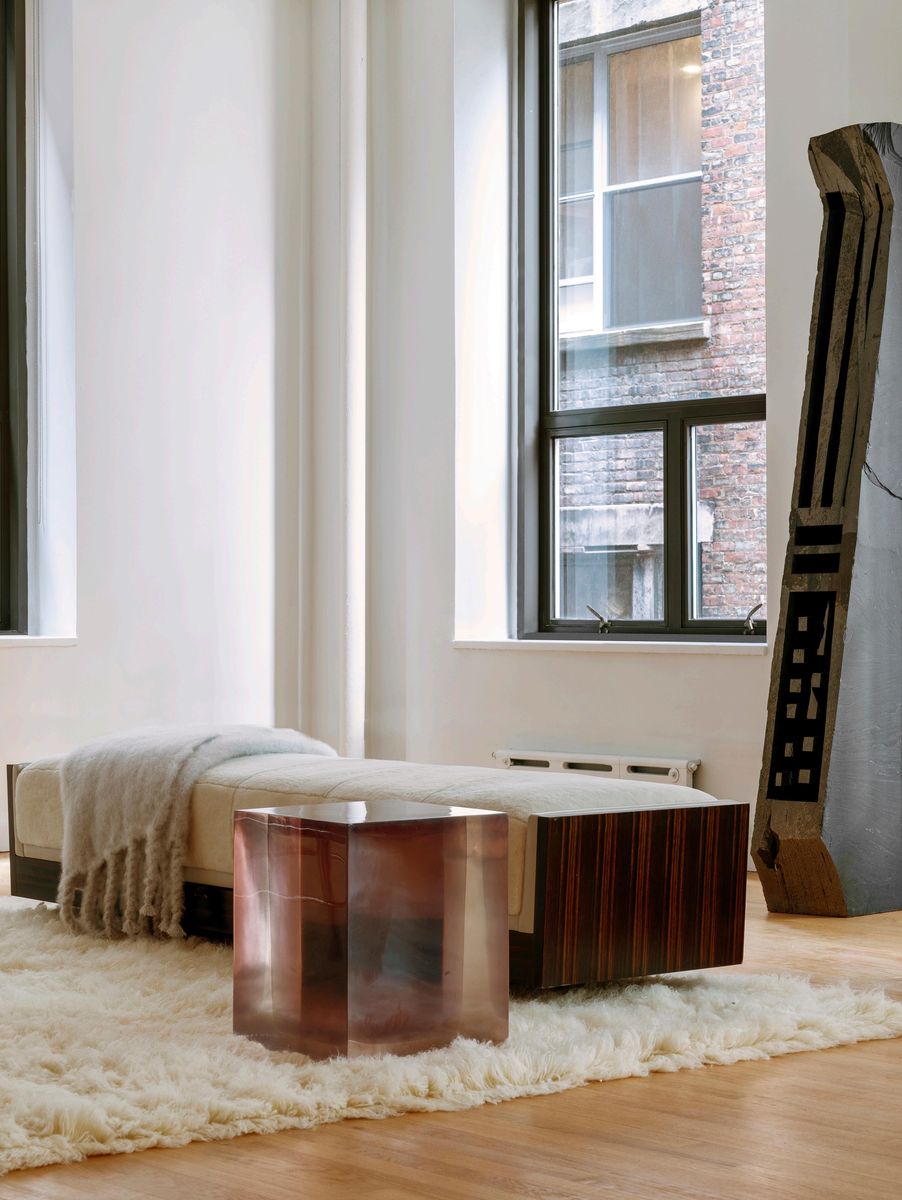 Integrating clear and colored resins in stunning simplicity, the Dark and Stormy Table both captures and casts light in the surrounding space to create playful shadows.
