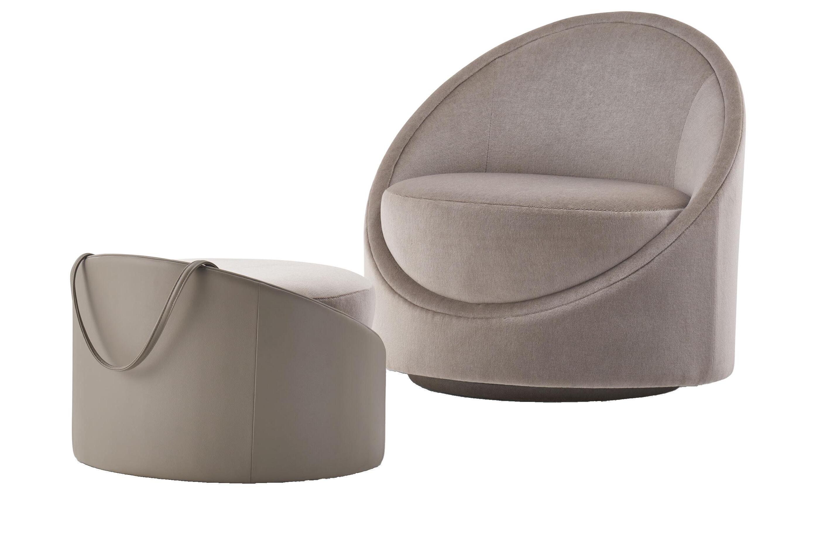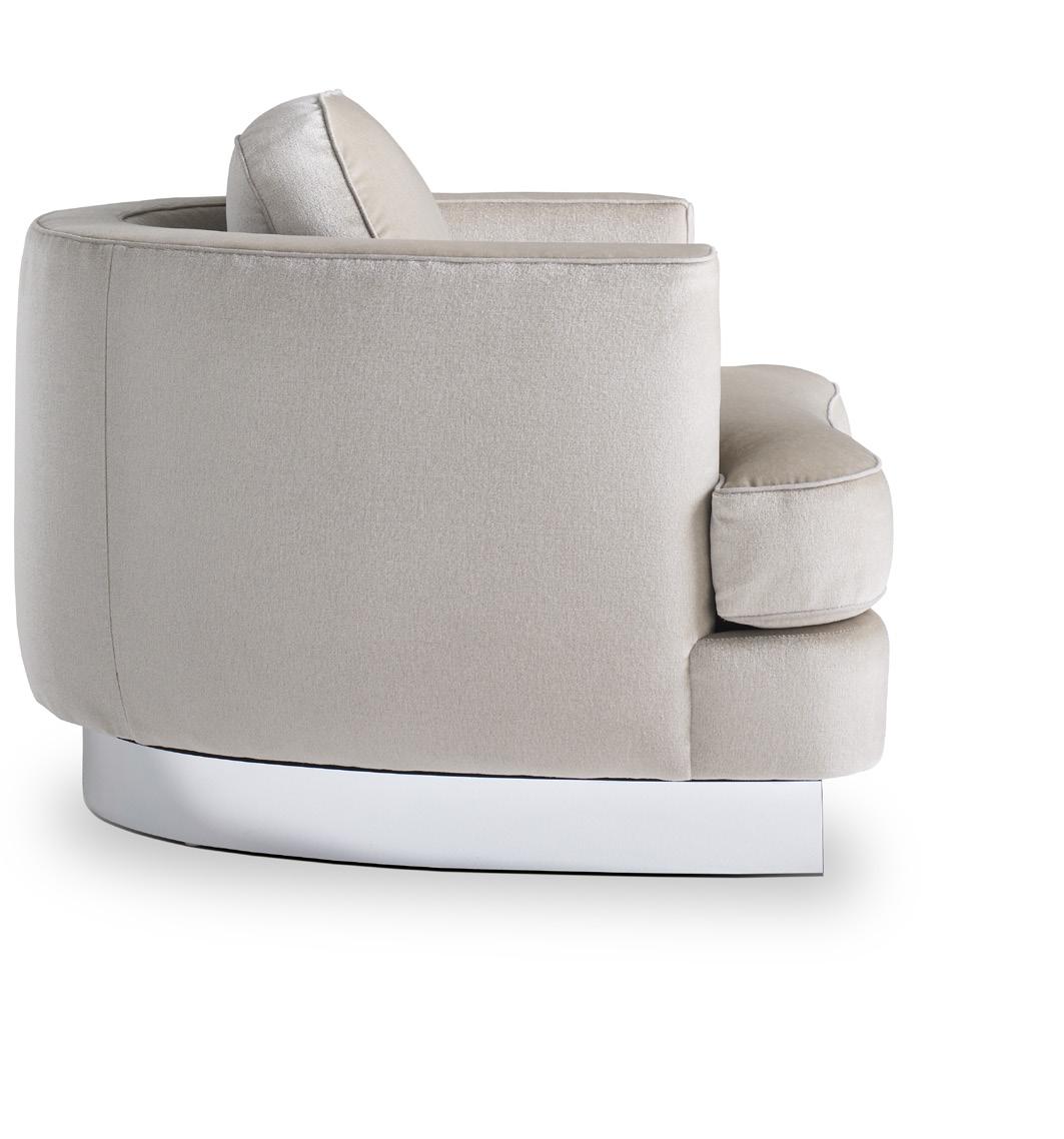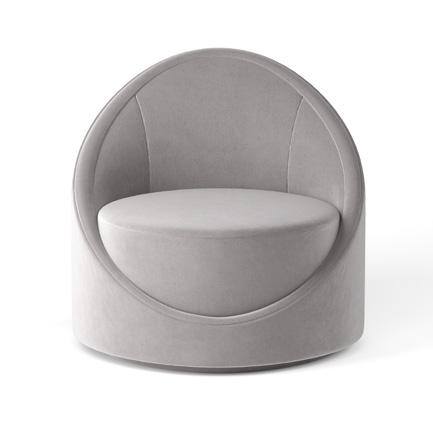 Upholstered in soft mohair, the Artis Chair is a study of the balance of form and function. It plays on sculptural forms with its circular seat and half-moon back and a cylindrical form. For added flexibility, it sits on a swivel base to allow its occupant to turn to engage in conversation or away to take in the view. Ottoman sold separately.