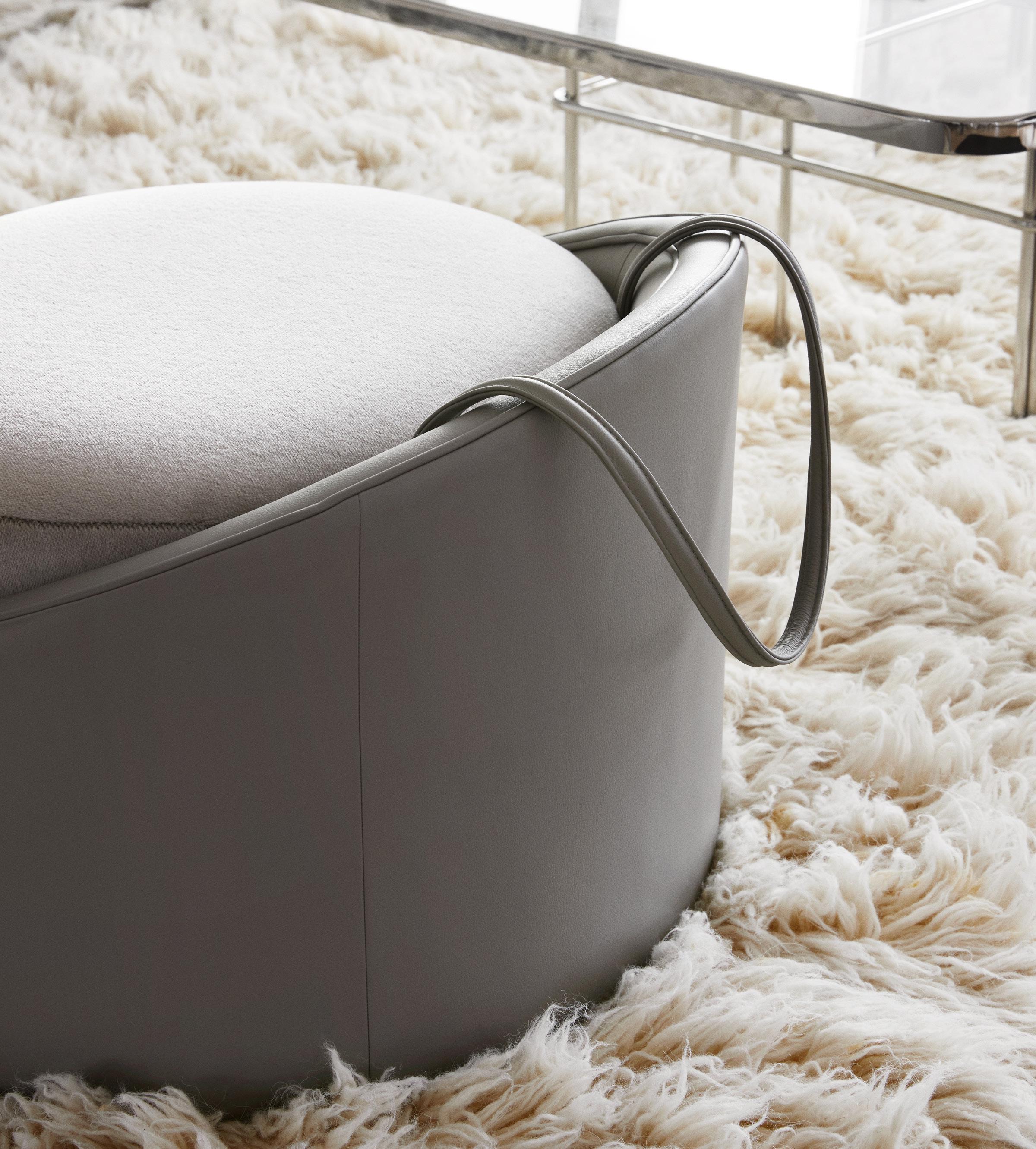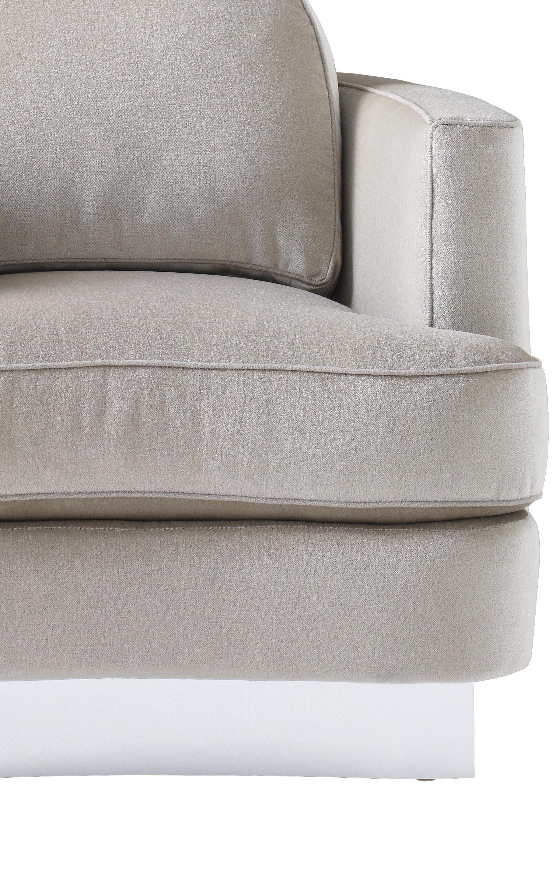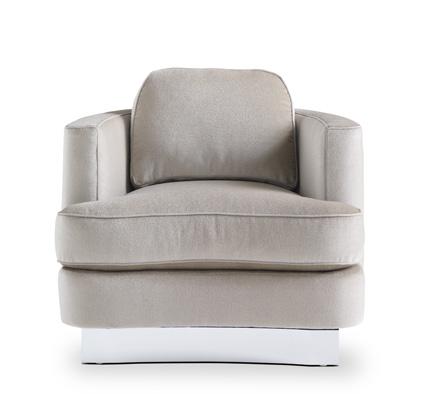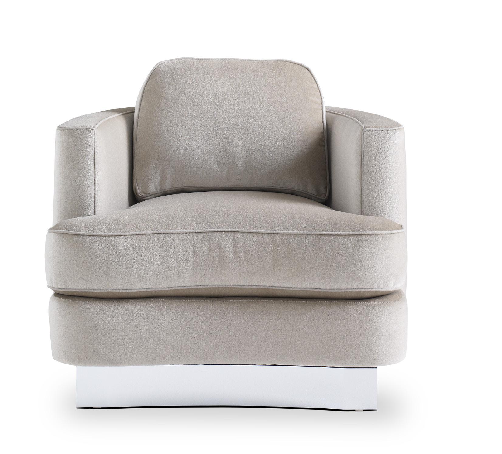 Upholstered in soft mohair, the Artis Chair is a study of the balance of form and function. It plays on sculptural forms with its circular seat and half-moon back and a cylindrical form. For added flexibility, it sits on a swivel base to allow its occupant to turn to engage in conversation or away to take in the view. Ottoman sold separately.