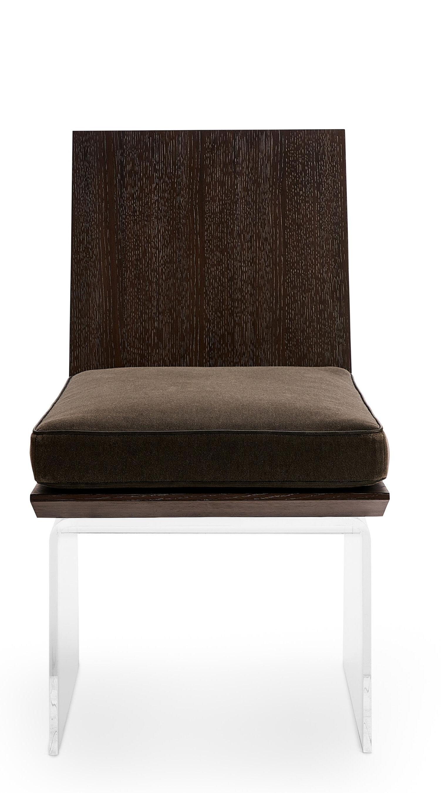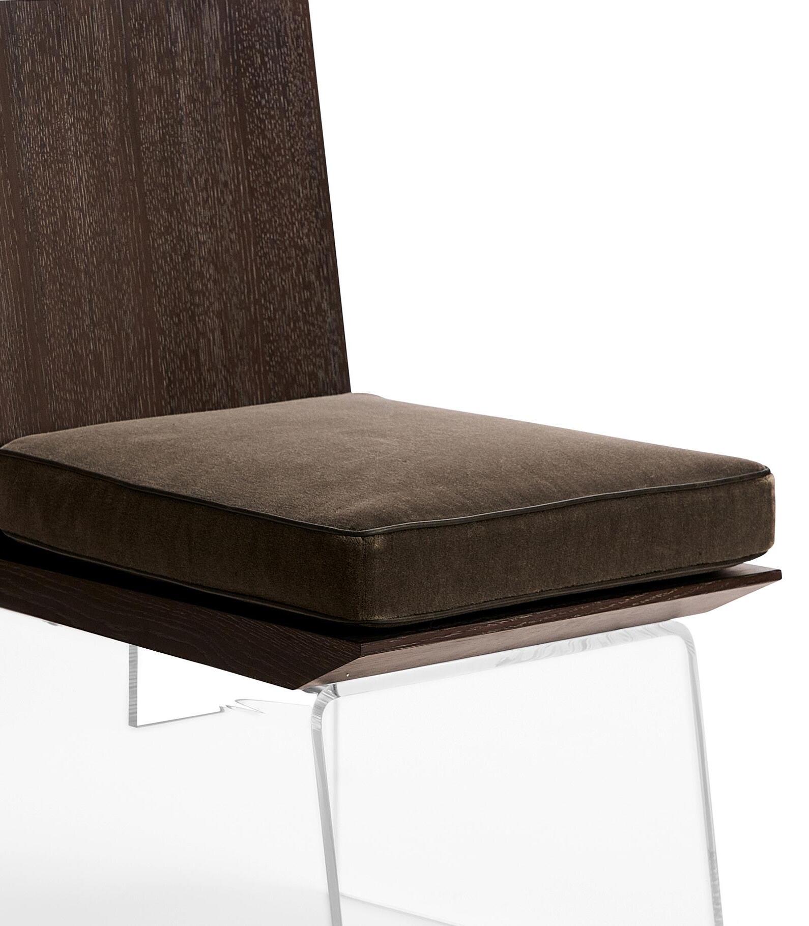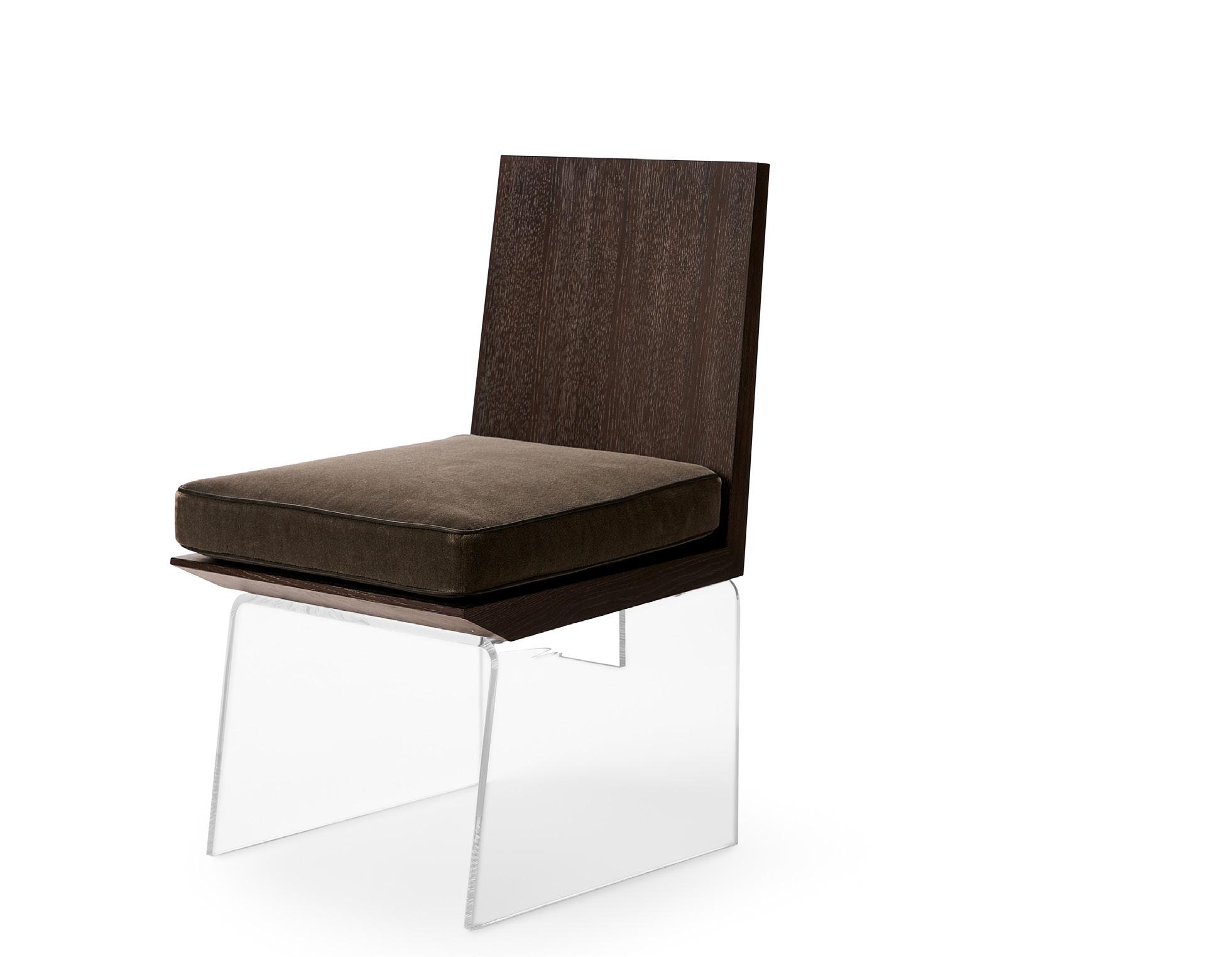 Handcrafted from solid walnut, the wide and angular lounge-like frame includes a transparent acrylic seat and back that gives the illusion as if the hollow structure is floating while casting playful shadows within its setting.