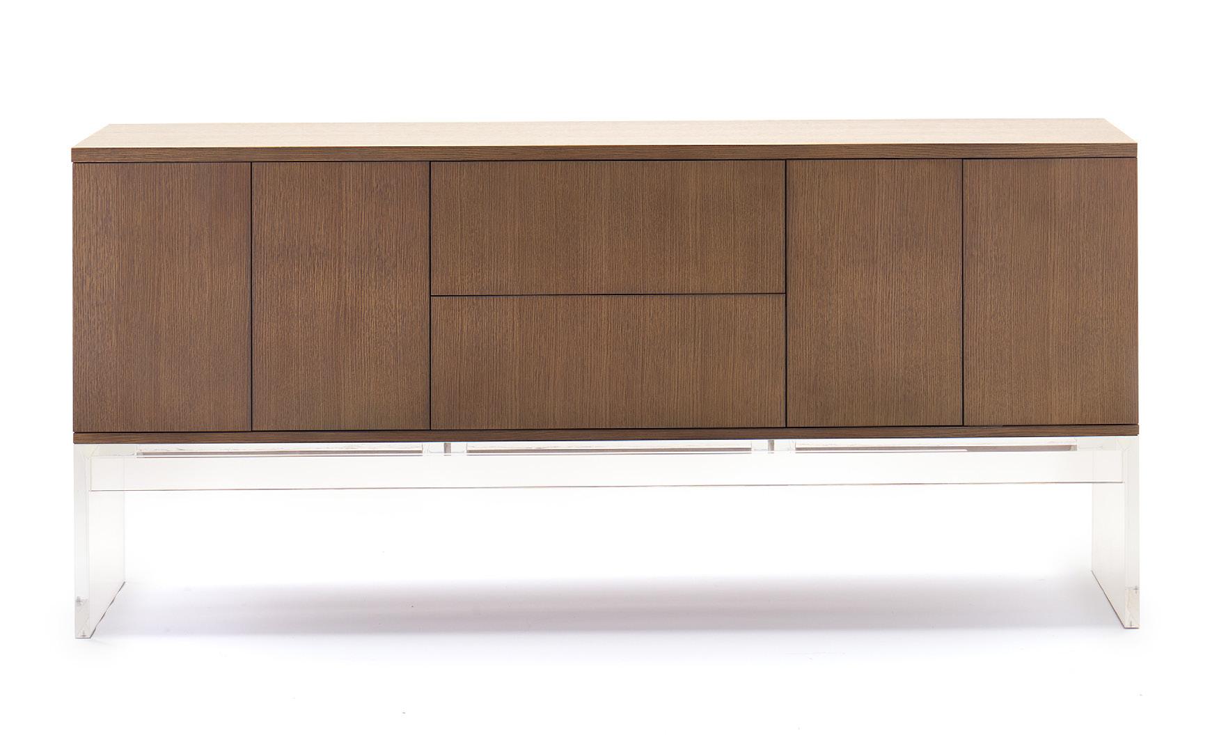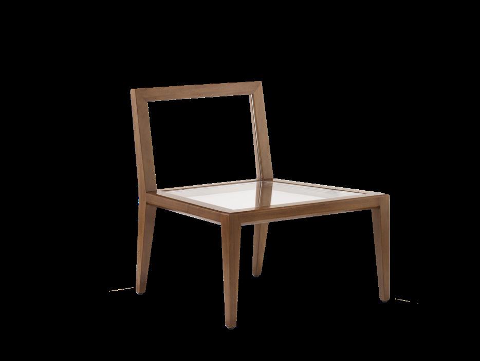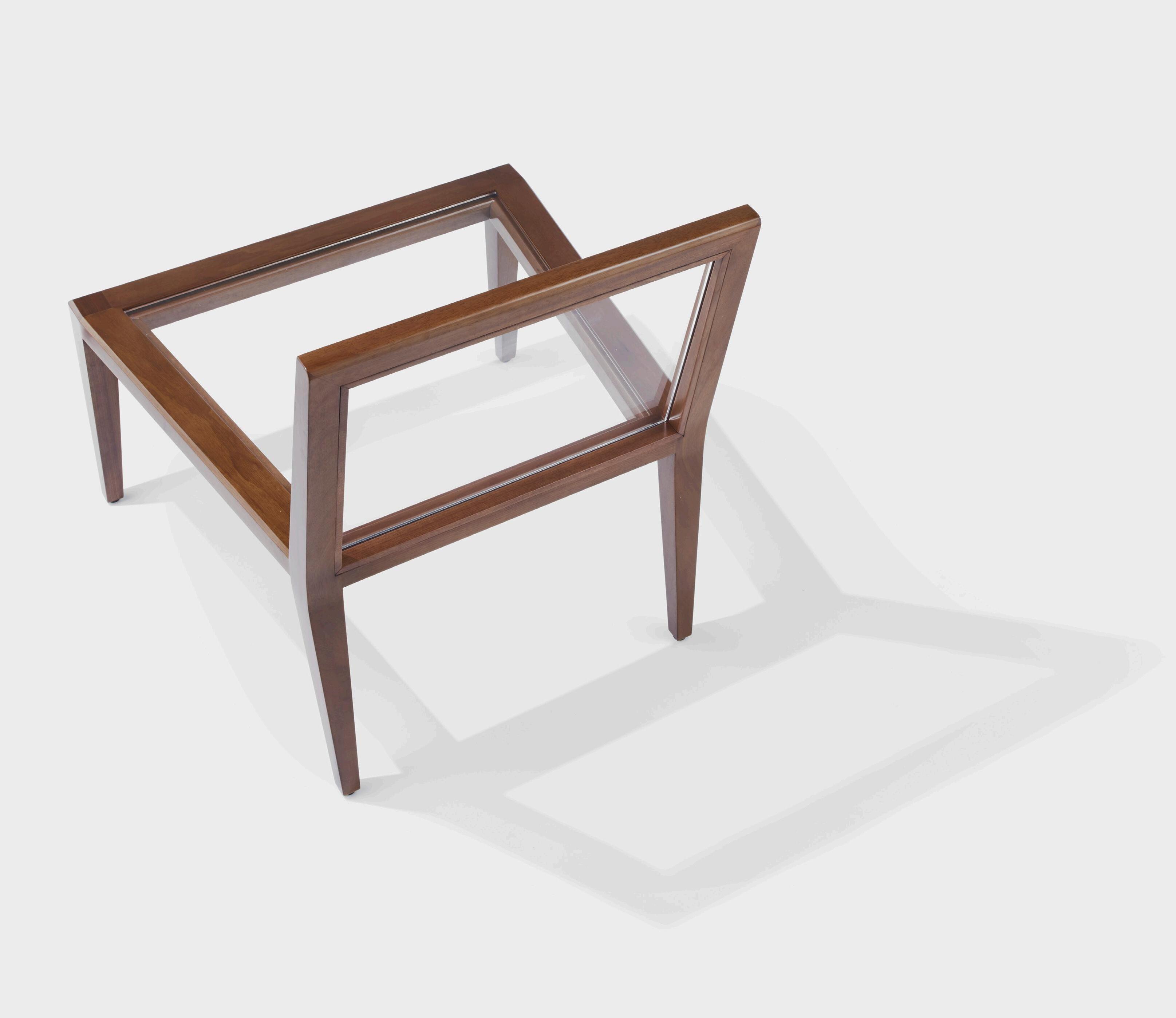 Handcrafted from solid walnut, the wide and angular lounge-like frame includes a transparent acrylic seat and back that gives the illusion as if the hollow structure is floating while casting playful shadows within its setting.