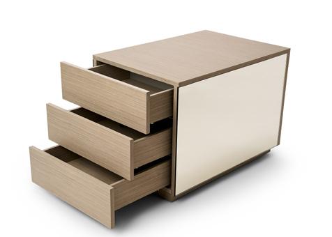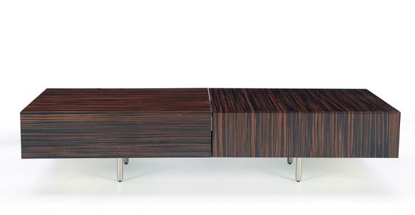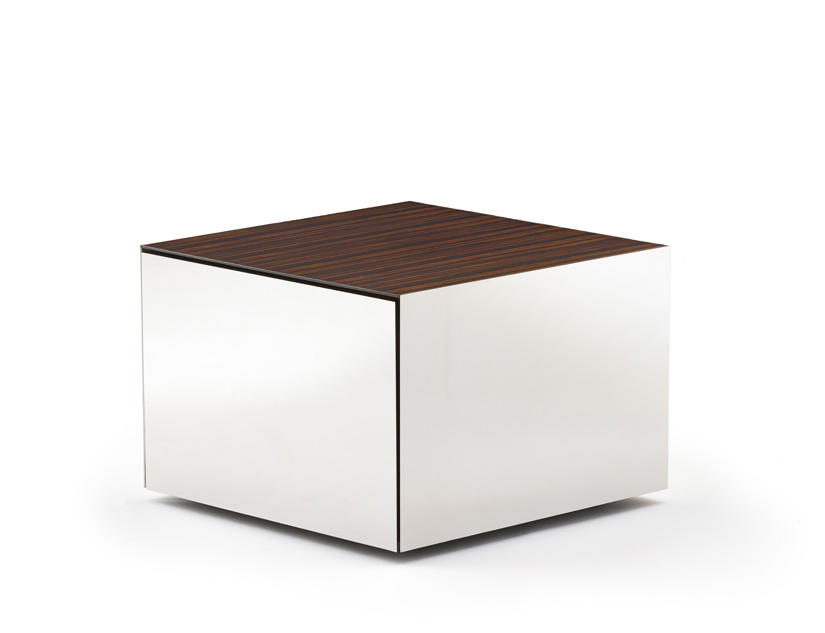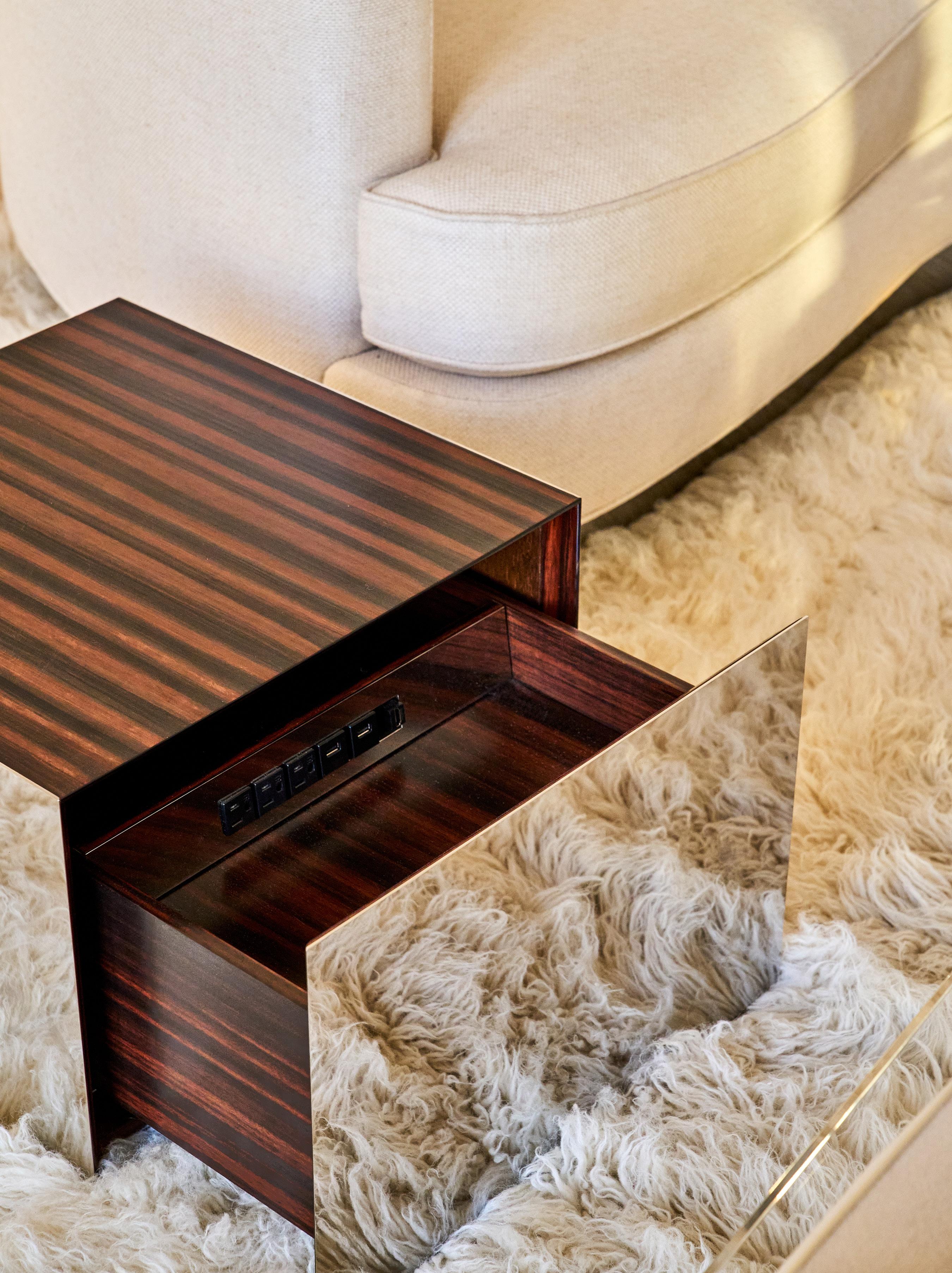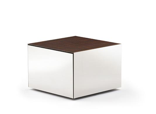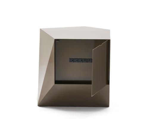 The Powerful Cube Table has a quarter-cut, non-figured wood top, and a polished stainless steel base. Its polished metal facade exudes energy by reflecting movement and light and its internal functionality offers recharging and power capabilities for a variety of devices. Simply tap the hidden drawer in the front and the face opens to provide access to power outlets and a hidden storage compartment.