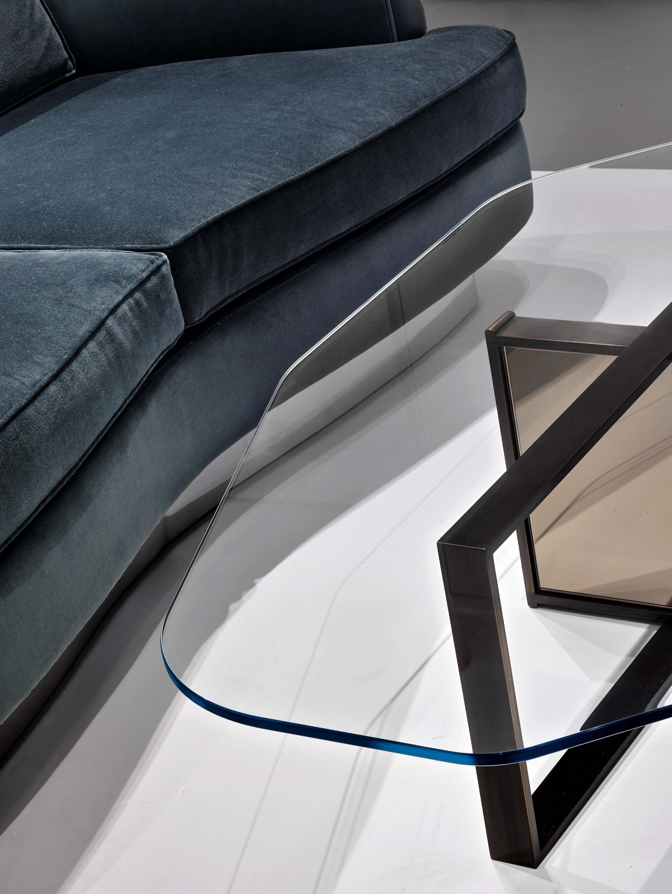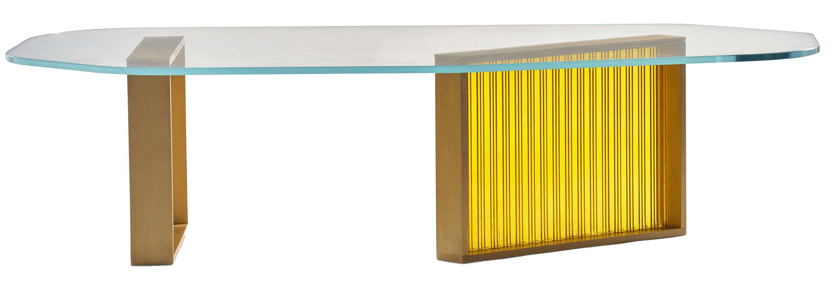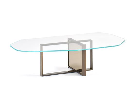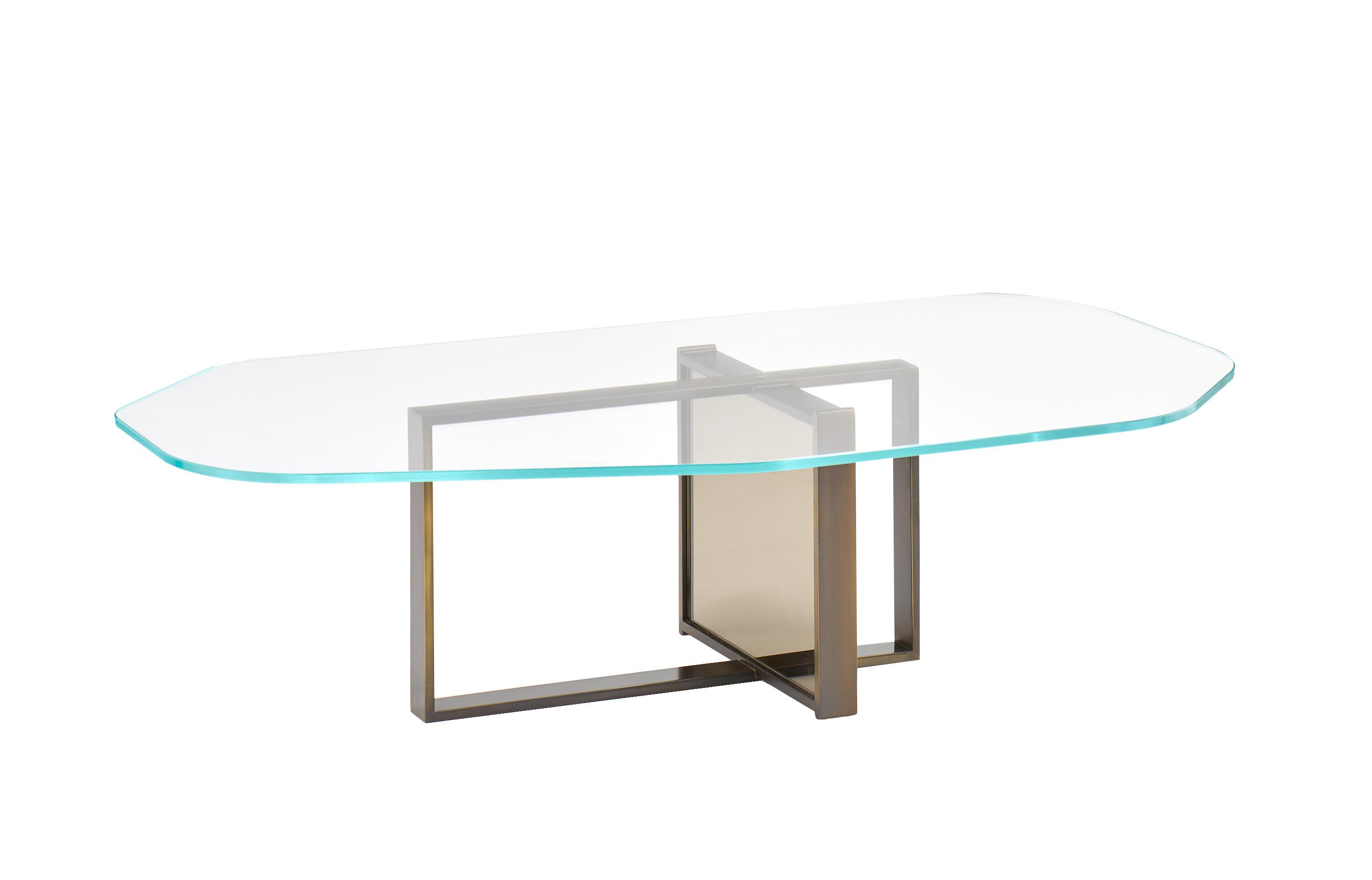 With its irregular tempered glass top and its bronze and cast glass base, the Cross Bar Table is akin to a vintage piece of jewelry, it accessorizes any space.