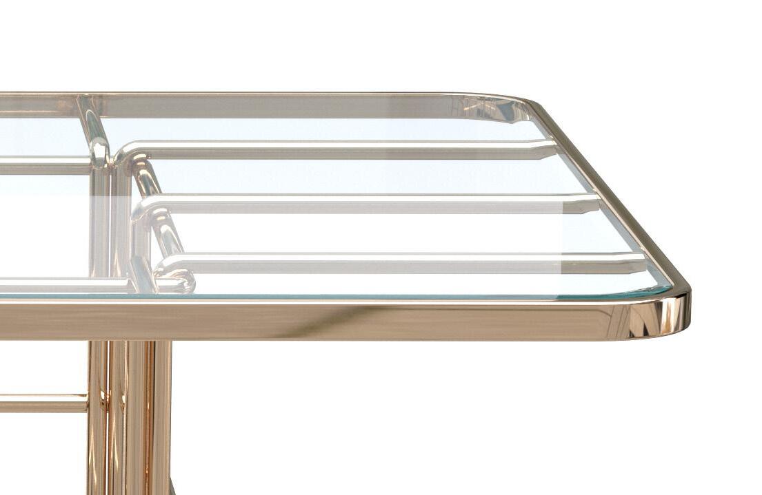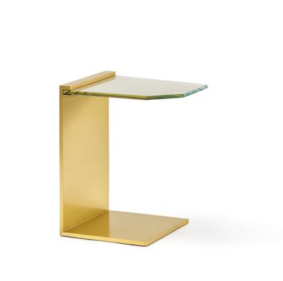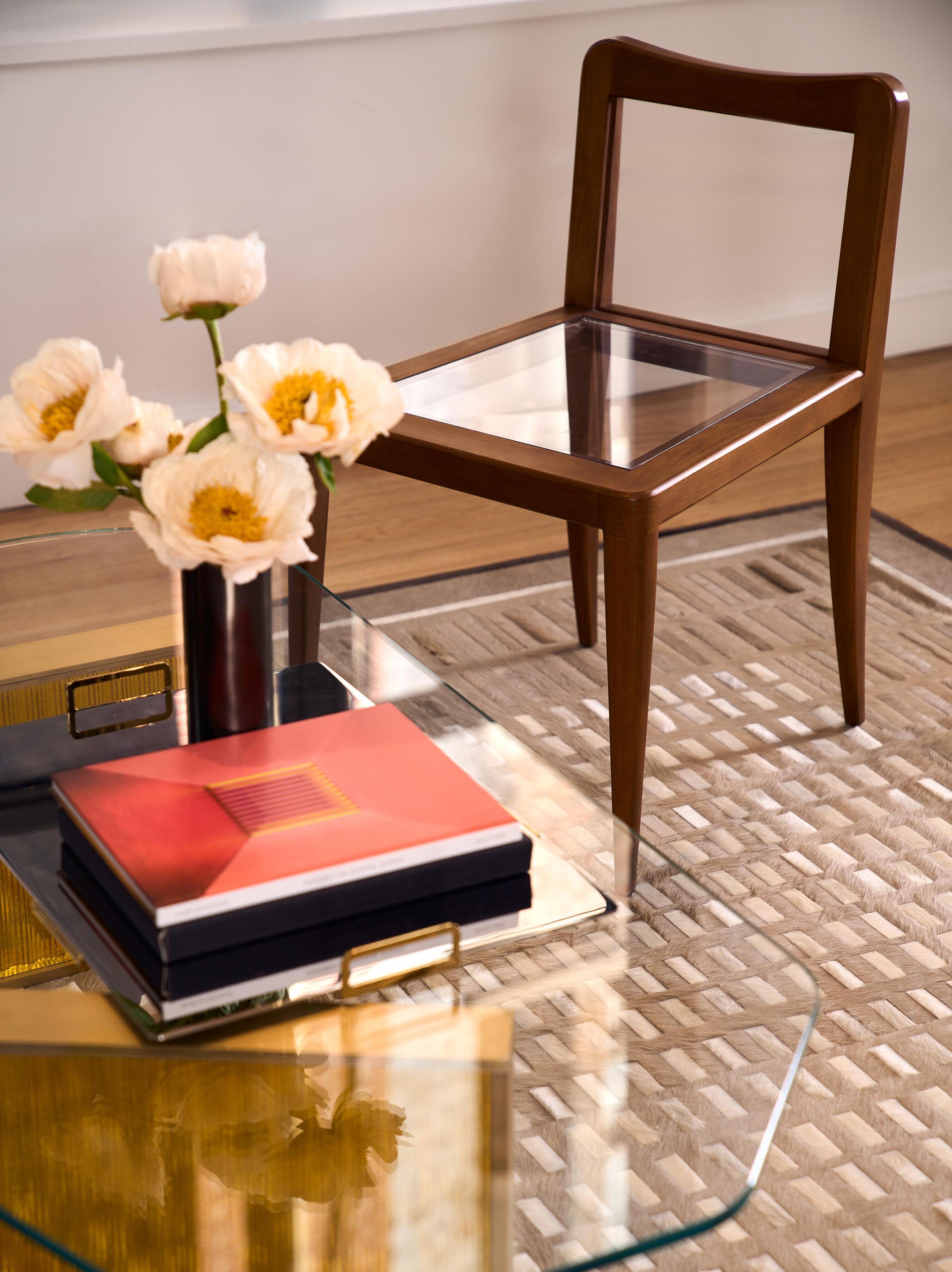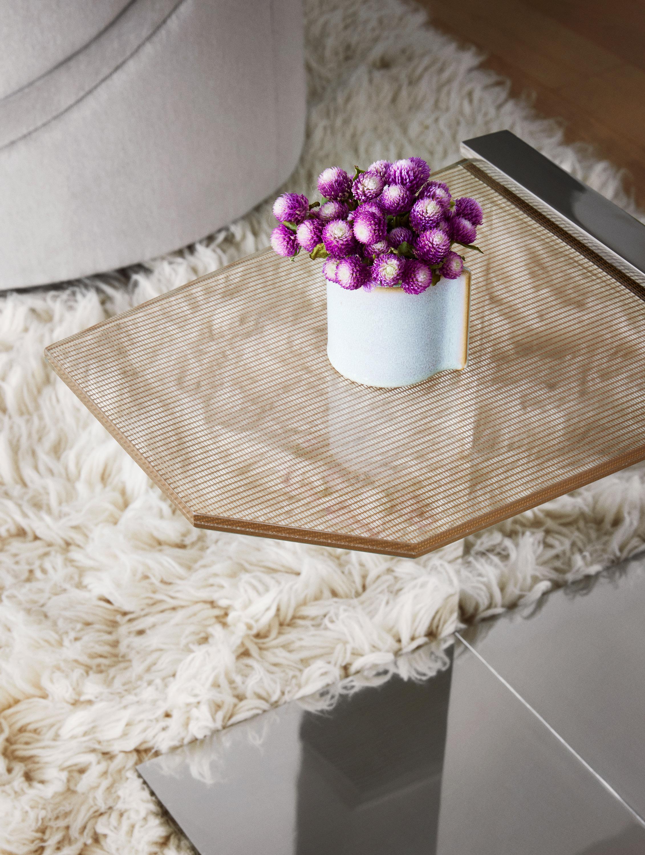 With its irregular tempered glass top and its bronze and cast glass base, the Cross Bar Table is akin to a vintage piece of jewelry, it accessorizes any space.