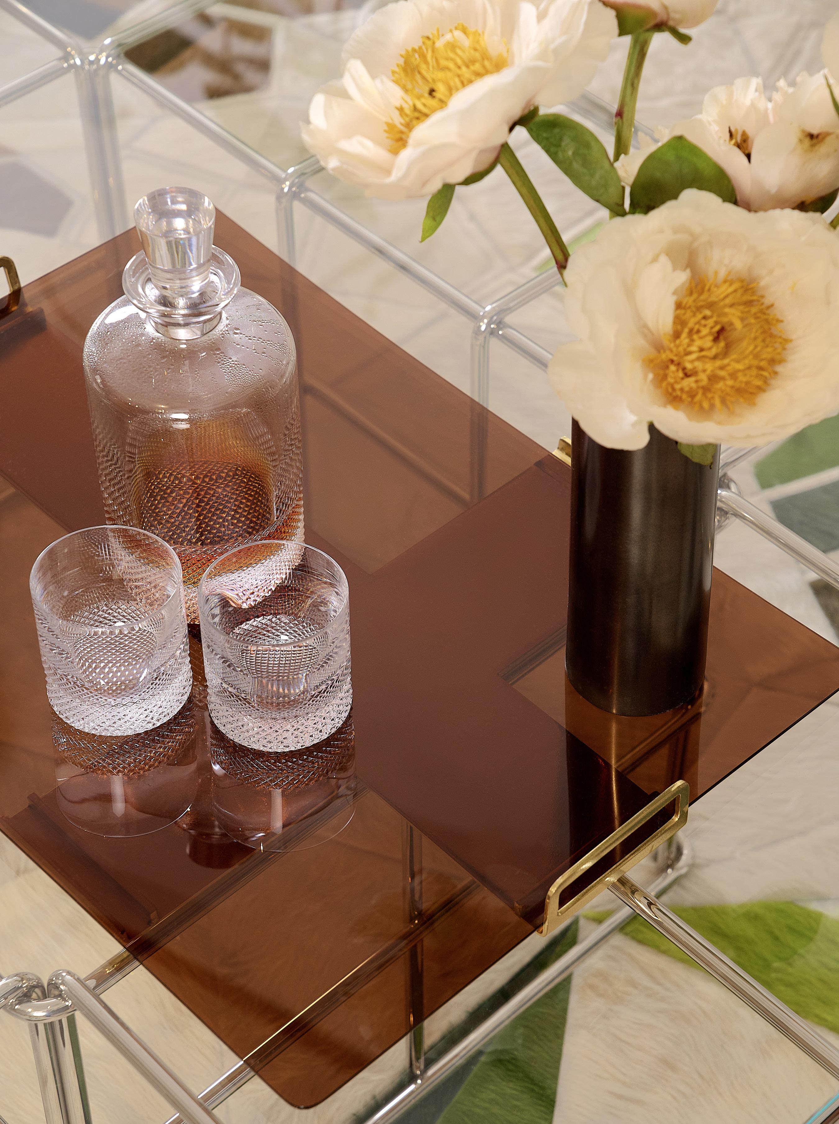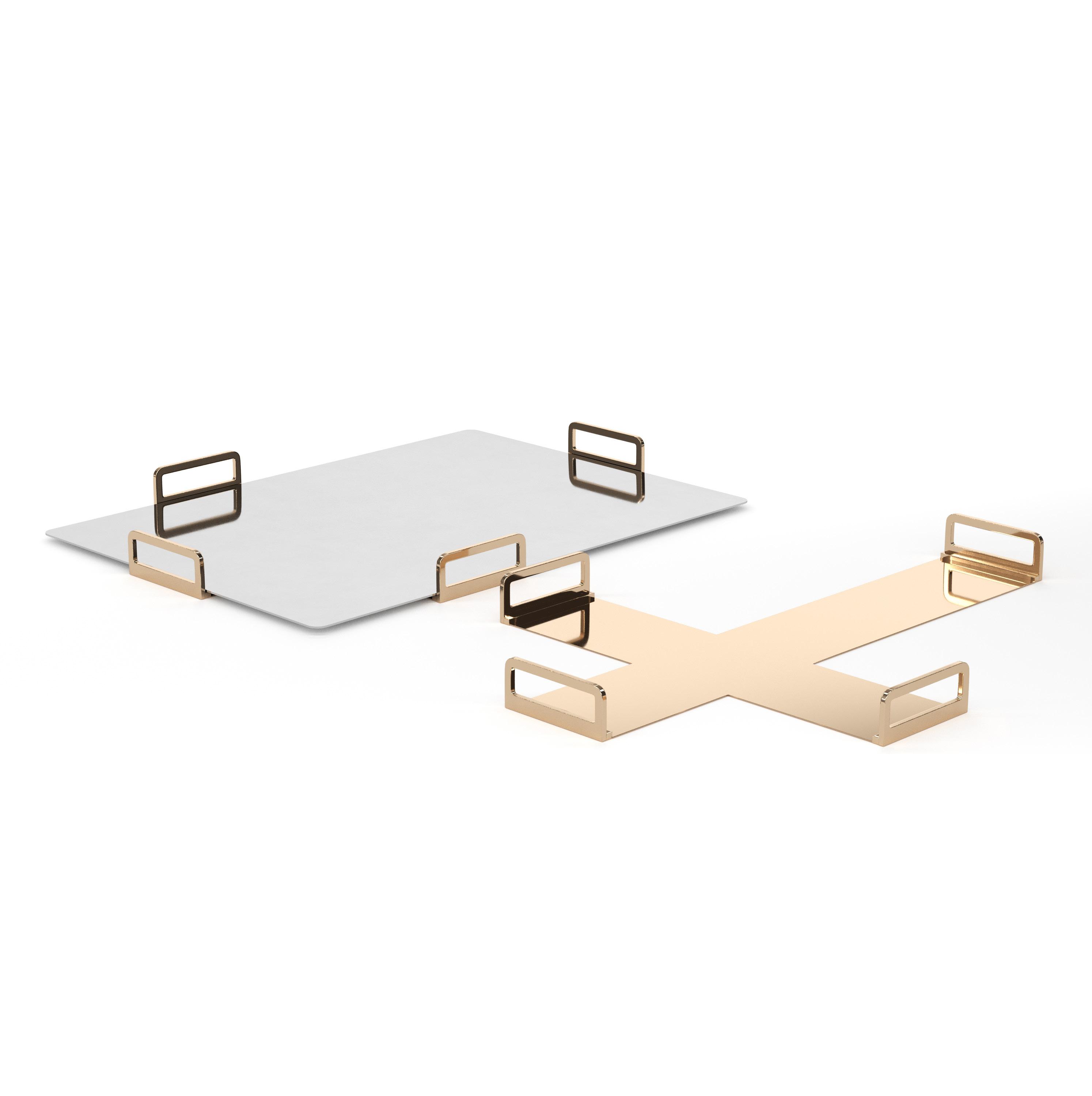 The T Tray adds instant glamour to any setting. A serious statement piece that is at once both ornamental and functional, the polished metal cross tray is available with a polished brass or stainless steel frame and can be customized by selecting from a range of beautiful glass and acrylic inserts. t tray | cubist