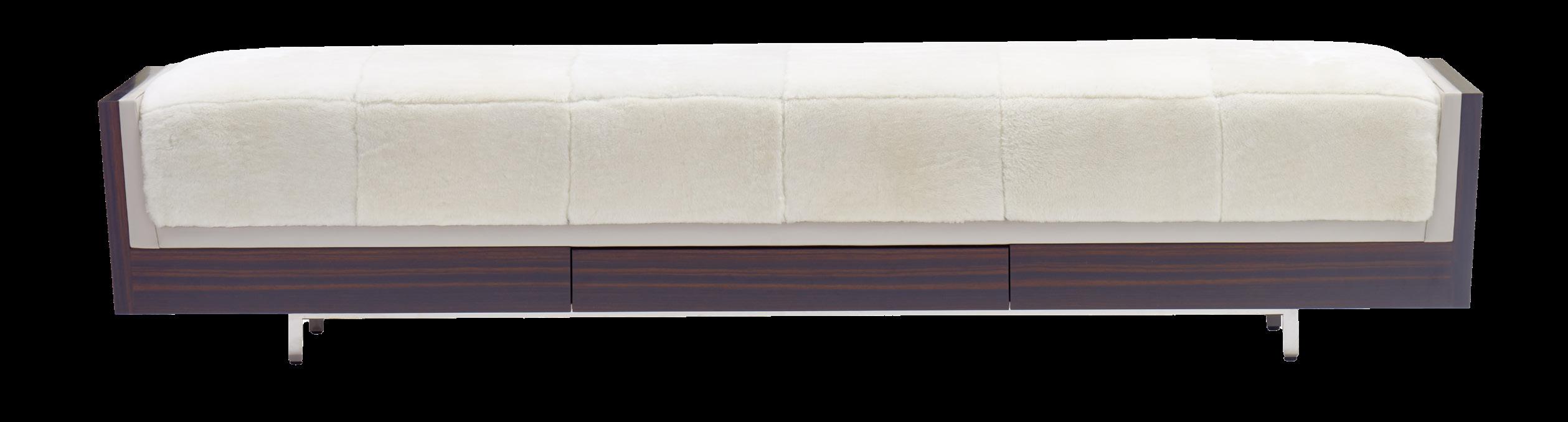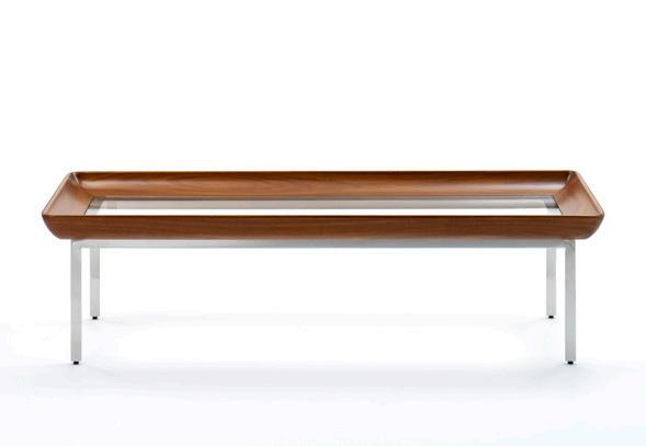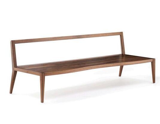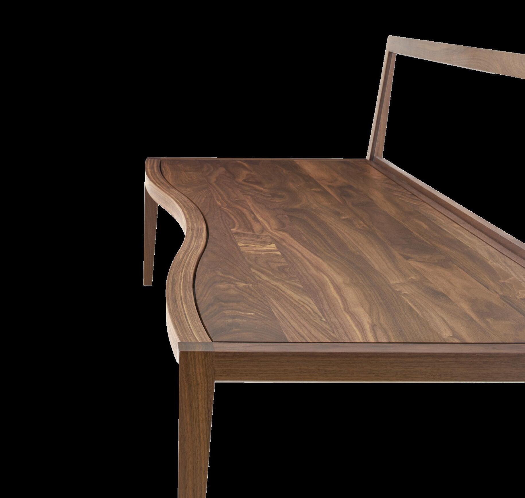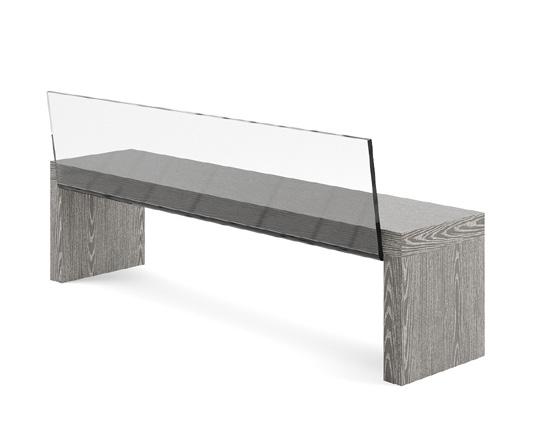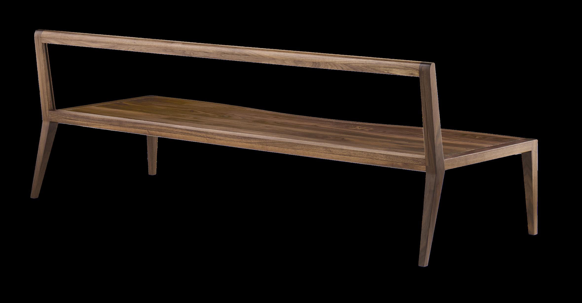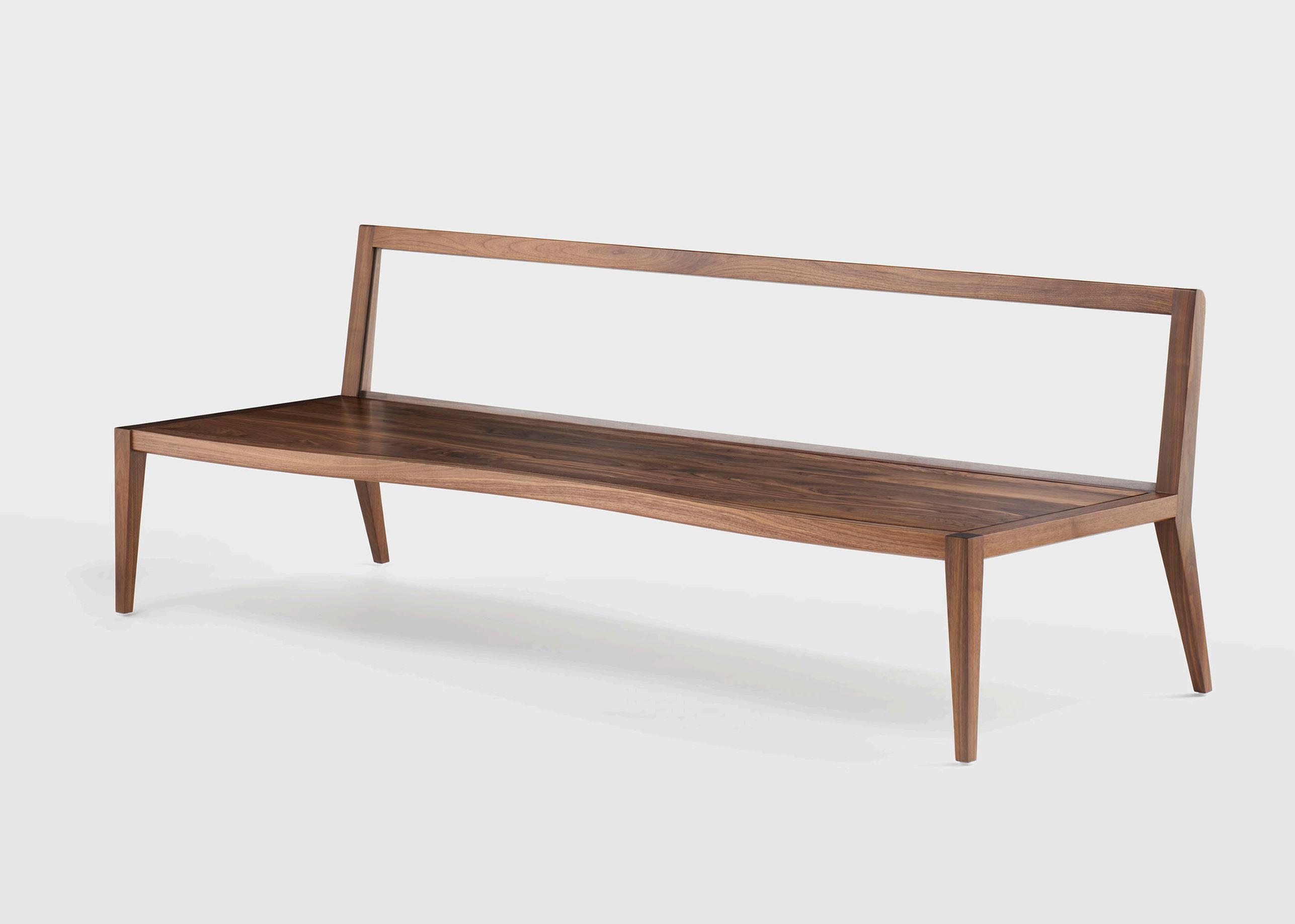 Handcrafted from solid walnut, the seat is elegantly curved in contrast with the structured back, which is supported by transparent acrylic and acts as an interactive picture frame to capture the everchanging environment in which it sits. Captivating and intriguing the Wood Float Bench can stand alone with its beautiful exposed walnut finish or can be adorned with custom cushions in a variety of fabrics for additional support and comfort.