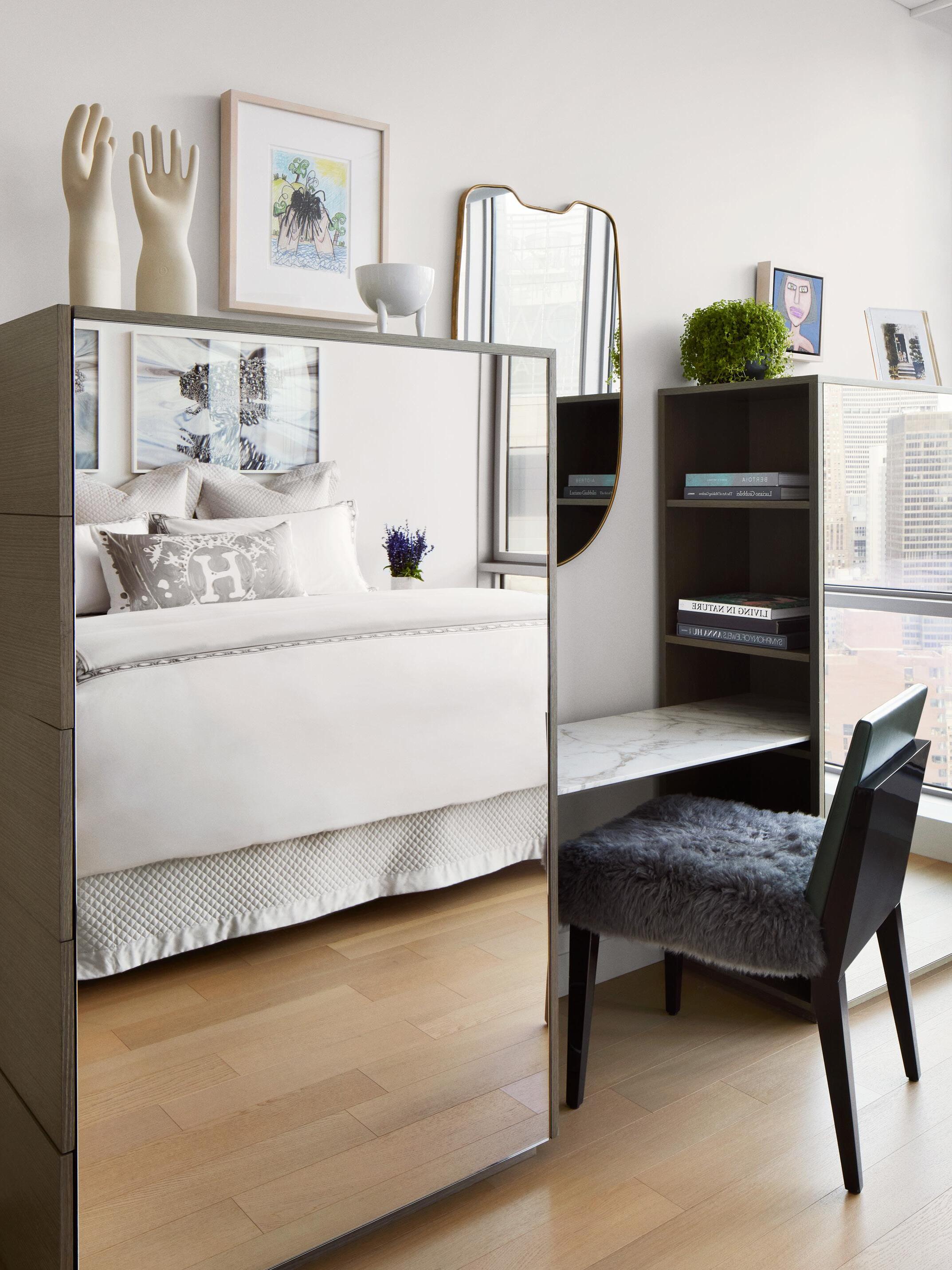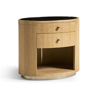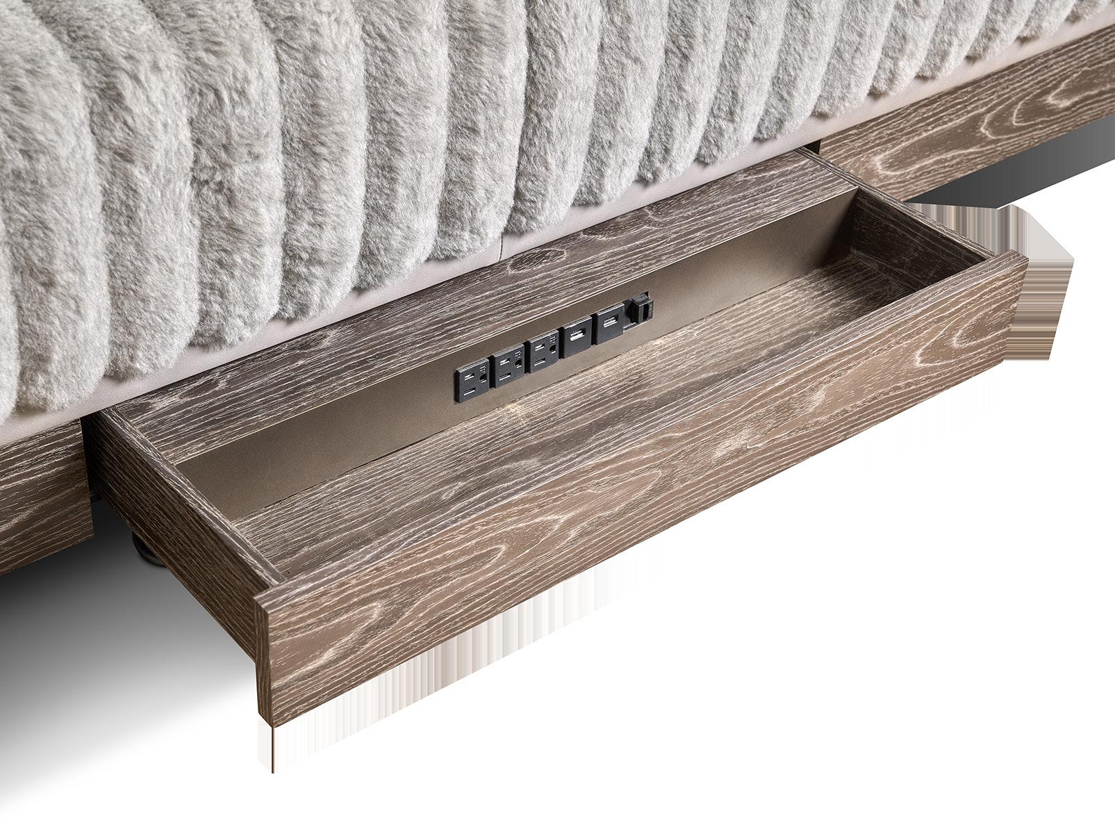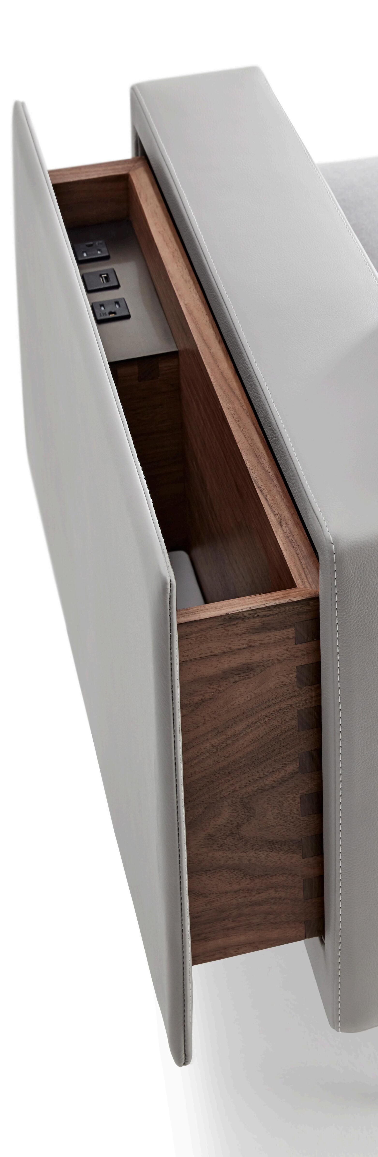 Sleek and contemporary, the Essex Bed is constructed of a wooden frame with a leather headboard wrapped in metal banding. Convenient wooden nightstands with concealed drawers are recessed within a mirrored cavity on each side of the headboard which features integrated lighting control at the touch of an inconspicuous button to offer a warm and peaceful reflection of indirect light.