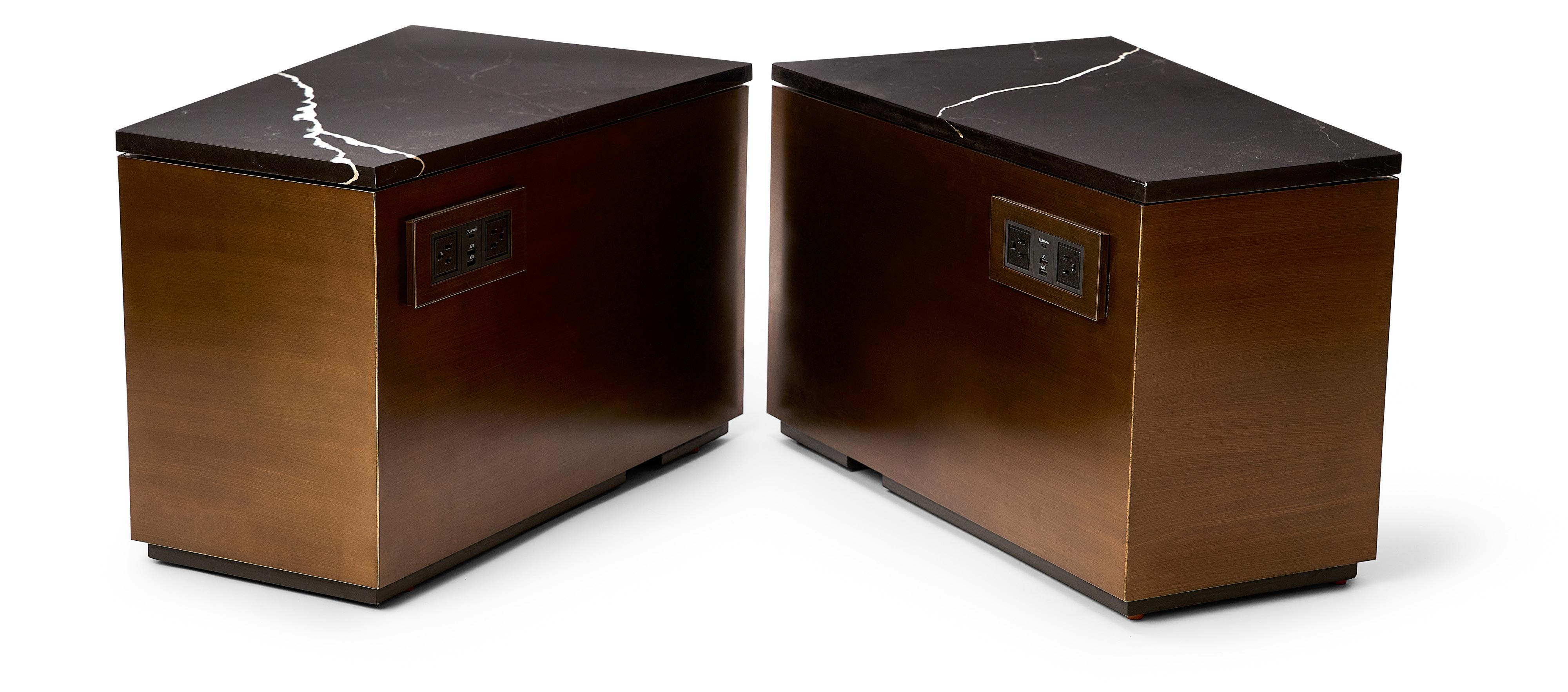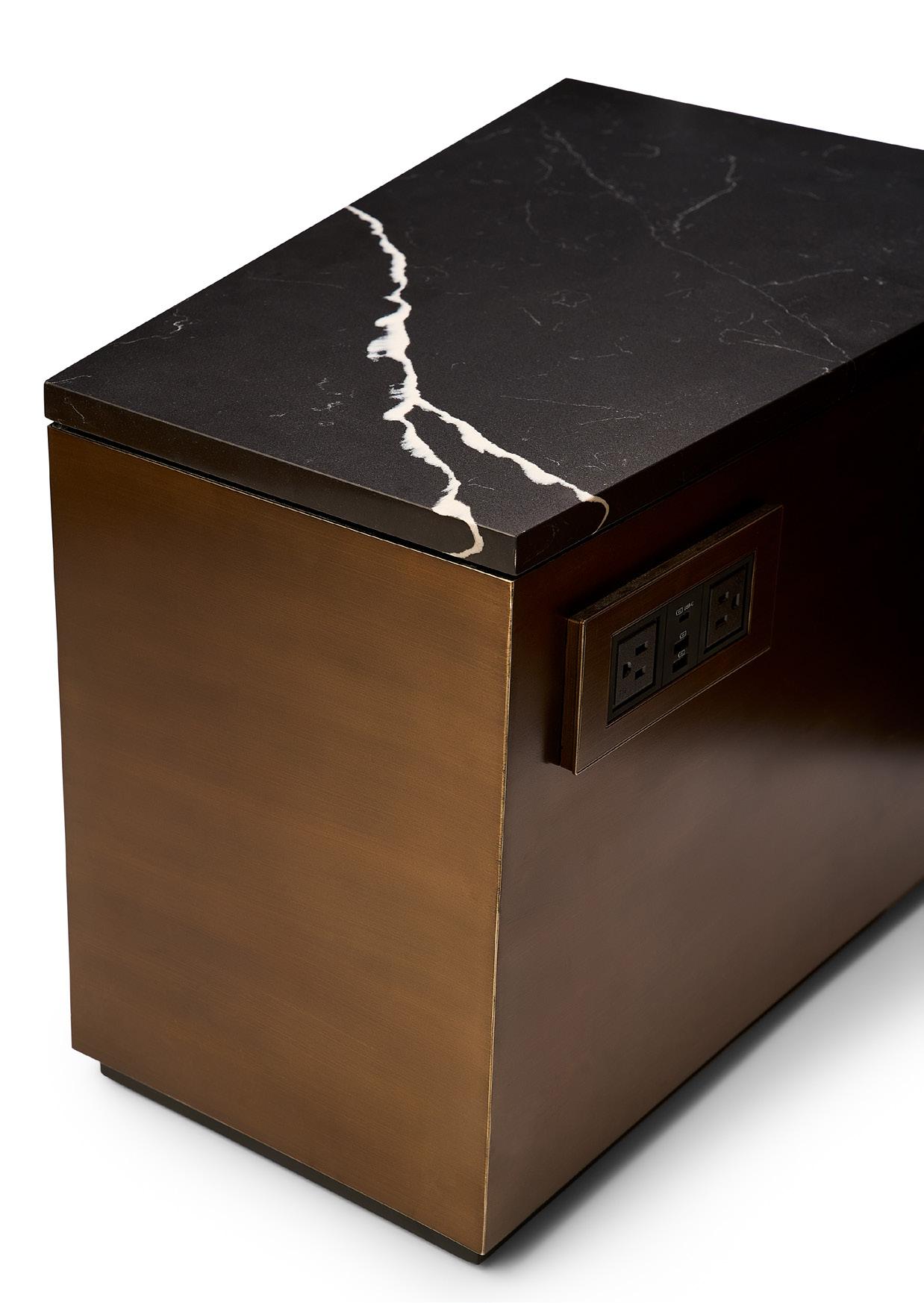 Designed to offer convenience in tight or irregularshaped spaces, the Powerful Side Table is comprised of a metal base with stone top and features two integrated NEMA 5-15 outlets as well as two USB ports and a USB-C port to keep you charged.