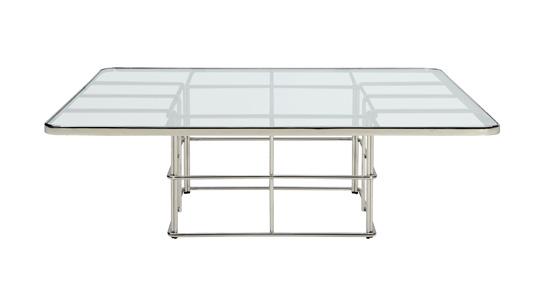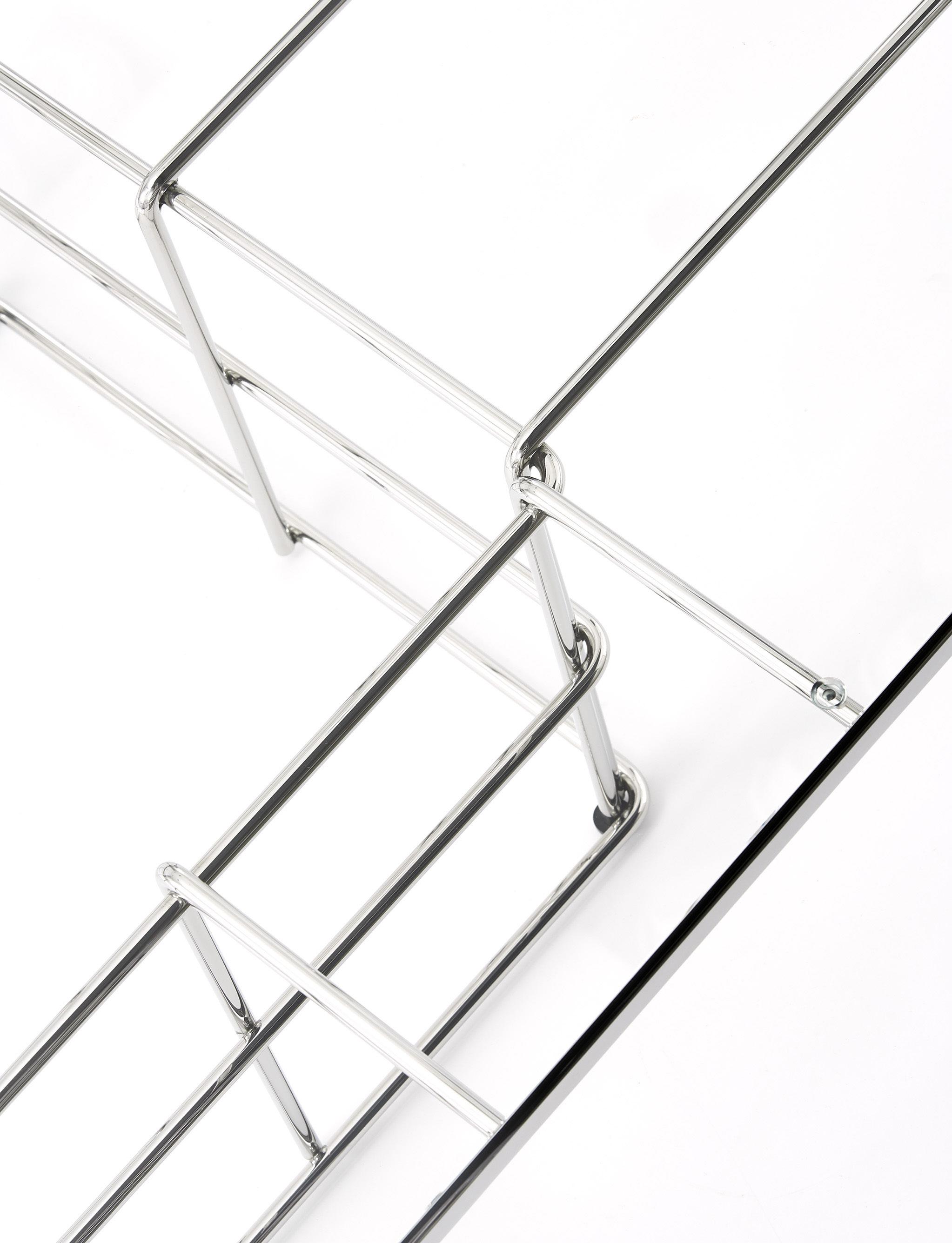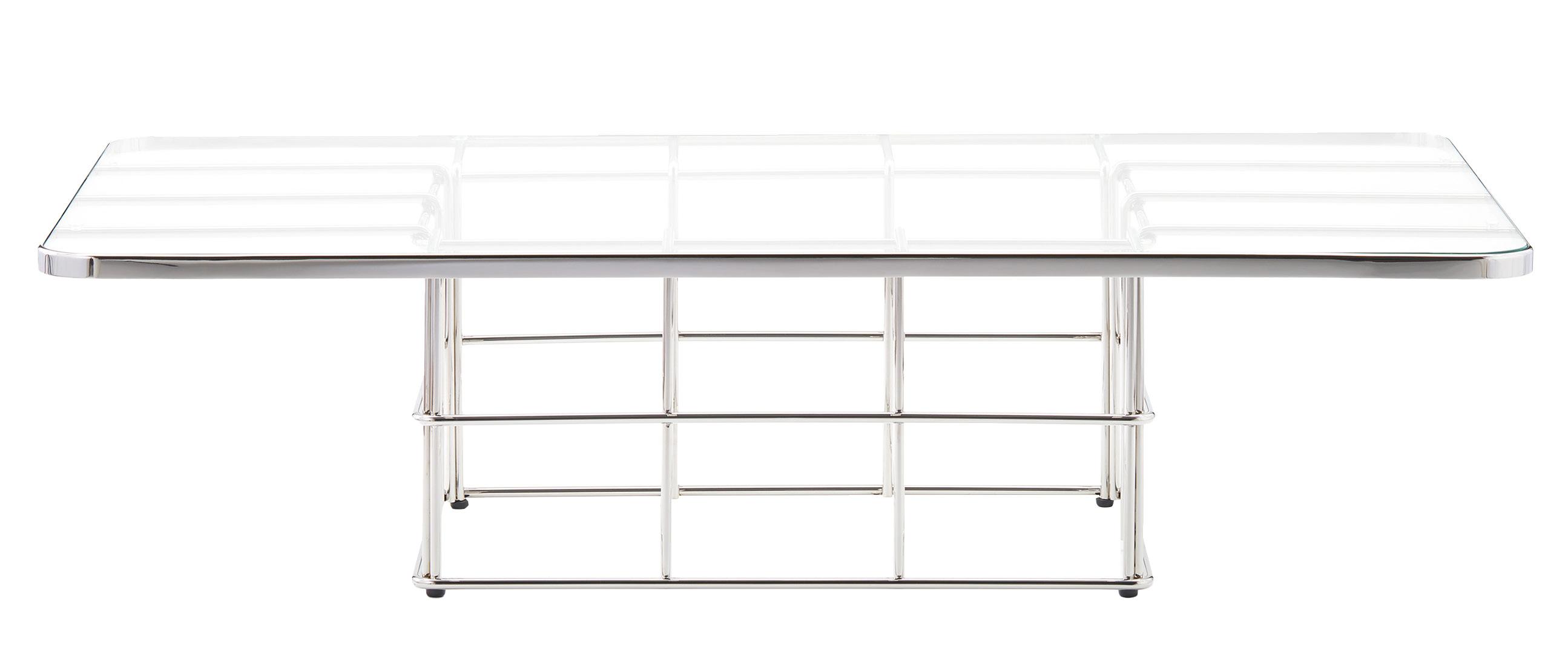 Part of the Cubist Collection, the Cross Bar Table’s irregularly shaped top follows the theme of the collection of distorting the traditional and creating new forms. Smoke glass base with metal frame.