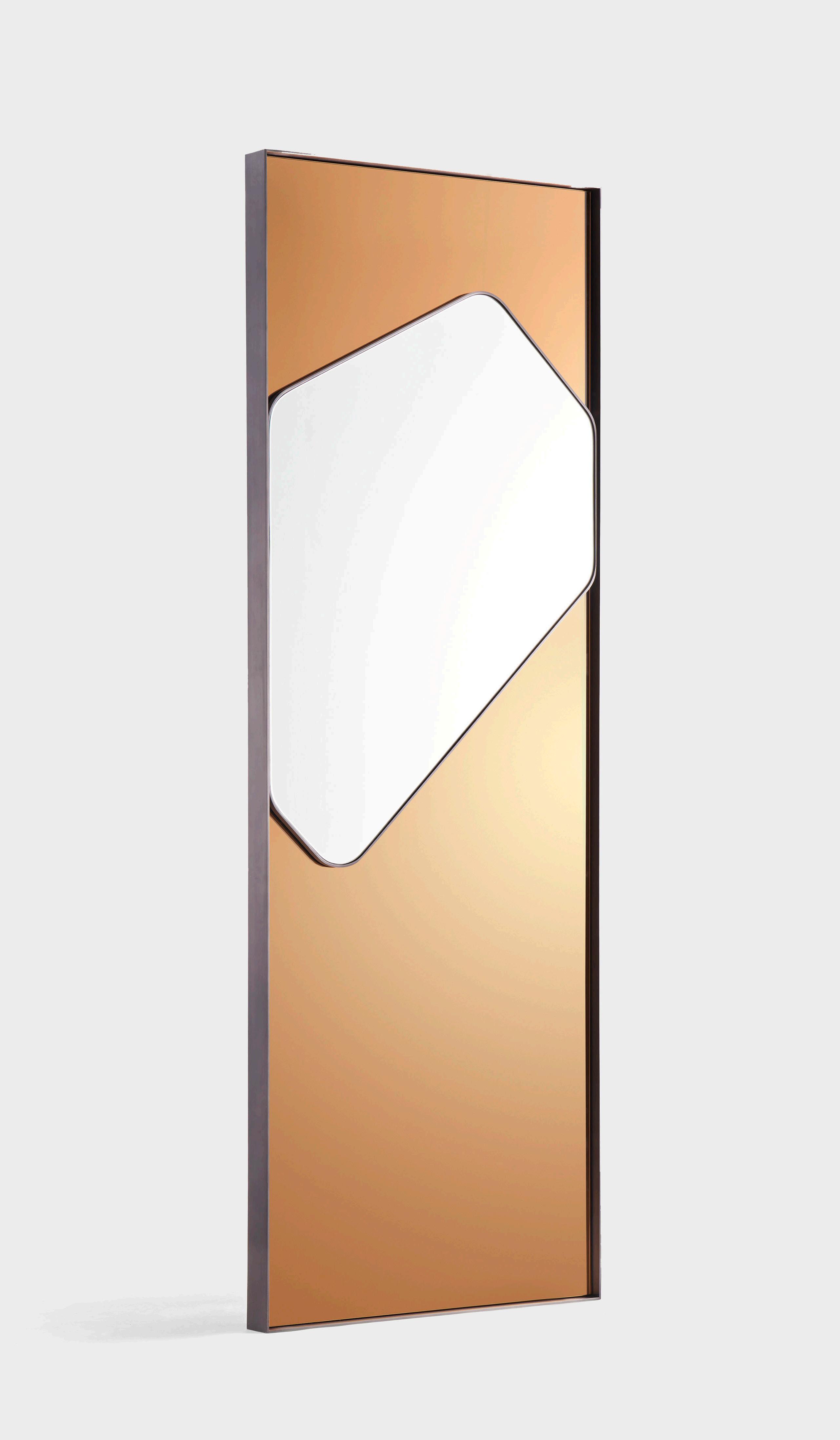 Envisioned as an egg (ovo from Latin ōvum), the clear portion of the mirror represents the yolk and its definitive shape gives each mirror its name. Integrating different shapes and colored surfaces, each mirror creates a powerful impression by reflecting playful light in a dynamic way that captures a focused view in the clear glass and echos subtle movements dancing in the background of the peripheral colored glass which creates a sensation that the surrounding space is alive and breathing.