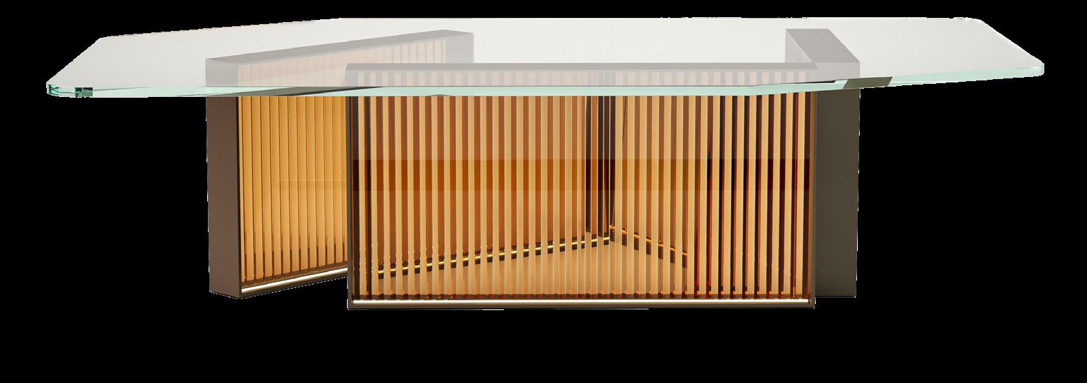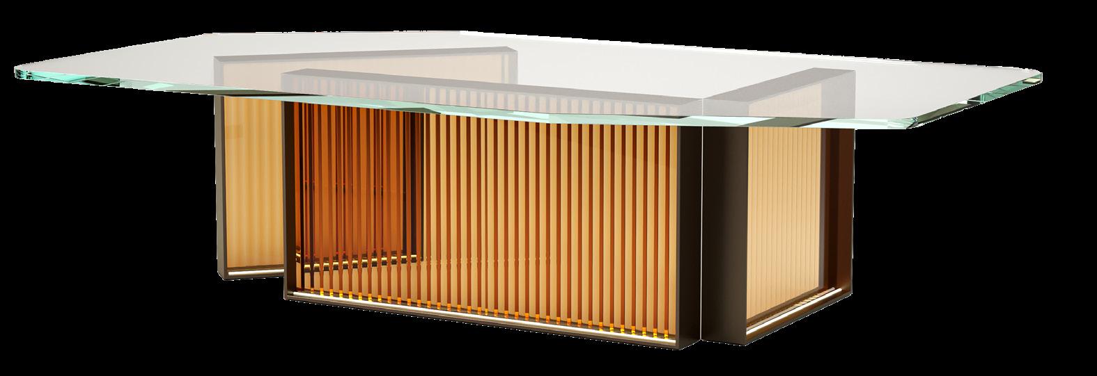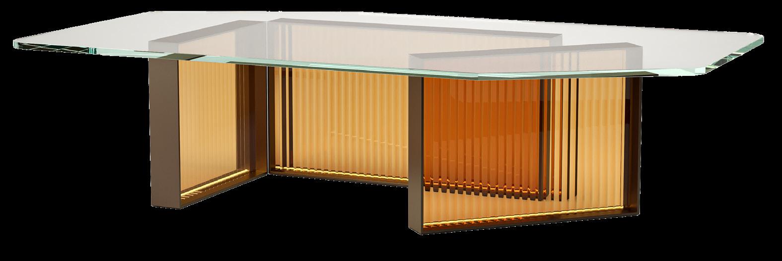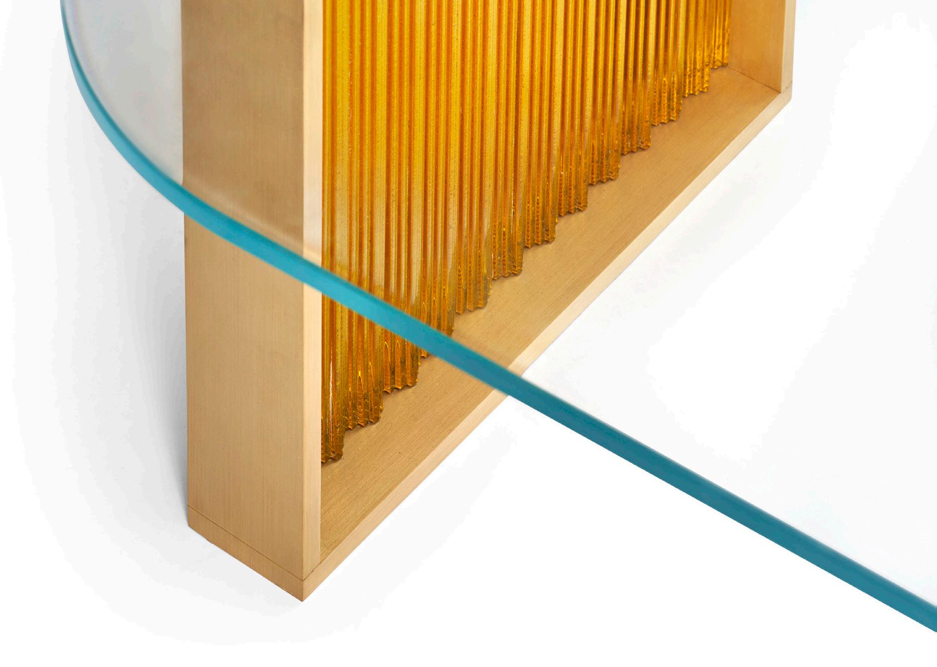 The Aurora Table is a compelling statement piece that commands attention. Designed with a tempered glass top that rests softly on two sturdy bronze and cast glass legs, the table captures light and emits a soft, natural glow which complements a wide variety of interior styles.