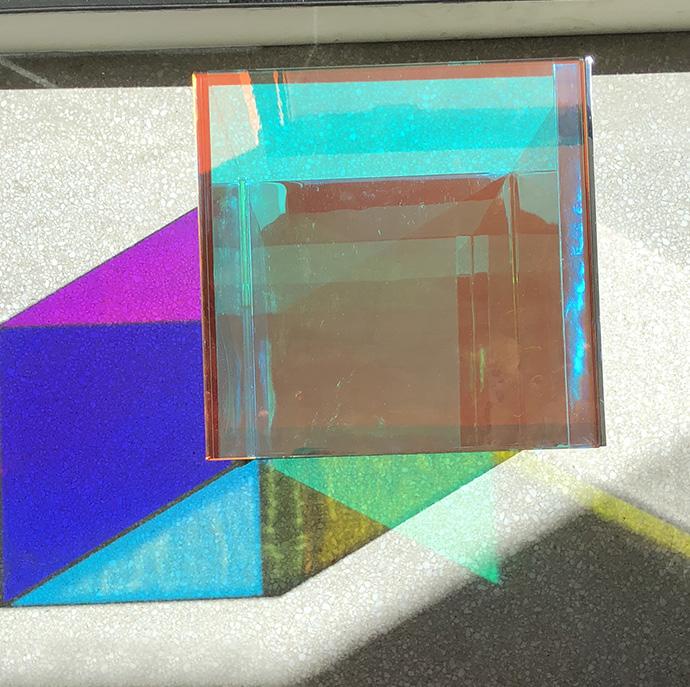 The award-winning Dichroic Table is an active statement piece that evolved from Lauren’s fascination with early Light and Space artists. As natural light changes throughout the day, the surfaces of the table dramatically shift color, reflecting and refracting colored shadows that create a dialogue with its surrounding environment.