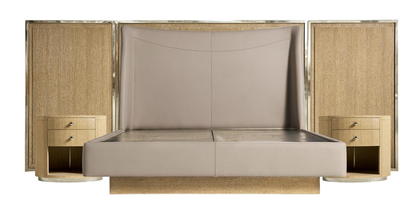 Inspired by nature and the serenity of the changing seasons, the Aspen Bed offers a cozy nest constructed of a wood base with a leather frame and features an elegantly curved headboard to promote the idea of a safe enclosure. The optional decorative headboard cased in metal adds a dramatic statement of luxury and accentuates the idea of a safe and serene slumber. Headboard sold separately.