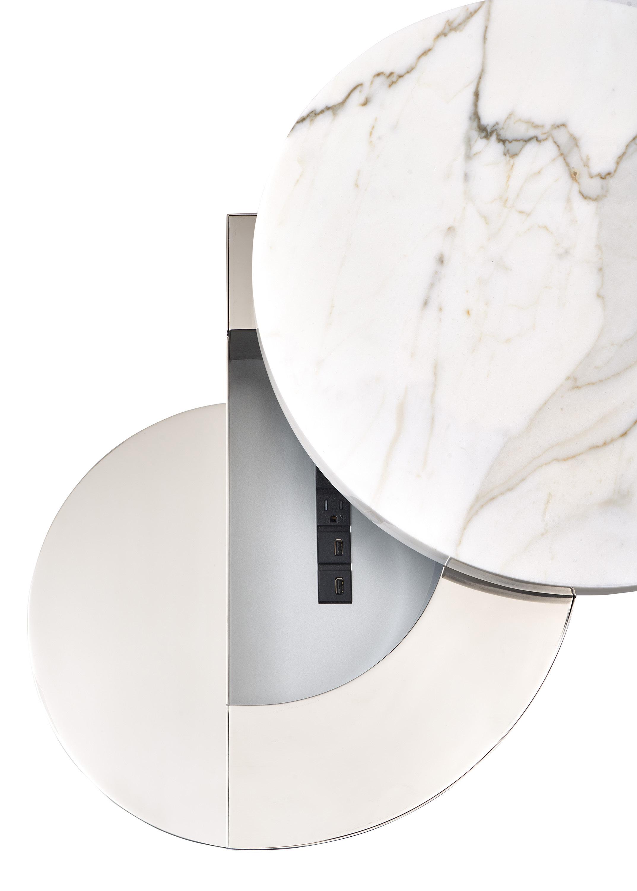 The Powerful C Table features a metal base with a stone top that swivels open to reveal access to hidden power outlets. With a design that is as elegant as it is functional, the Powerful C Table can stand alone as a cocktail table or it can be pulled up to create an impromptu workstation with the ability to charge multiple devices at once.
