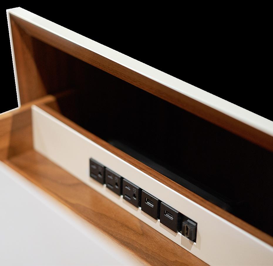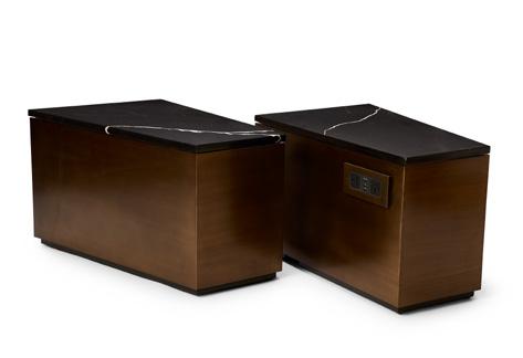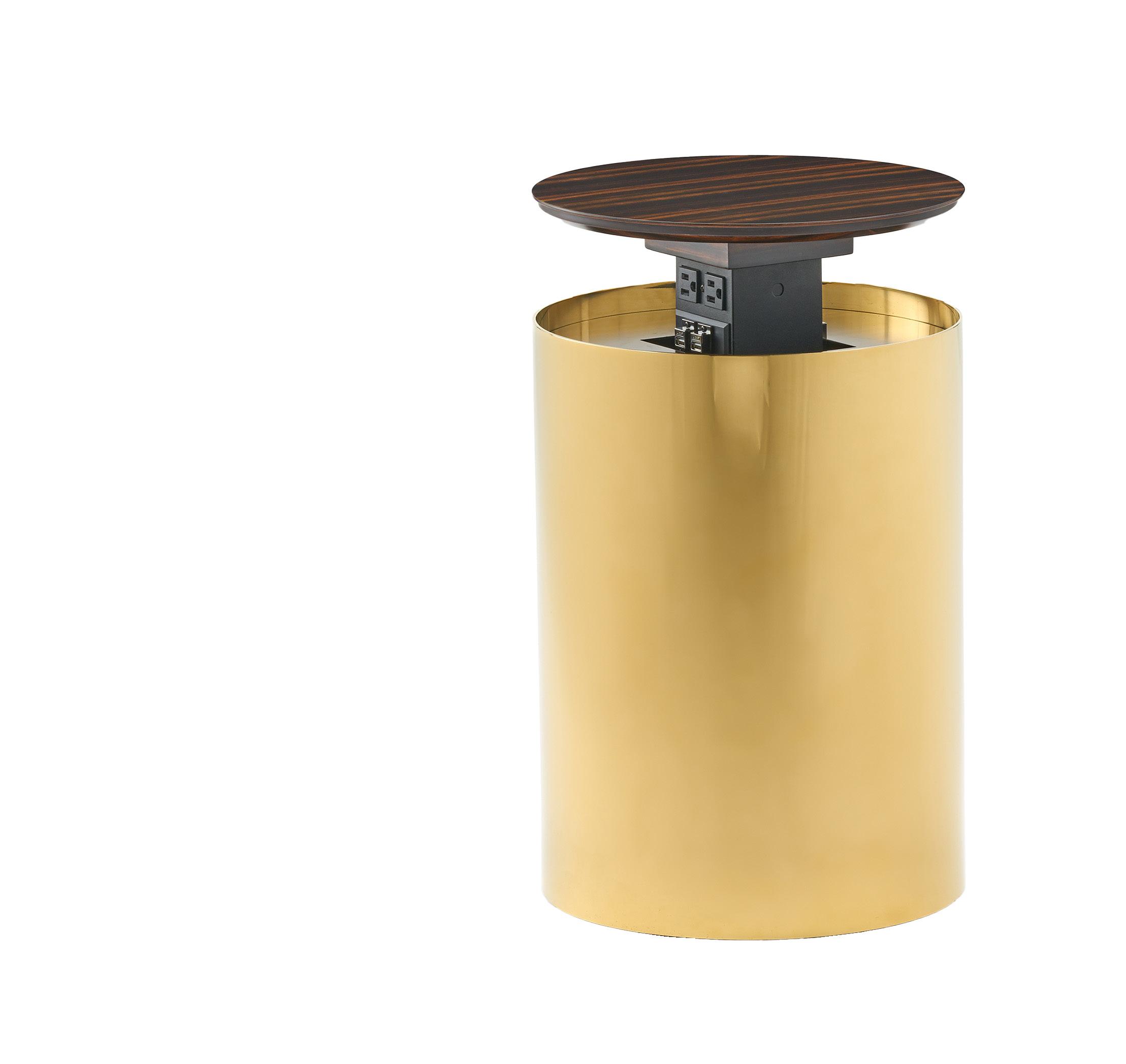 The Powerful Cylinder is constructed of polished brass or stainless steel base and is offered in a variety of quarter-cut wood or stone top finishes that pop up in a fluid vertical motion to reveal a hidden power pocket with multiple three-prong and USB outlets that offer a convenient place to charge multiple devices.