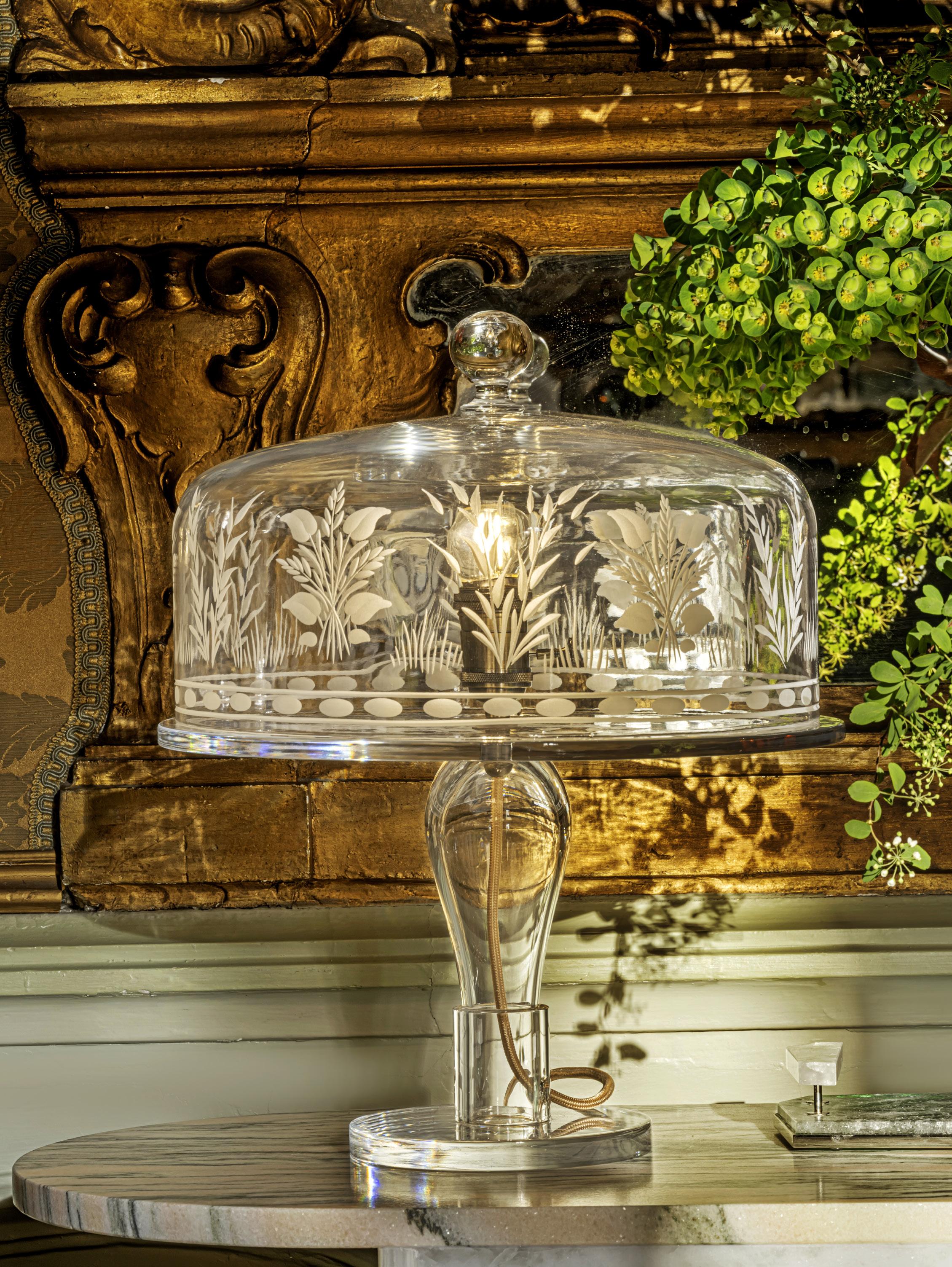 Artful and inspiring, the Cake Lamp is handmade in Italy from hand etched crystal. With a single vertically positioned bulb to cast even light from the center. When illuminated, the top comes to life warming the room with soft light and playful shadows. The functional top is also removable so objects and precious treats can be uniquely displayed on the flat plate within a dome of light.